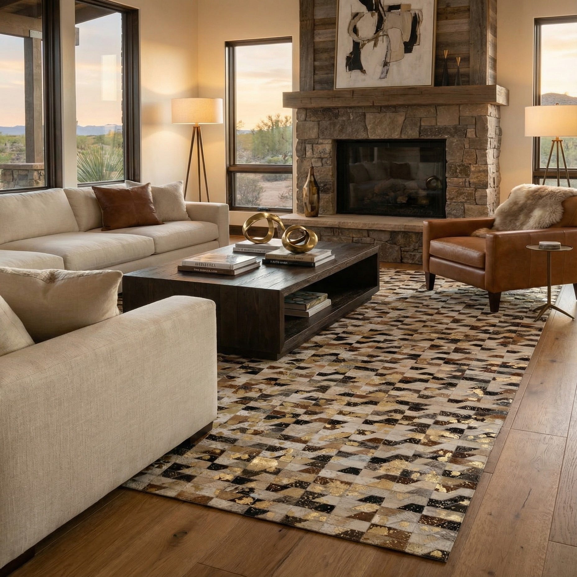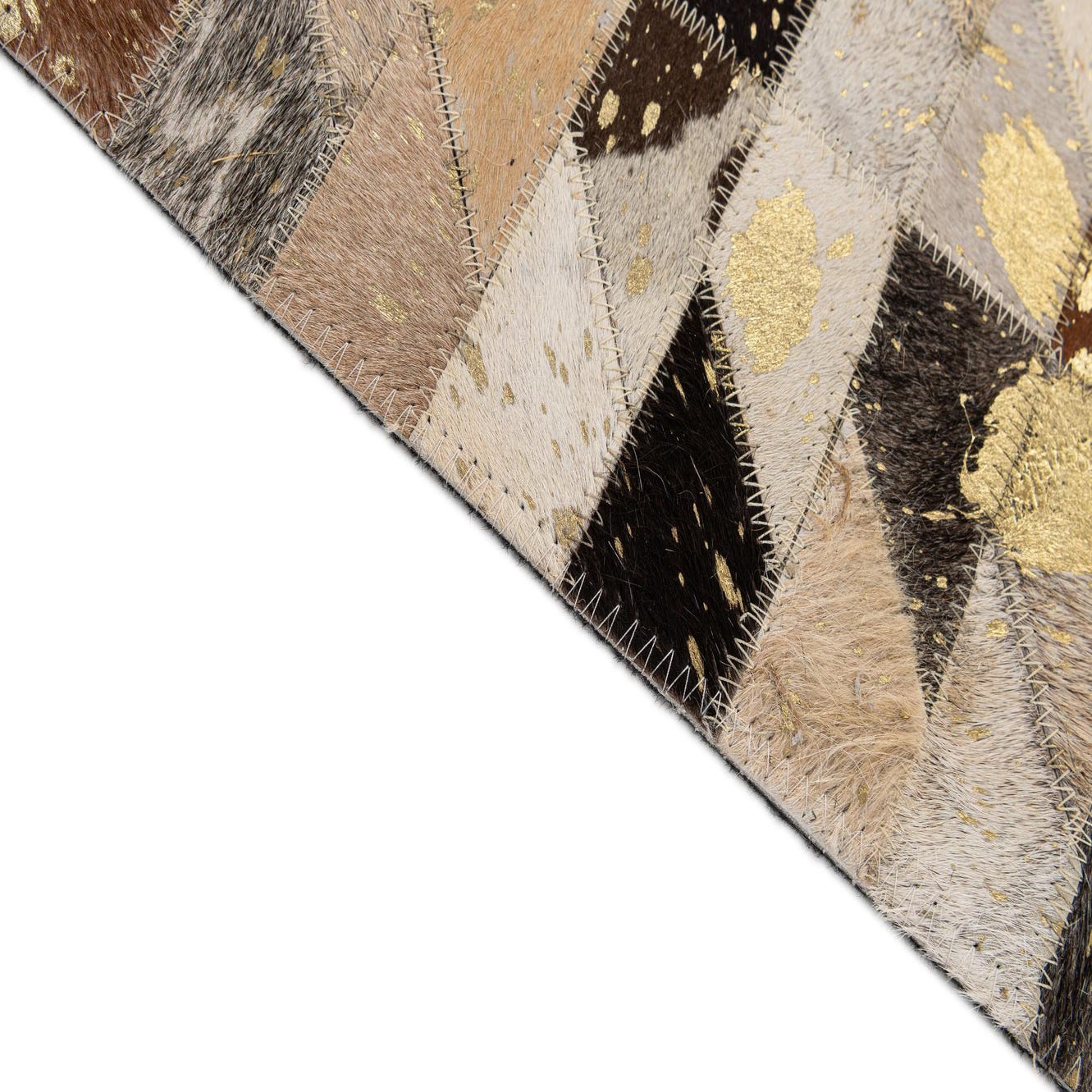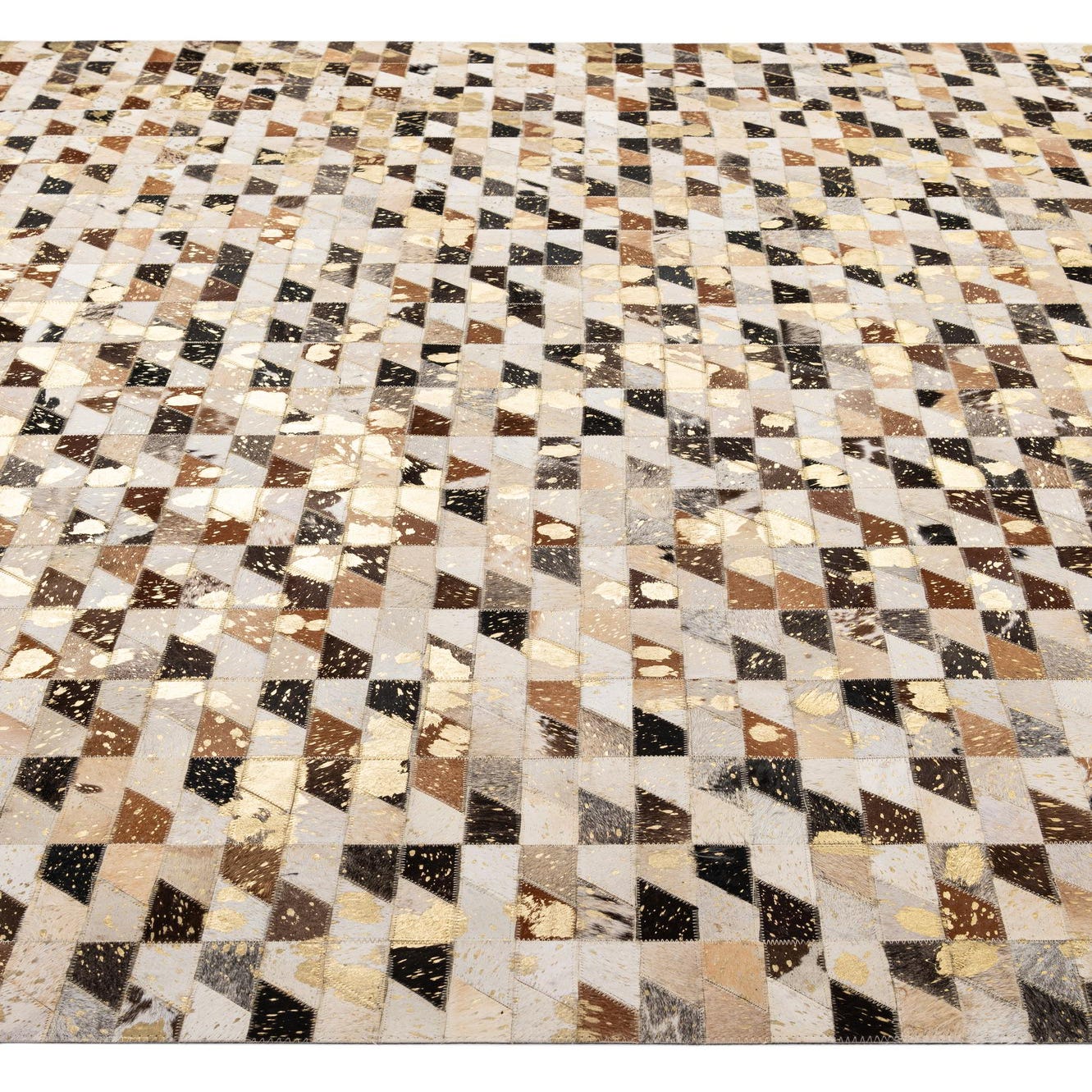 A rectangular 8x10 multi-colored modern cowhide rug featuring a geometric patchwork stripe pattern with gold accents, suitable for a living room.