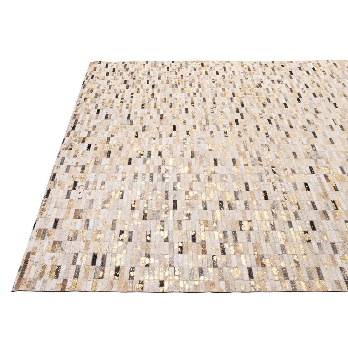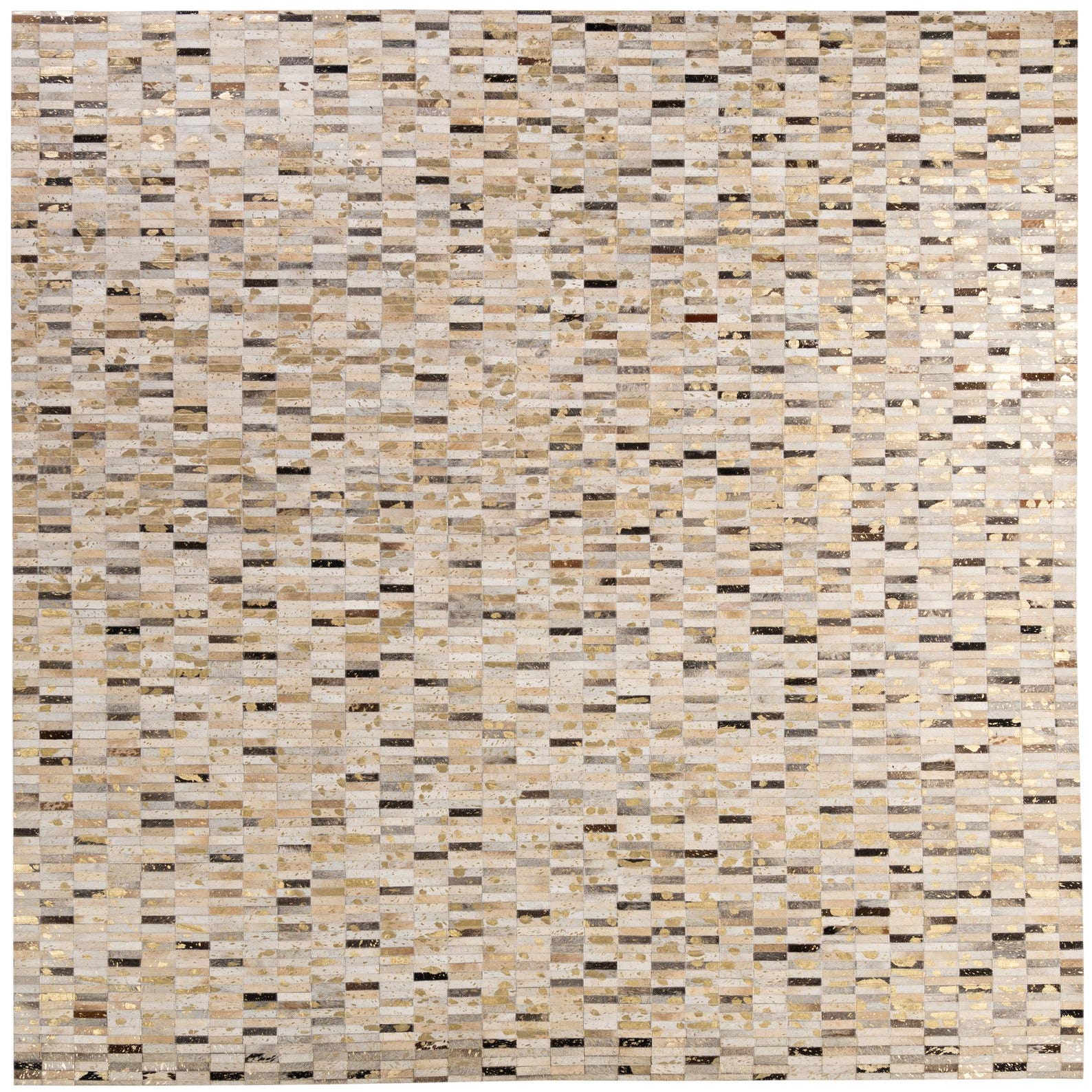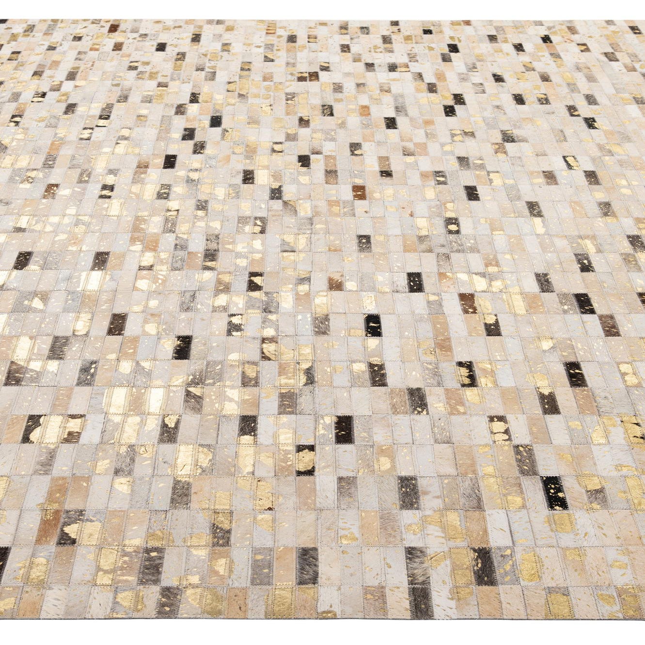 A rectangular 8x10 Cowhide Patchwork rug featuring a modern stripe pattern in multi-colored natural tones with metallic gold accents.
