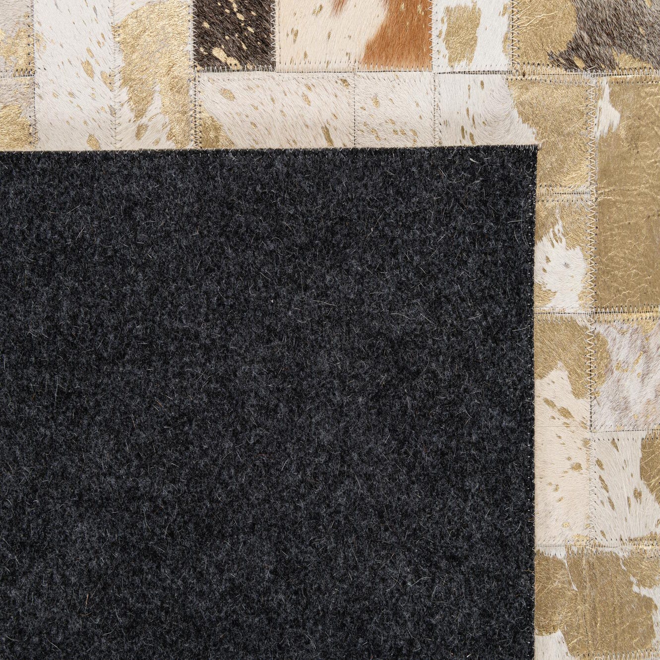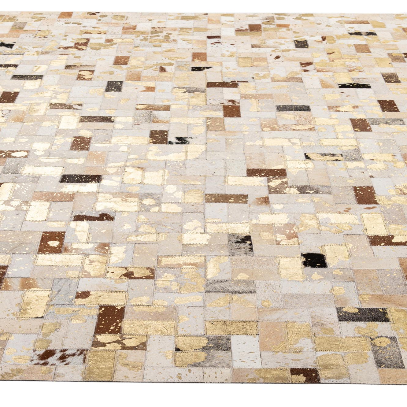 A refined patchwork layout of small rectangular hides creates a mosaic of warm neutrals and bright highlights across this handmade cowhide and leather rug. Soft creams, ivories and light browns form the base, while deeper browns, black flecks and beige patches add visual depth. Scattered gold-leaf accents catch light and introduce a subtle metallic sheen that contrasts with the natural hair-on-hide texture. Running your hand across the surface, you feel the smooth, slightly tactile finish of real cowhide with the raised variation where individual pieces are stitched together.
