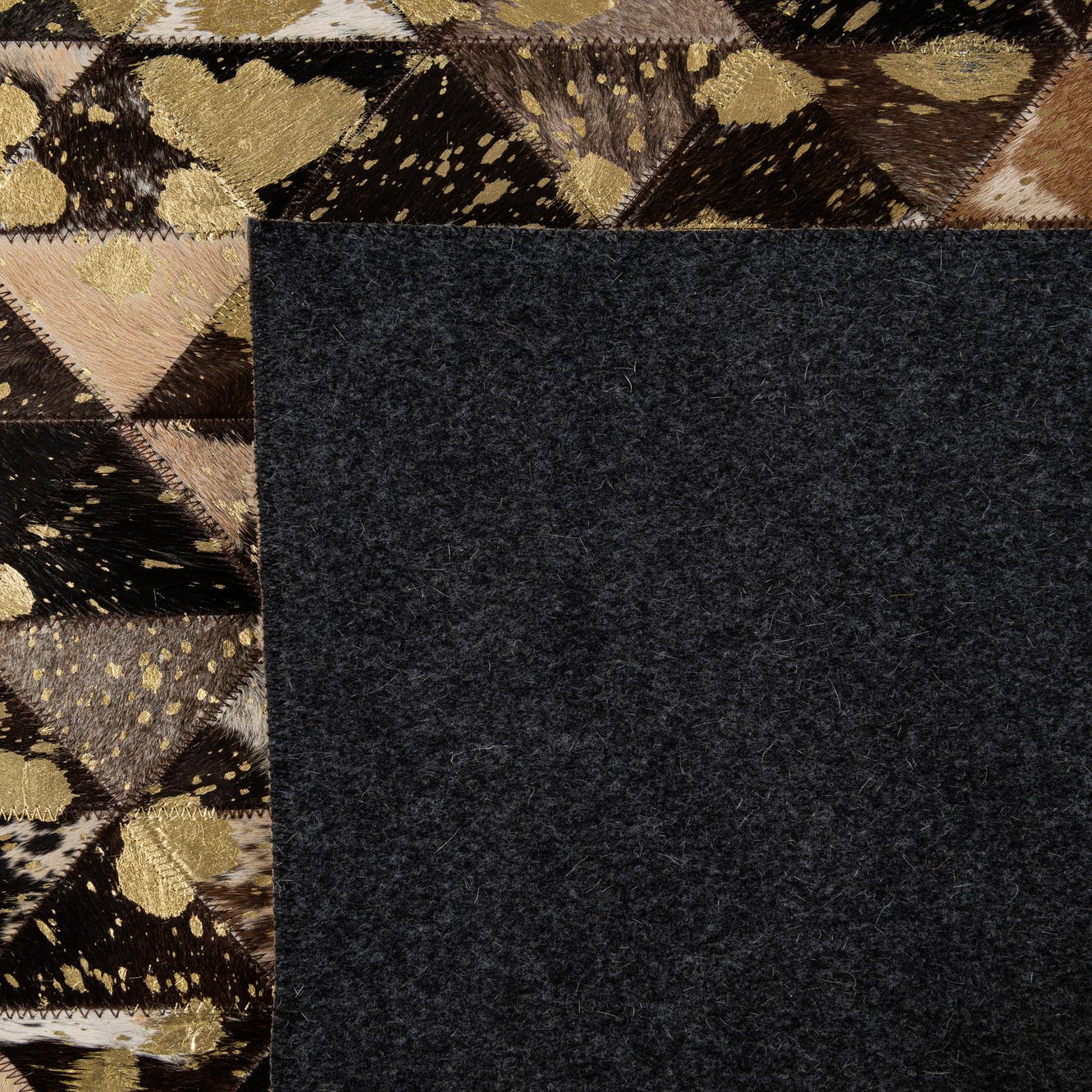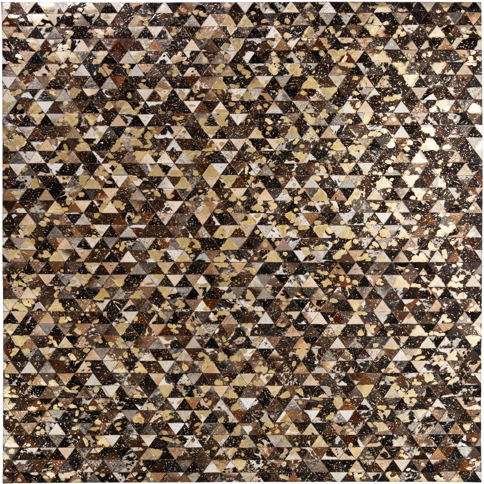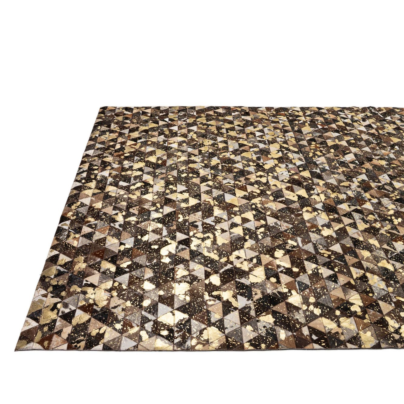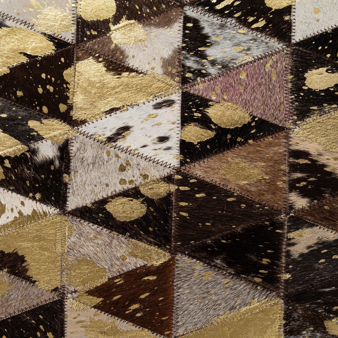 8x10 rectangular modern cowhide rug with a patchwork of multi-colored triangles and gold speckles.