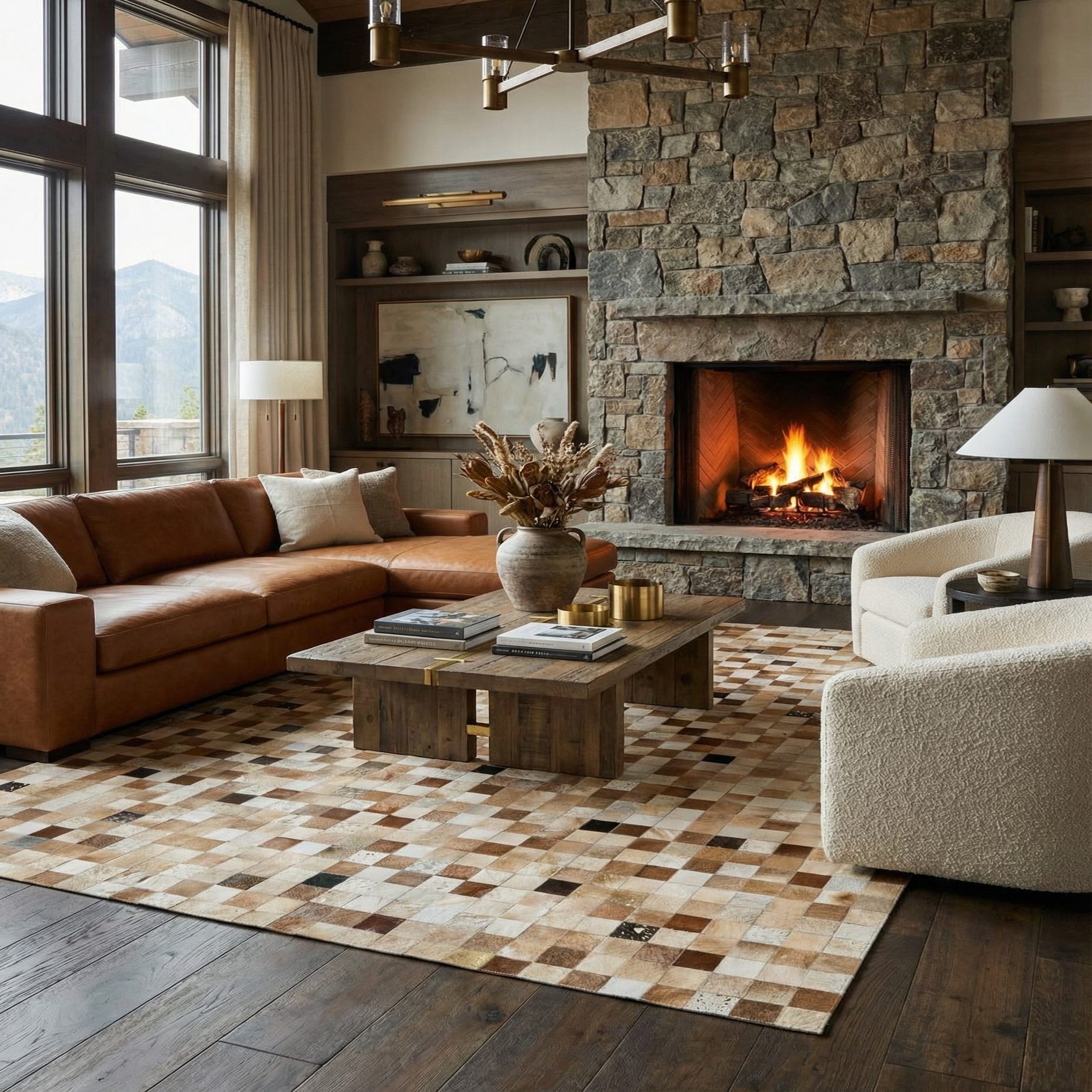 A rectangular 8x10 modern cowhide rug featuring a patchwork of multi-colored squares in various shades of brown, beige, and cream, with some black and metallic gold accents.