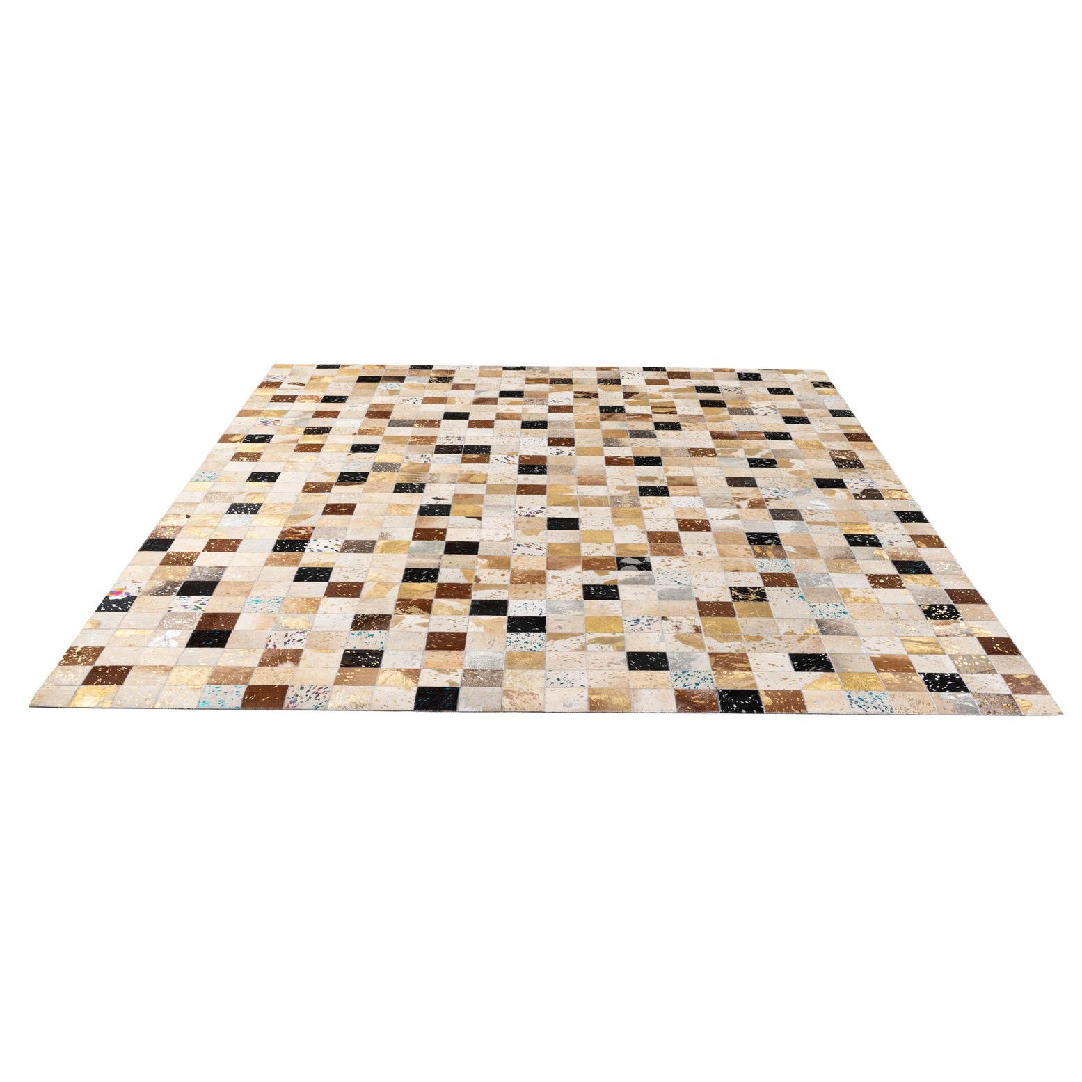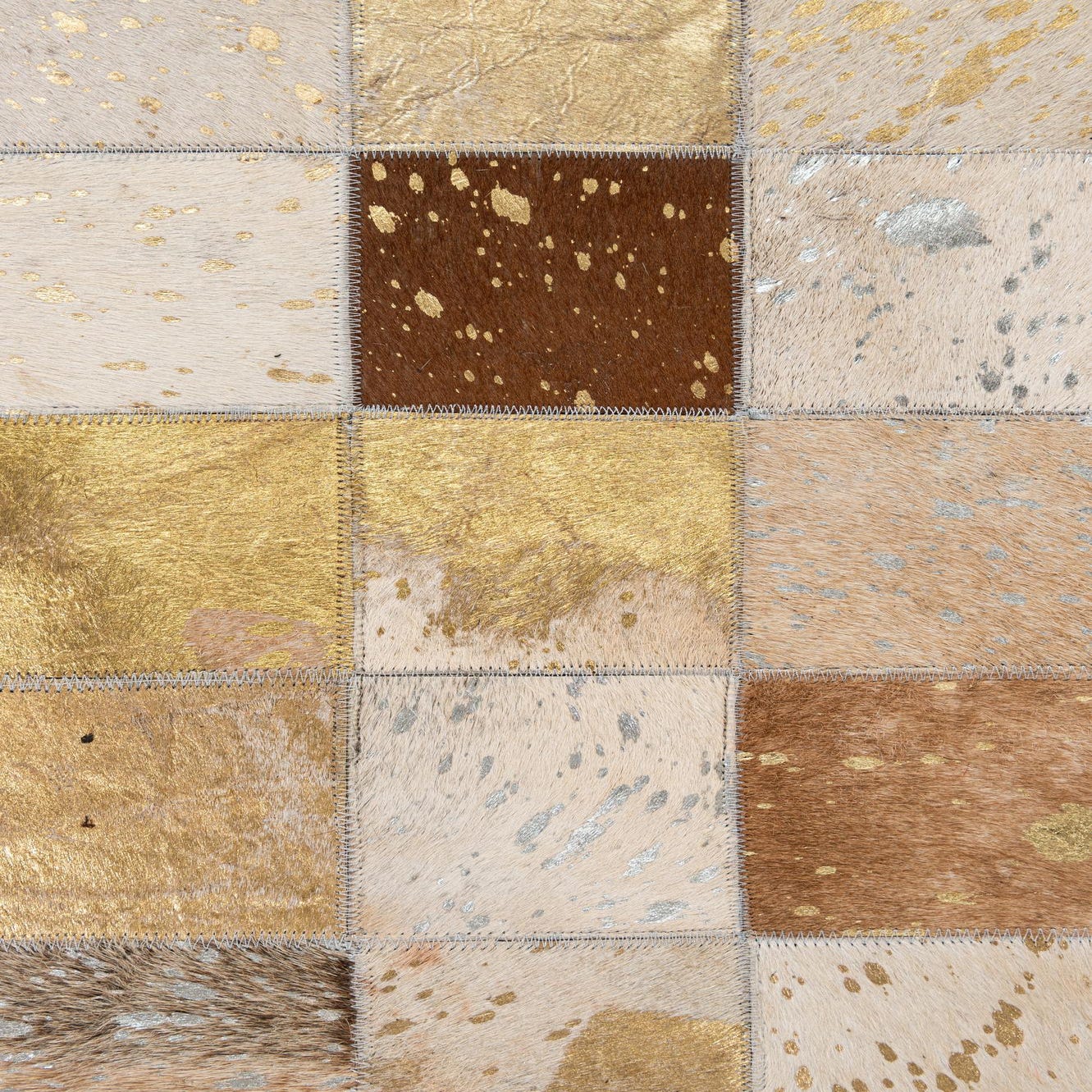 A rectangular 8x10 multi-colored modern cowhide rug with a patchwork design, featuring squares of natural hide, metallic gold, and paint splatters.