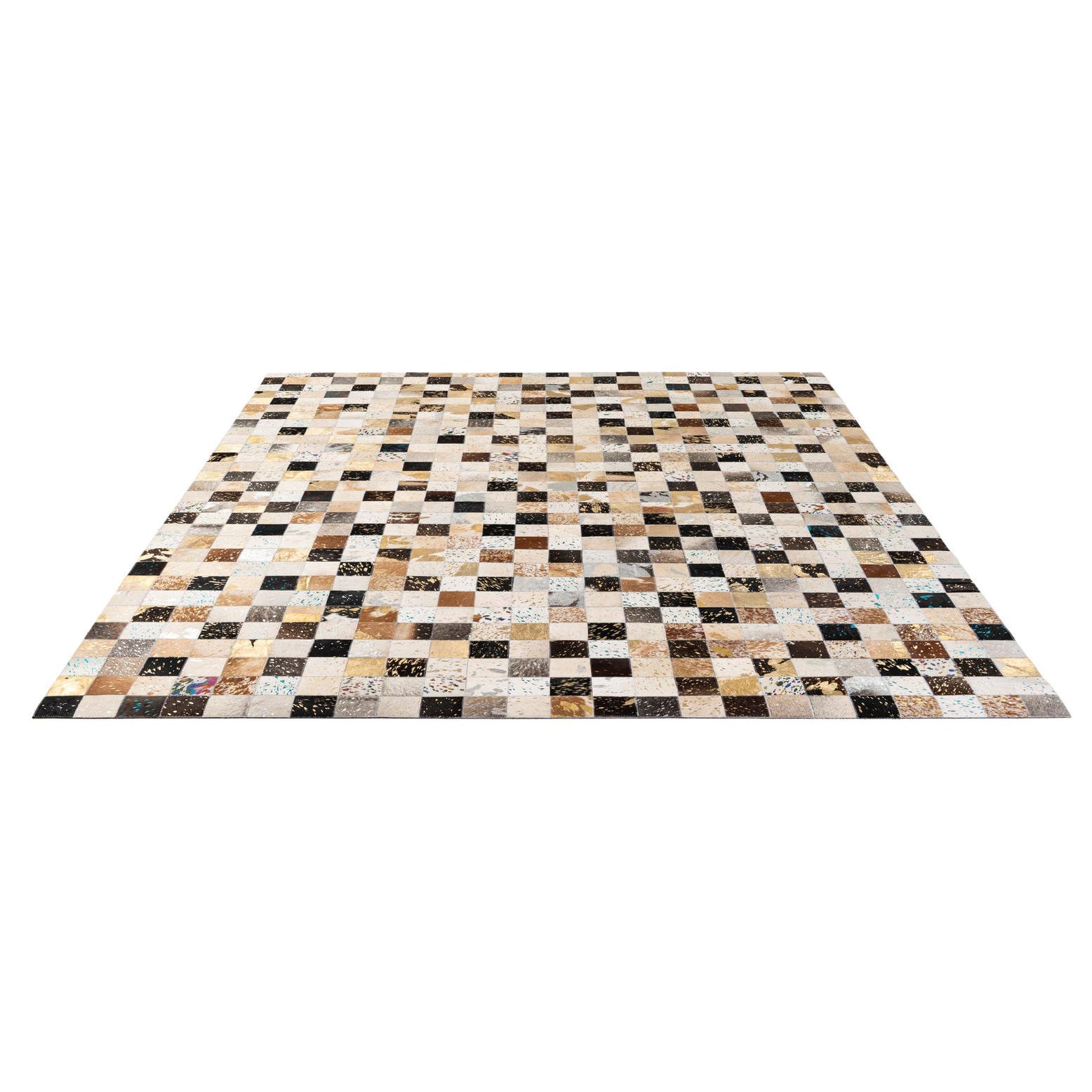 A multi-colored 8x10 rectangular cowhide patchwork rug featuring a modern checkerboard pattern in various natural tones and metallic accents.