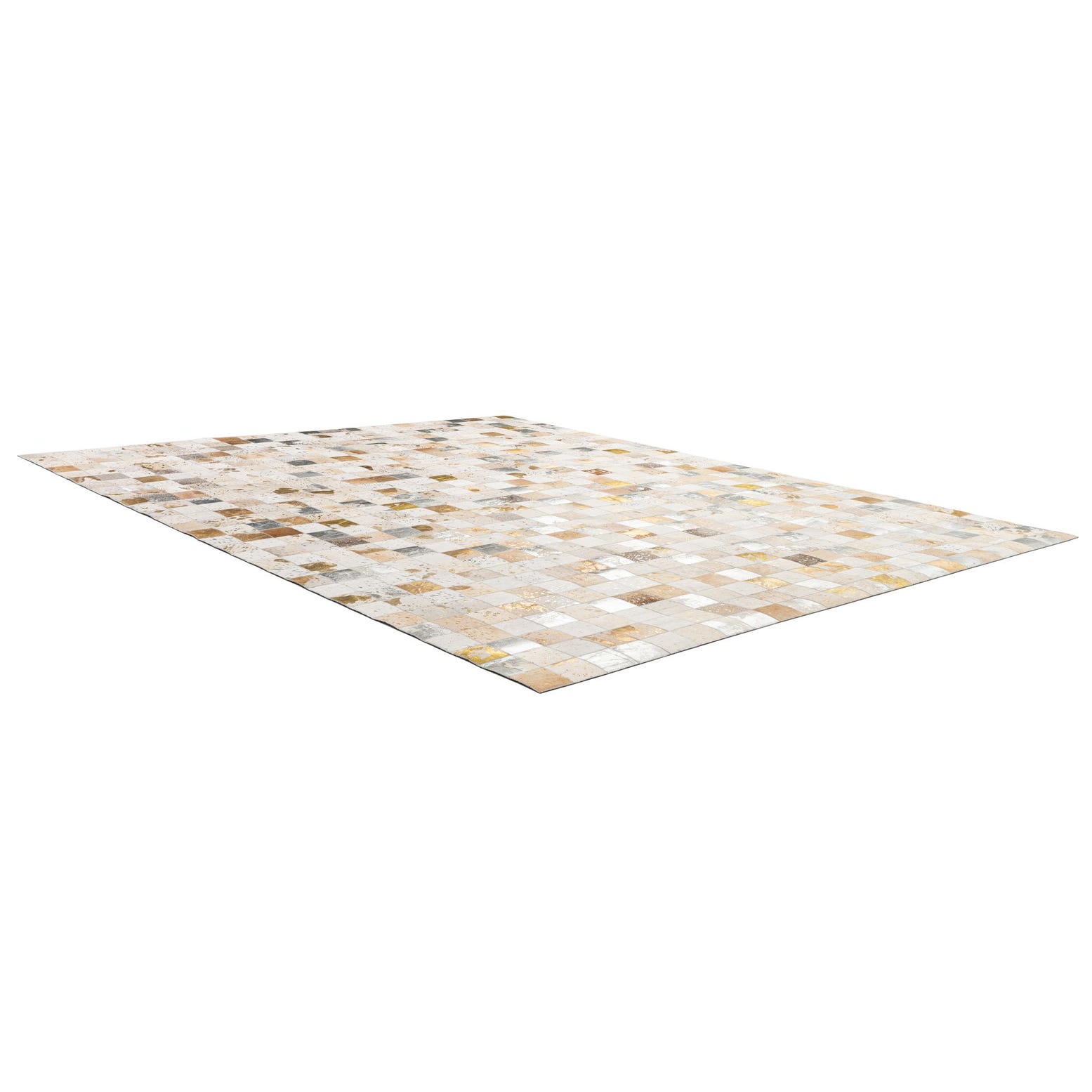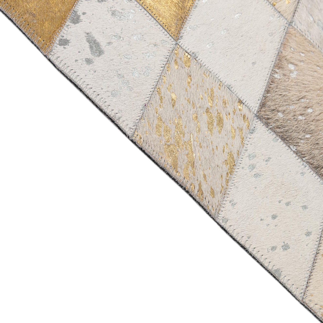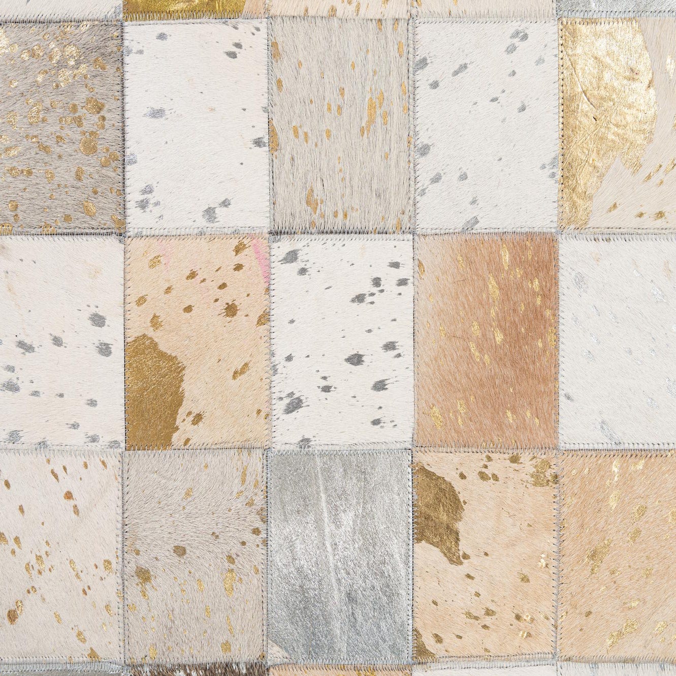 8x10 rectangular modern rug featuring a patchwork of multi-colored cowhide squares with metallic gold and silver accents.