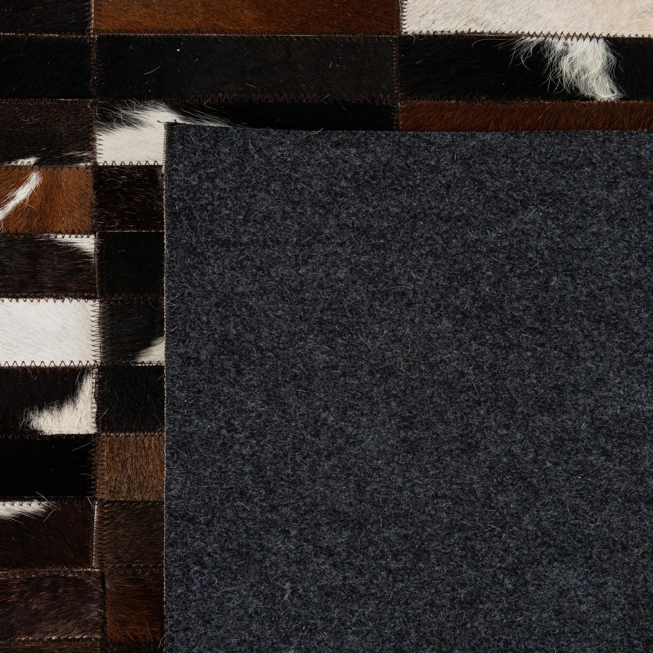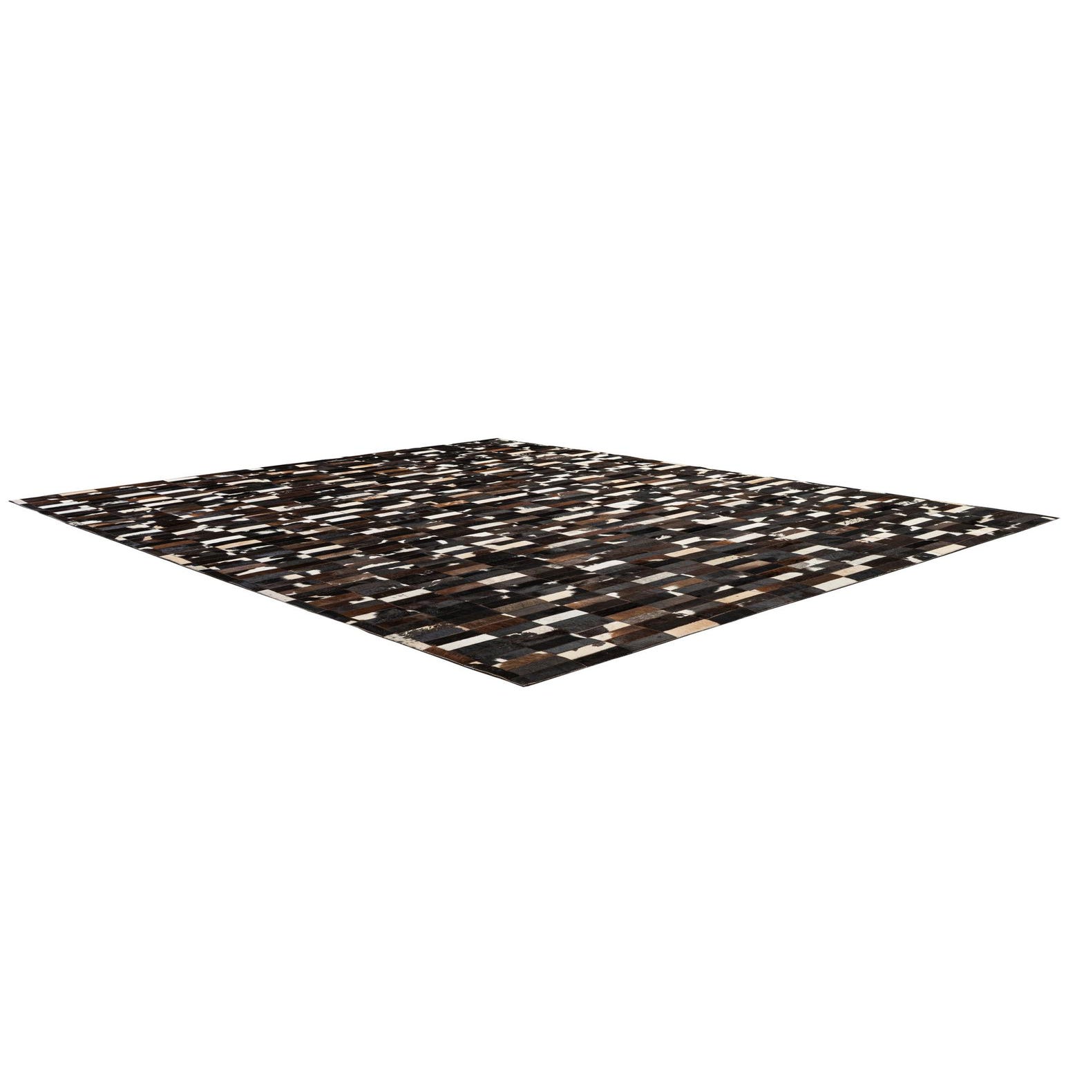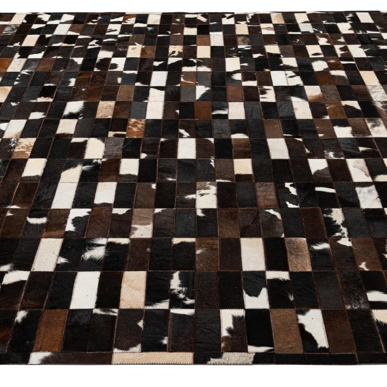 A rectangular 8x10 cowhide patchwork rug featuring a modern pattern of multi-colored brown, black, and white leather squares.