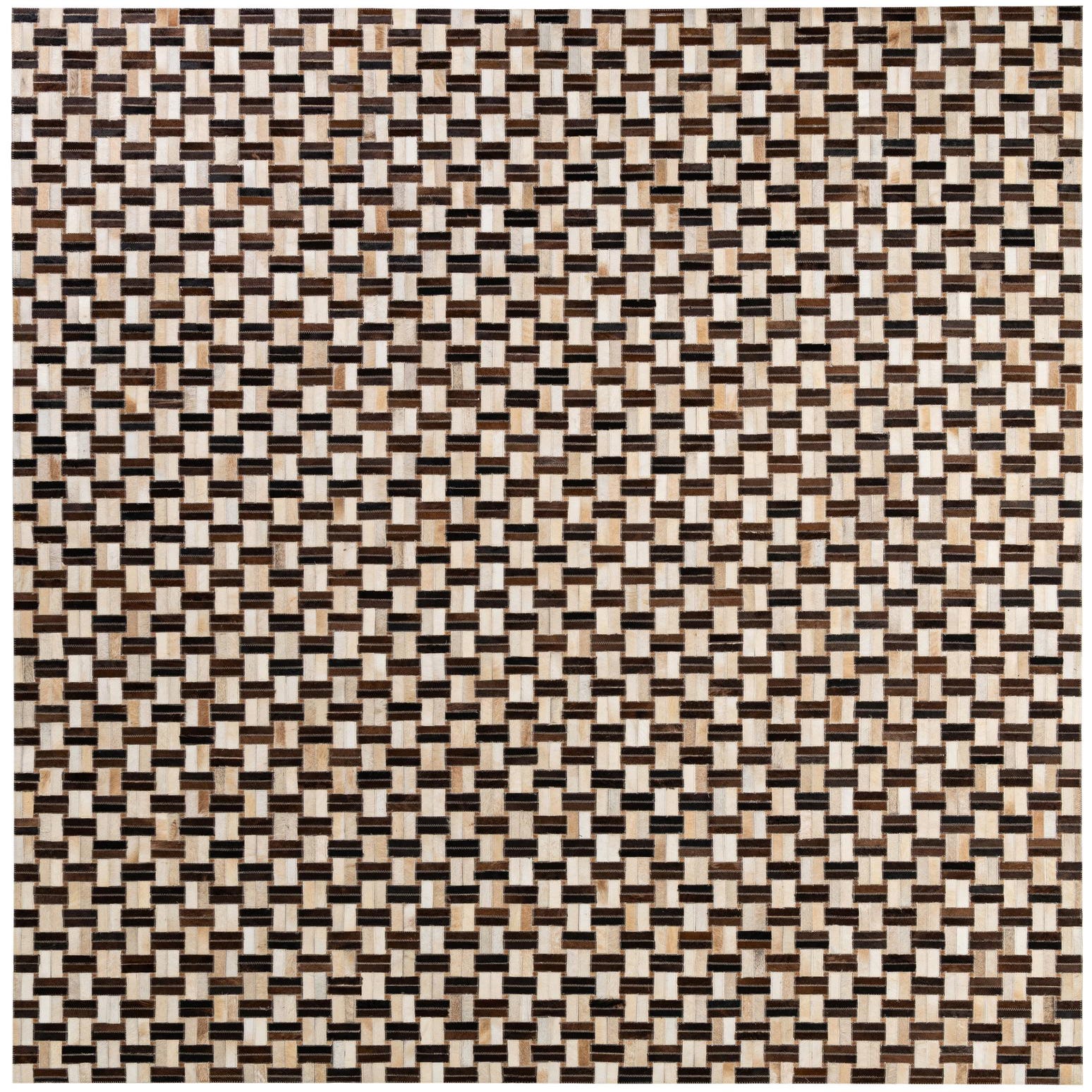 A rectangular 8x10 Cowhide Patchwork rug with a modern geometric pattern in multi-colored natural brown, black, and cream tones.