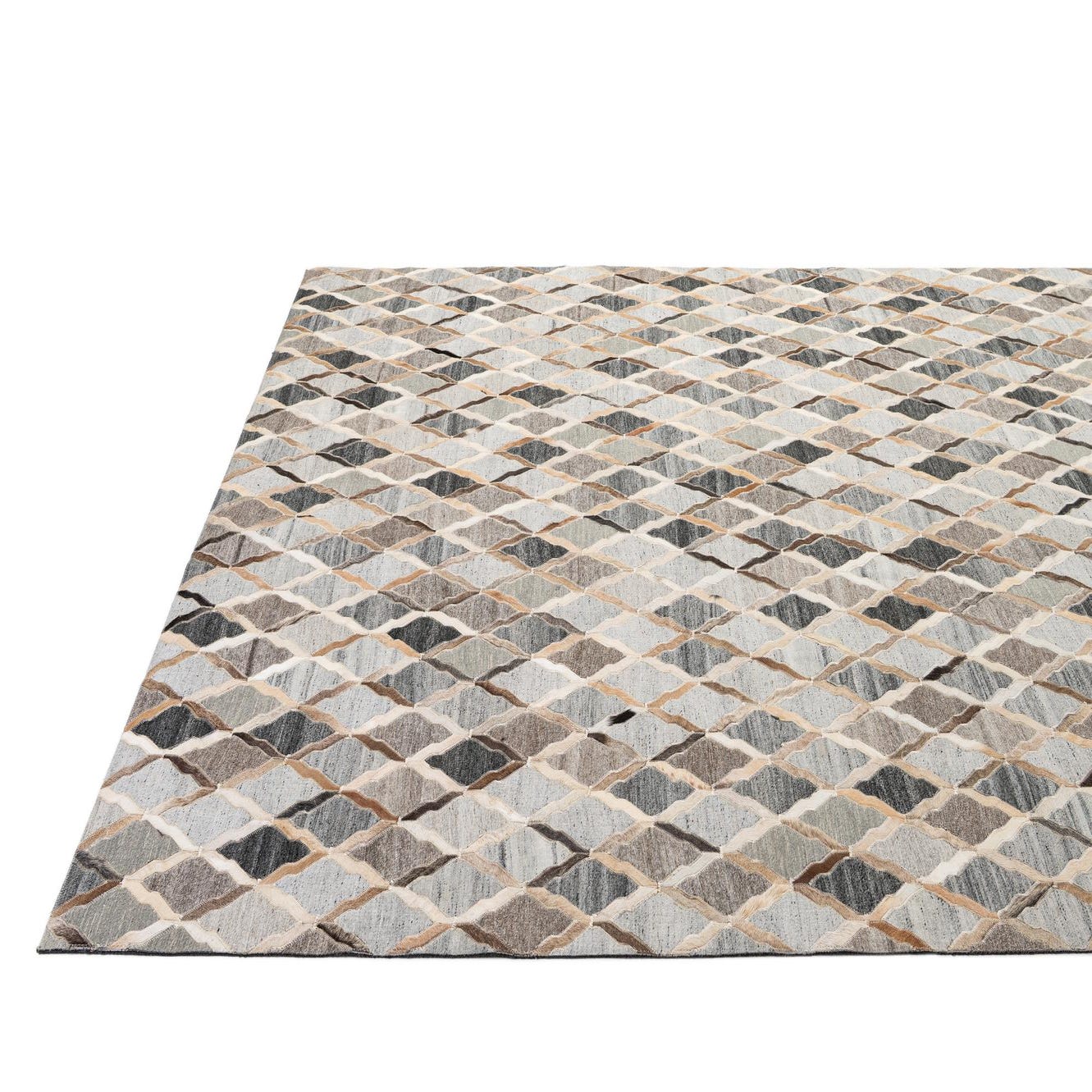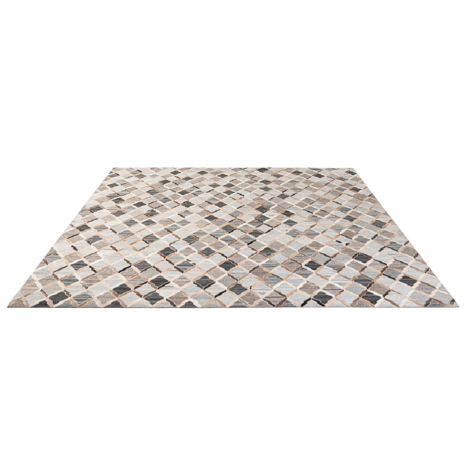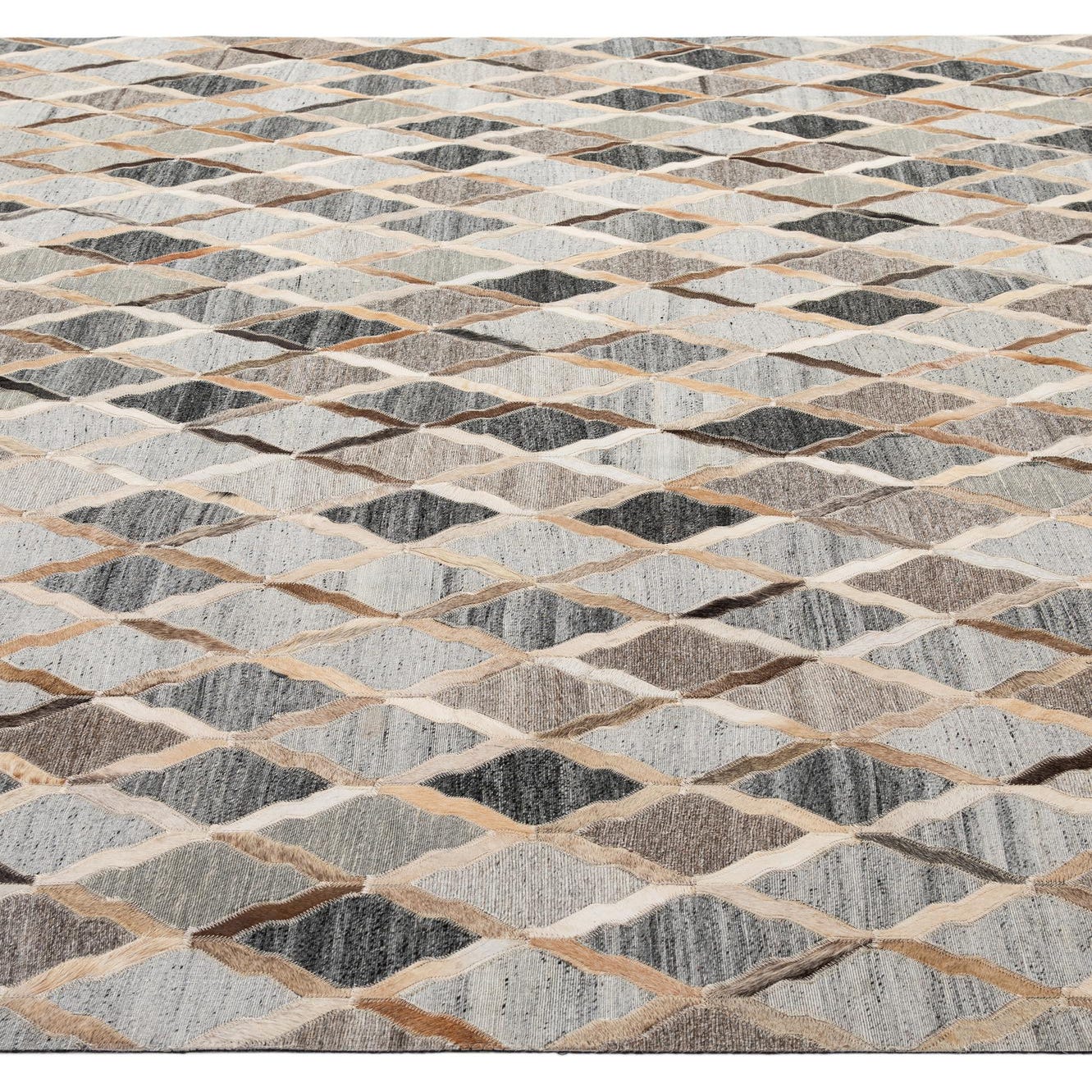 8x10 rectangular Cowhide - Patchwork rug featuring a modern multi-colored geometric pattern in shades of gray, brown, and cream.