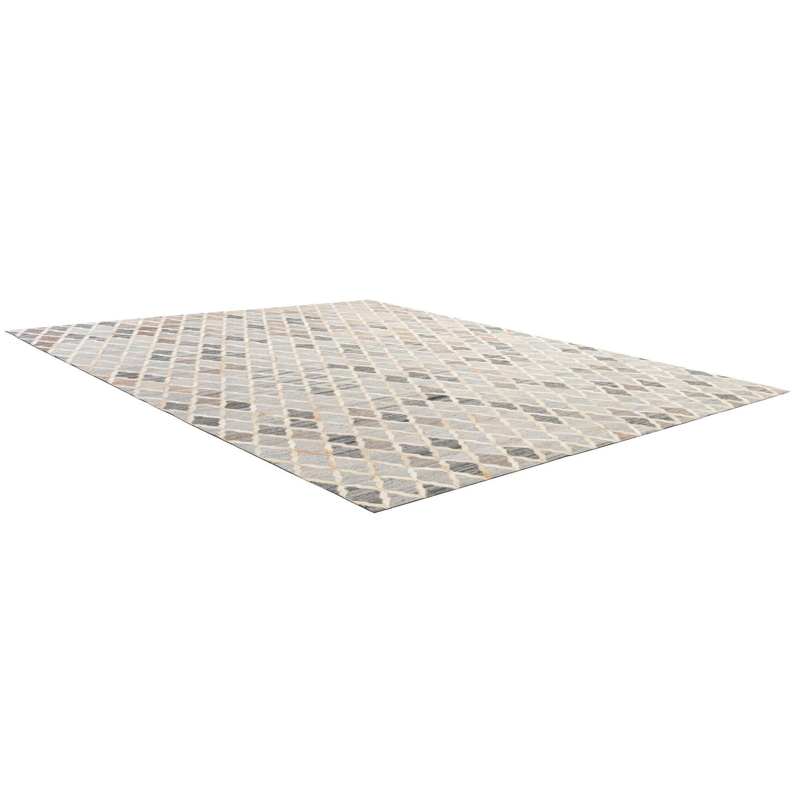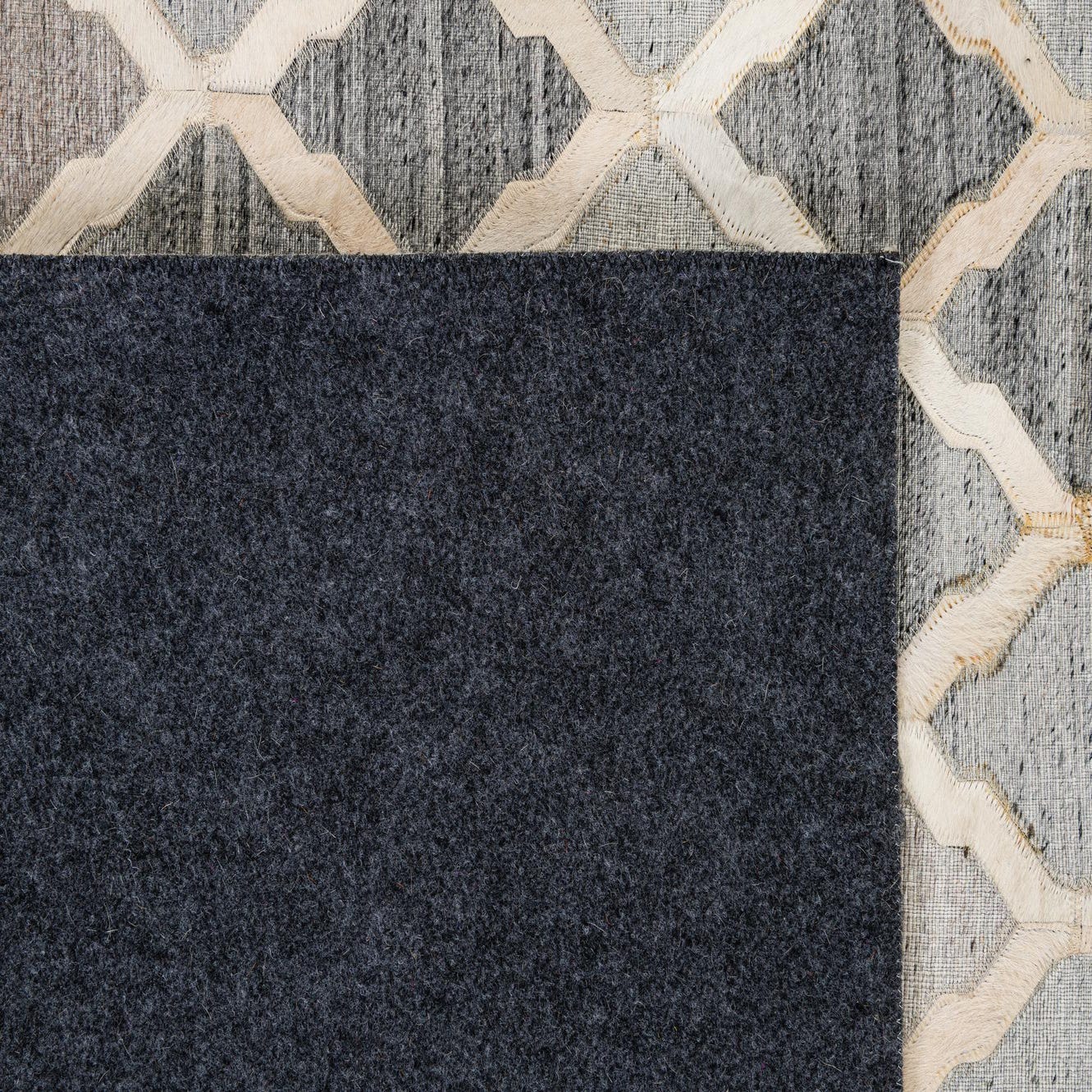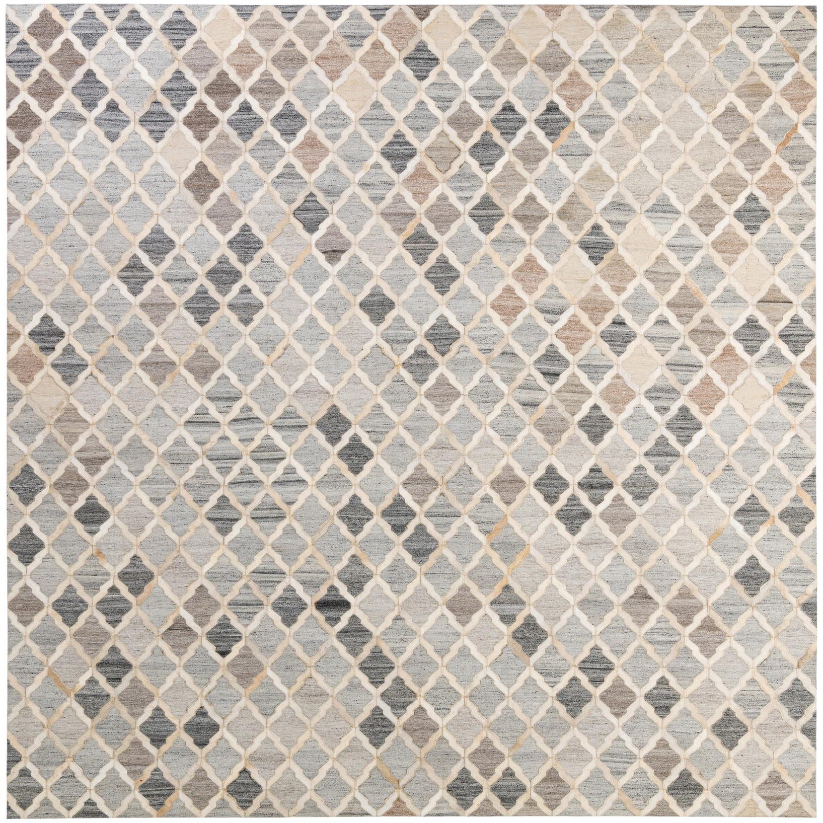 A rectangular 8x10 multi-colored modern cowhide rug with an intricate geometric trellis pattern, suitable for a living room.