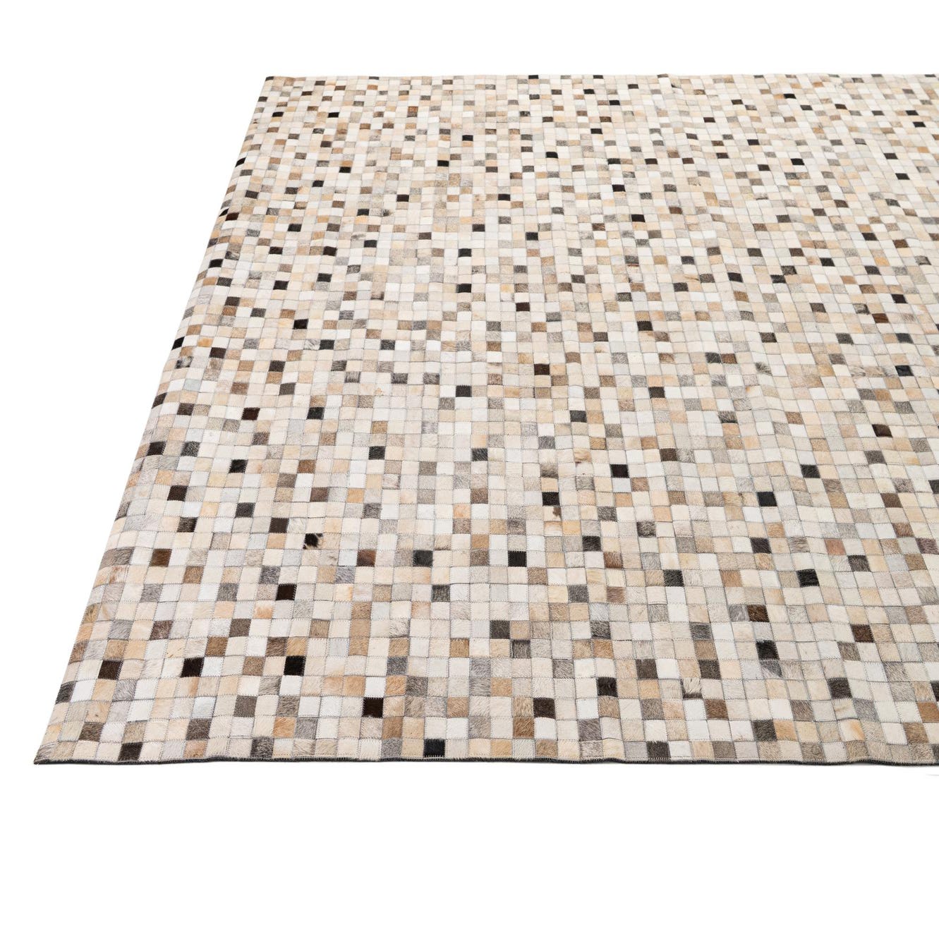 Handmade from cowhide and leather, this patchwork rug is composed of hundreds of small square hides arranged in a tight, mosaic-like pattern. The multi background ties together a calm neutral palette of cream, ivory, light brown, beige with occasional black accents, creating subtle movement across the surface. The hair-on-hide finish has a low, slightly velvety nap and a gentle sheen; each square carries natural tonal and textural variation that is noticeable to the touch.