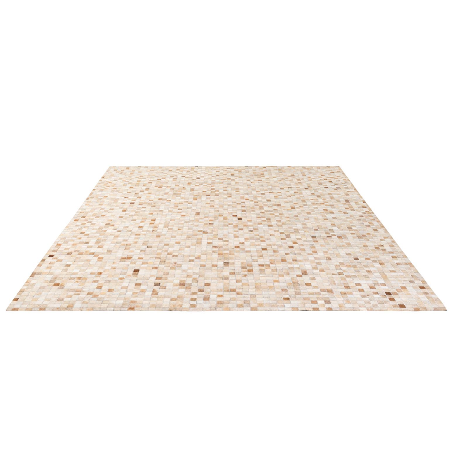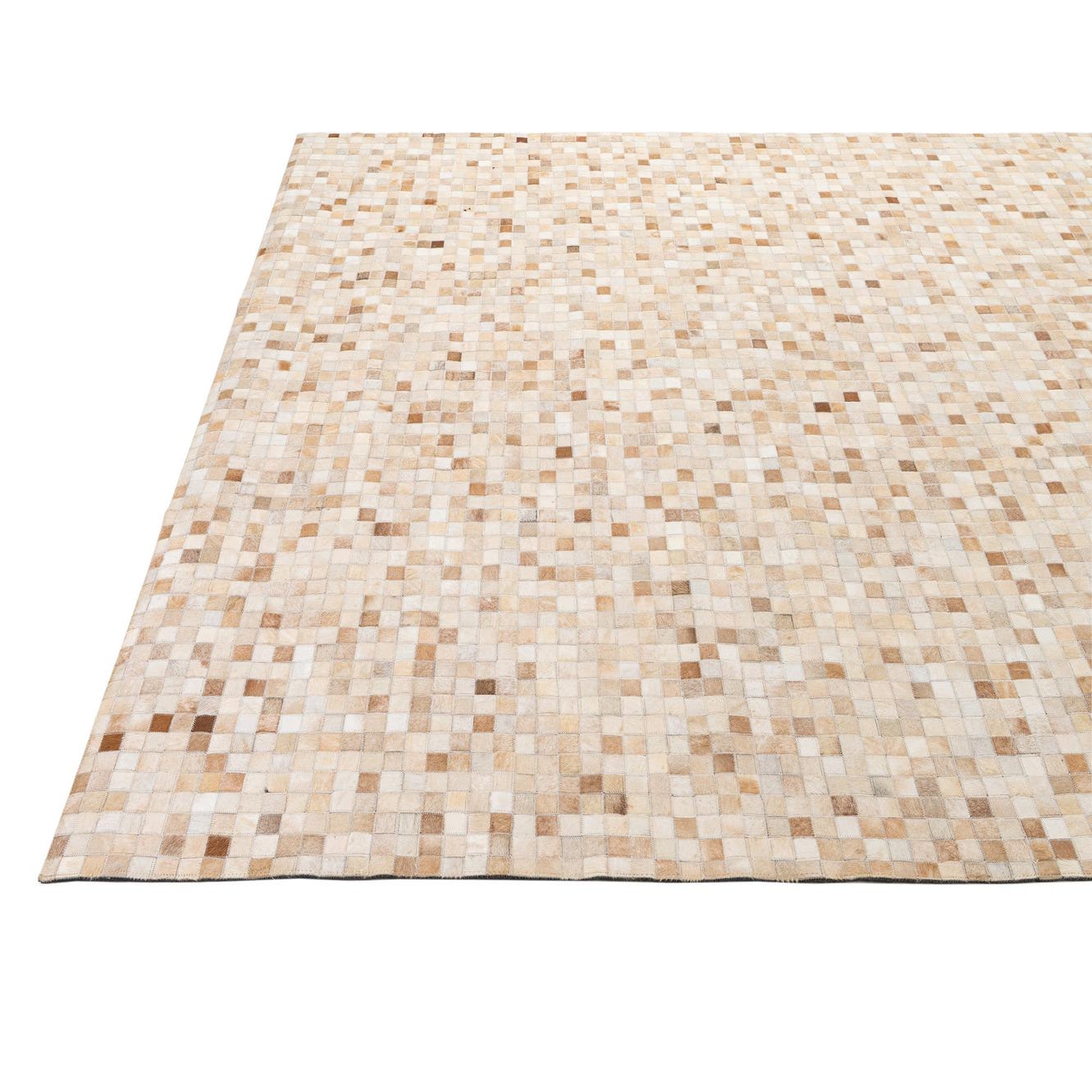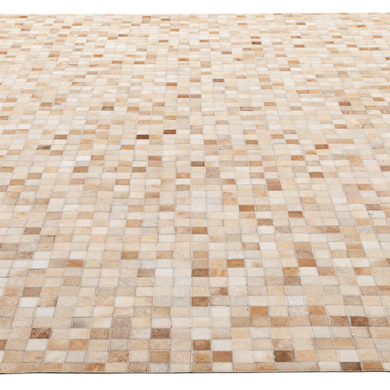 A rectangular 8x10 modern cowhide rug featuring a mosaic patchwork of multi-colored natural hide squares in varying shades of beige, cream, and brown.