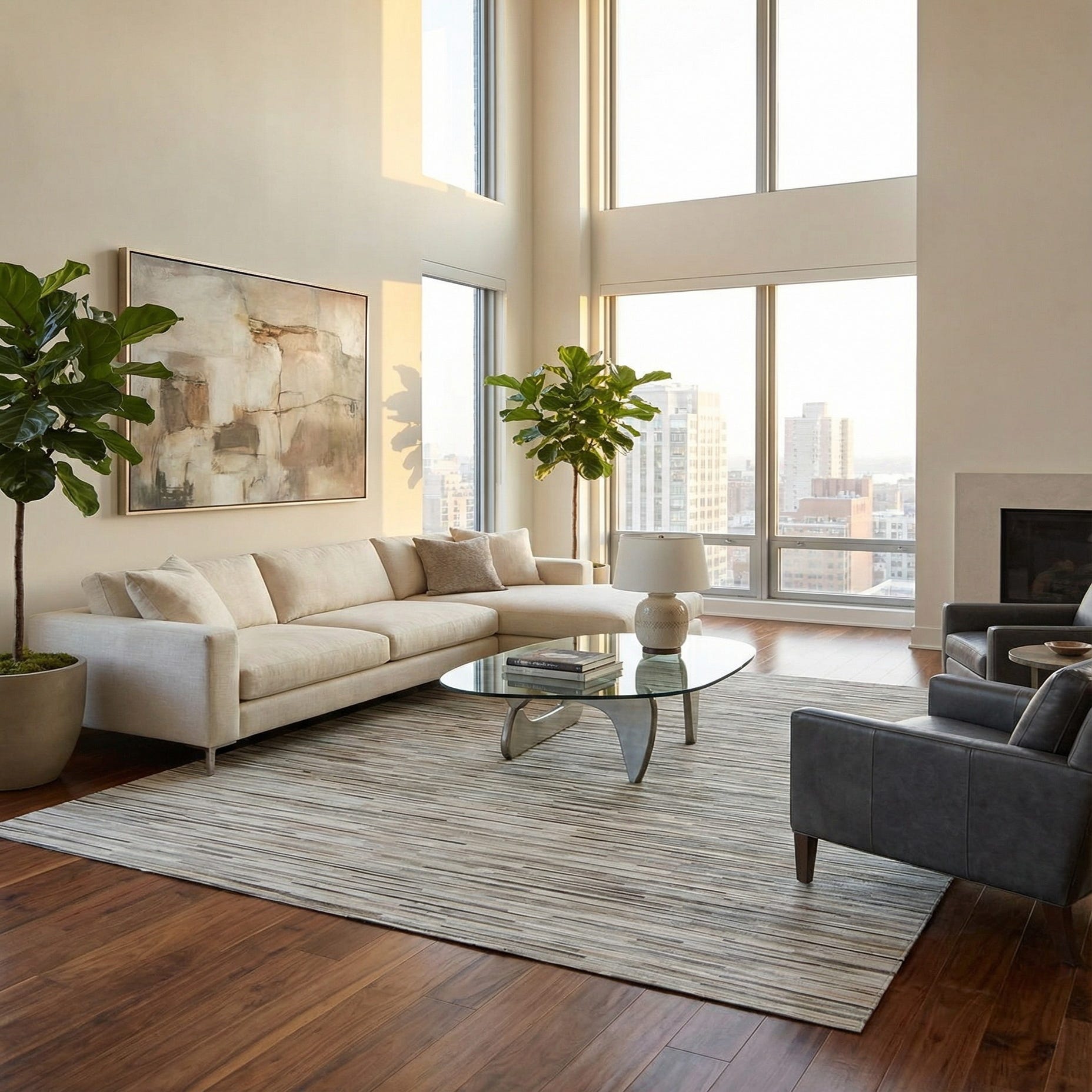 The surface feels smooth and slightly velvety underfoot, with short cowhide hair and fine seams between patches that create gentle texture and a subtle sheen. Handmade construction brings natural variation in tone and grain, adding visual interest up close. Place it to anchor a living room seating area, beneath a dining table, or layered over hardwood in a study. It pairs well with Scandinavian or modern interiors, warm wood finishes, metal accents, and neutral textile palettes.