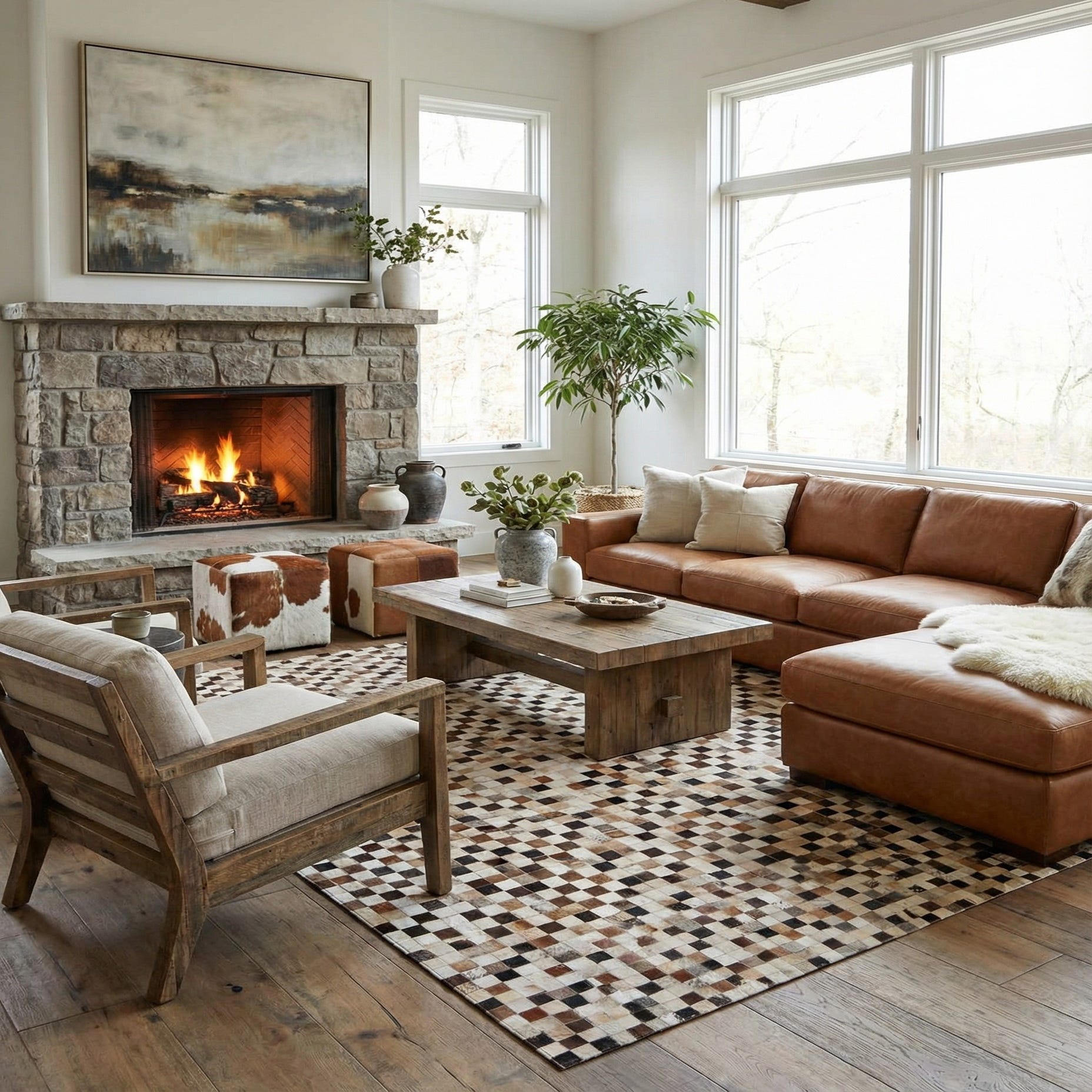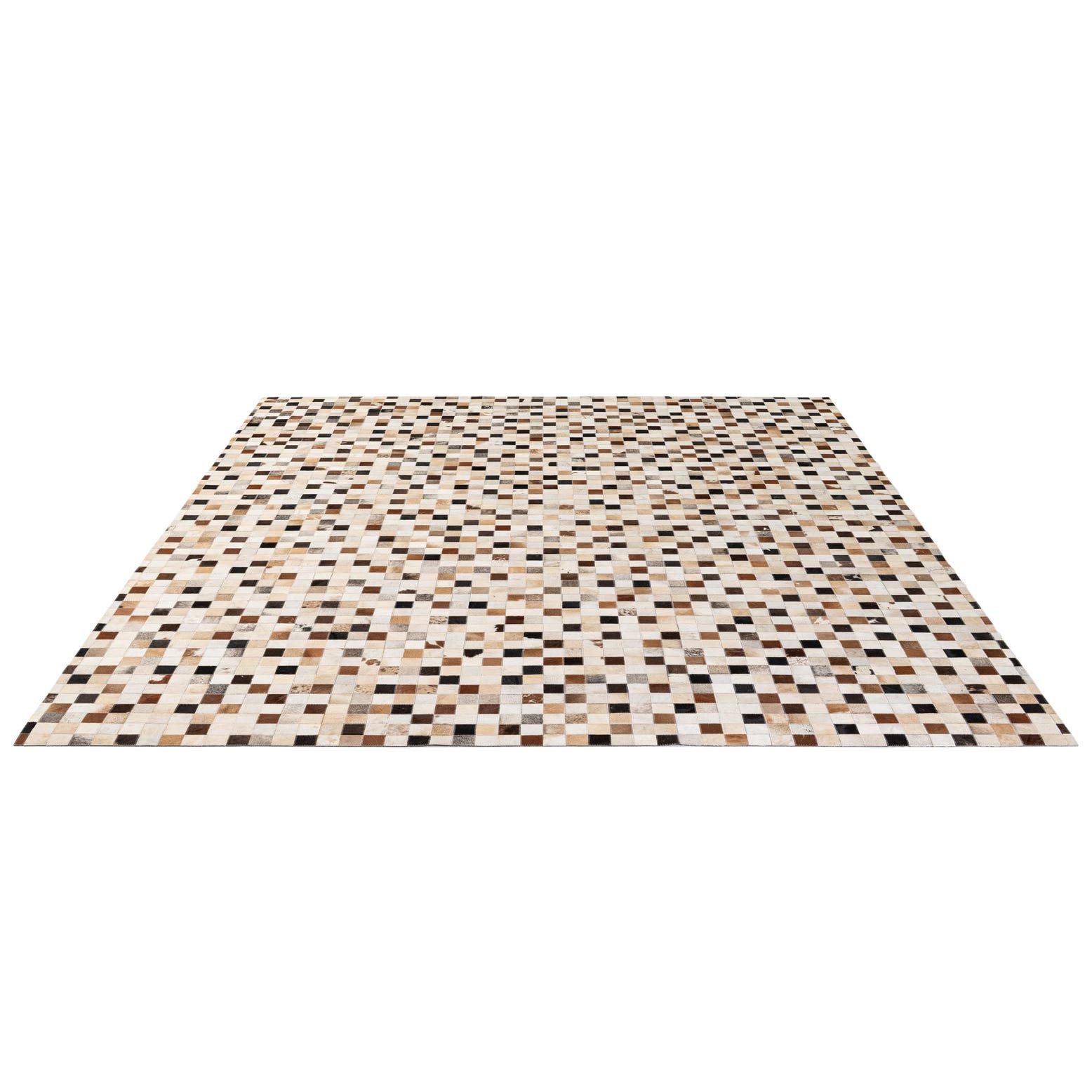 A rectangular 8x10 cowhide patchwork rug featuring a modern mosaic pattern of multi-colored squares in varying shades of brown, black, and cream.