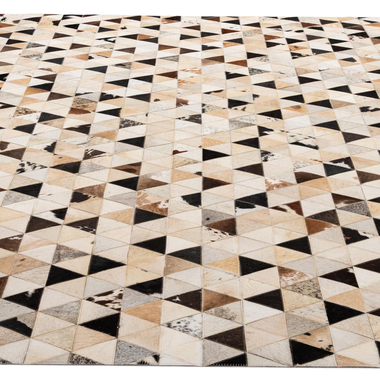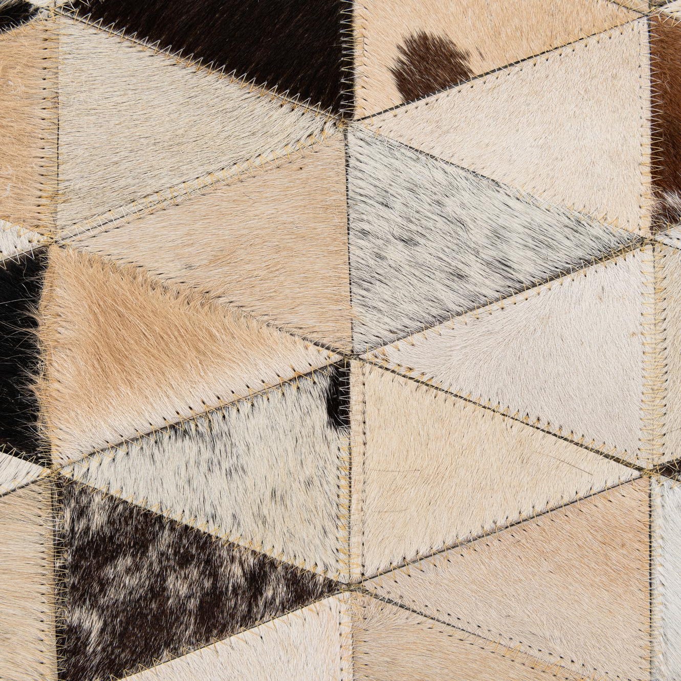 A geometric patchwork of small, equilateral triangles creates a lively yet orderly pattern across this hand?made cowhide and leather rug. The multi background blends cream, beige, light brown, brown and black patches, with natural hair?on?hide markings and subtle tonal variation in each piece. The leather-stitched seams add definition to the geometry while the hair-on-hide surface offers a tactile, low?pile feel that invites bare feet and balances texture without rising above furniture legs.