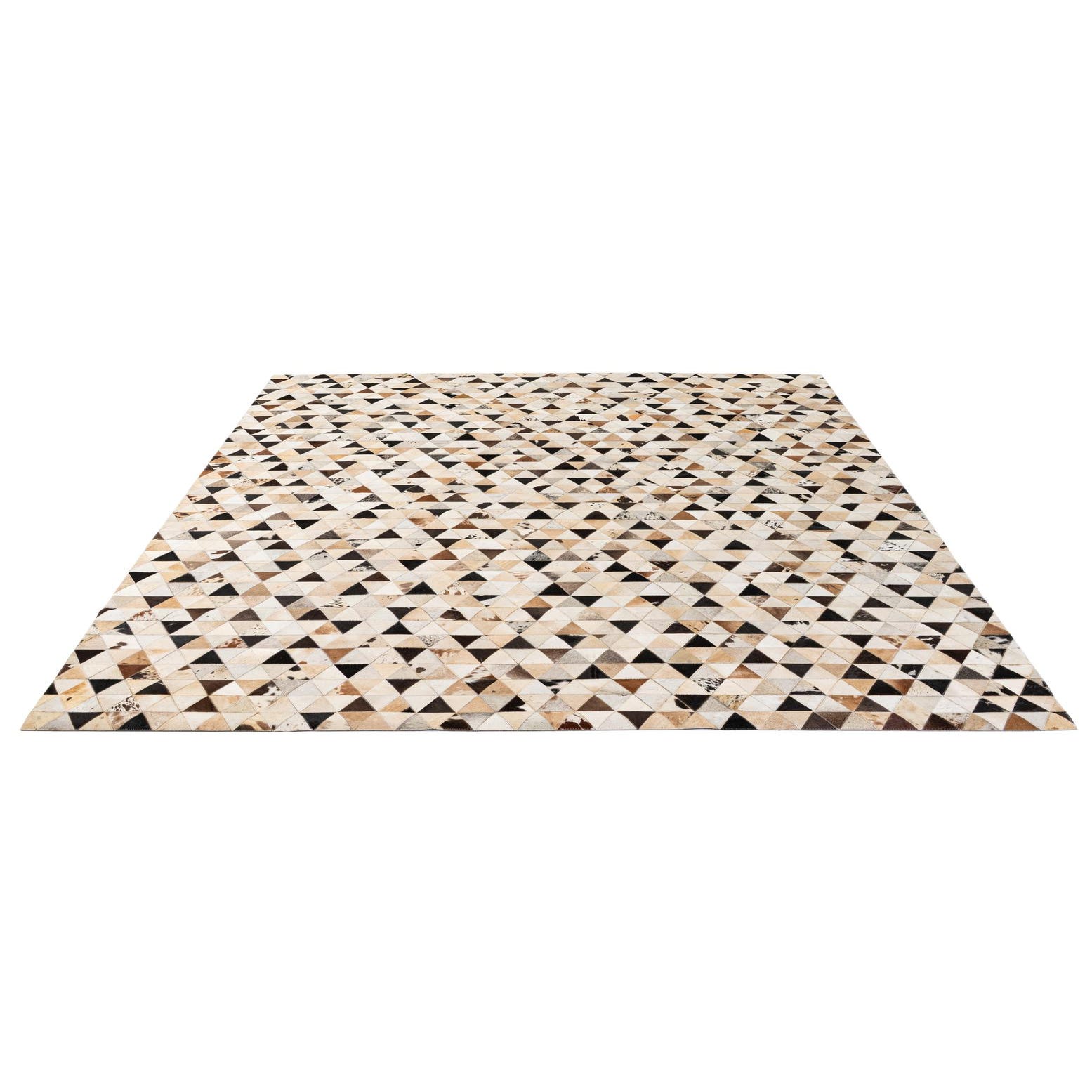 A rectangular 8x10 modern cowhide rug featuring a geometric patchwork of multi-colored triangles in natural browns, creams, and black.