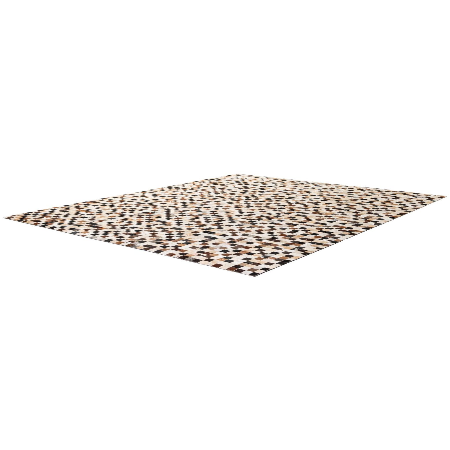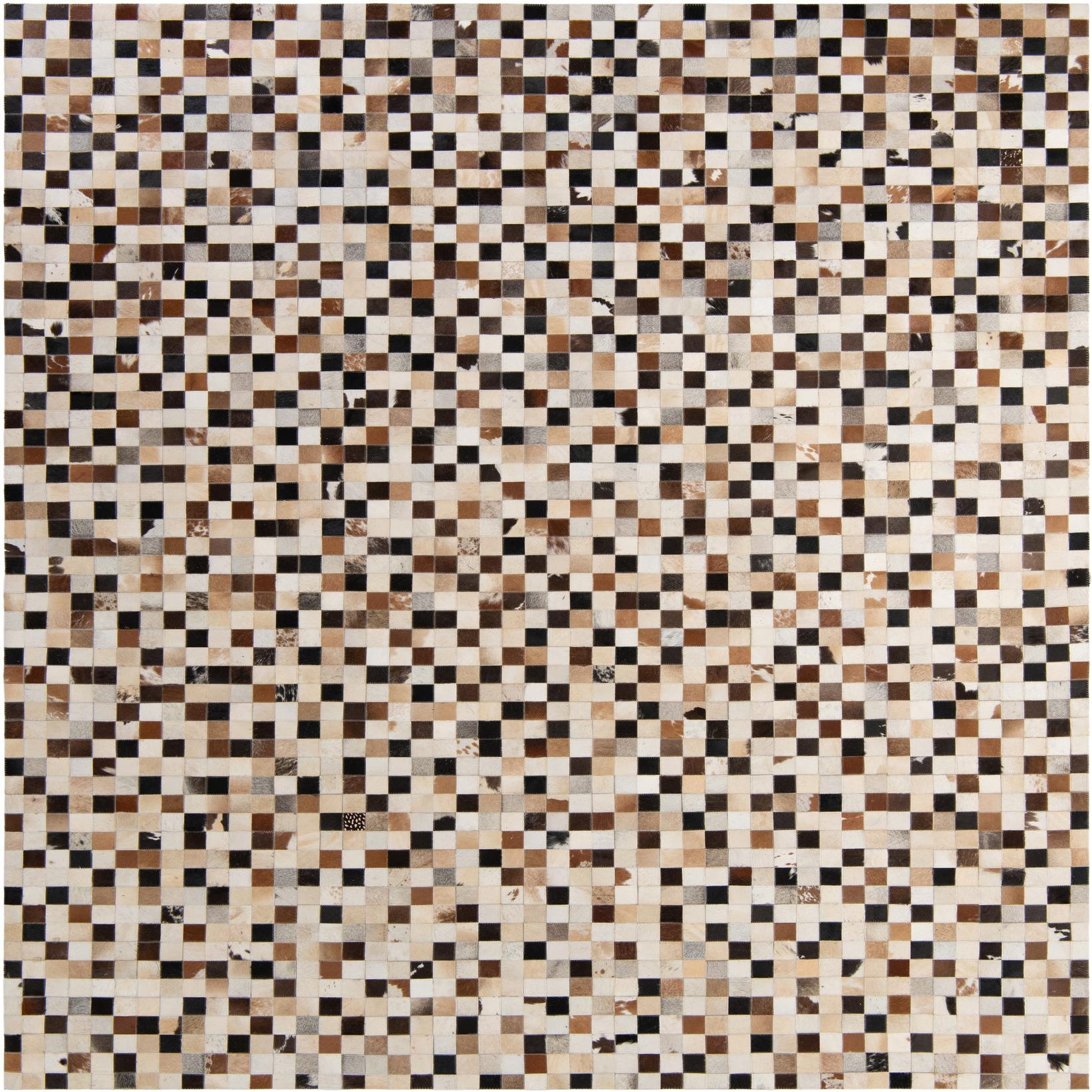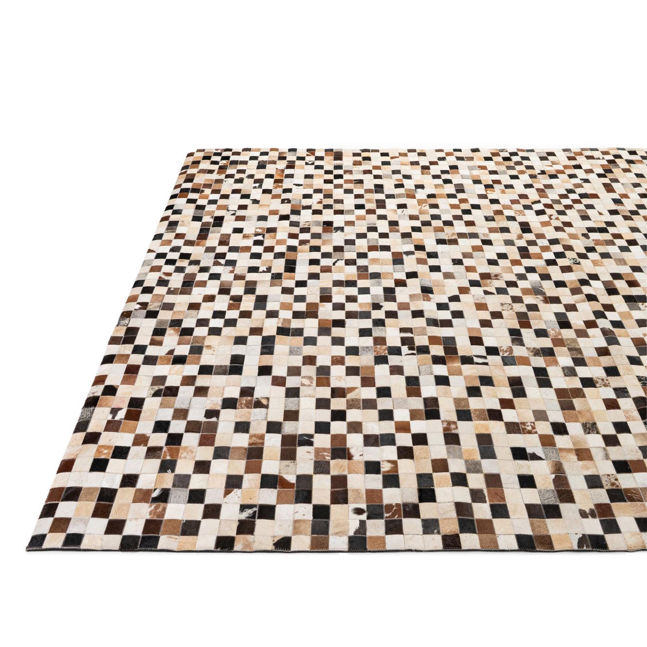 A rectangular 8x10 multi-colored cowhide patchwork rug with a modern checkerboard pattern, perfect for a living room.
