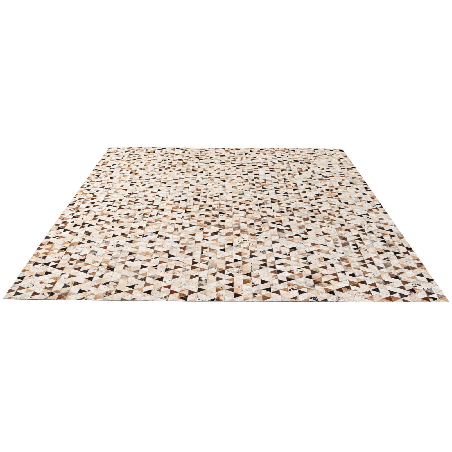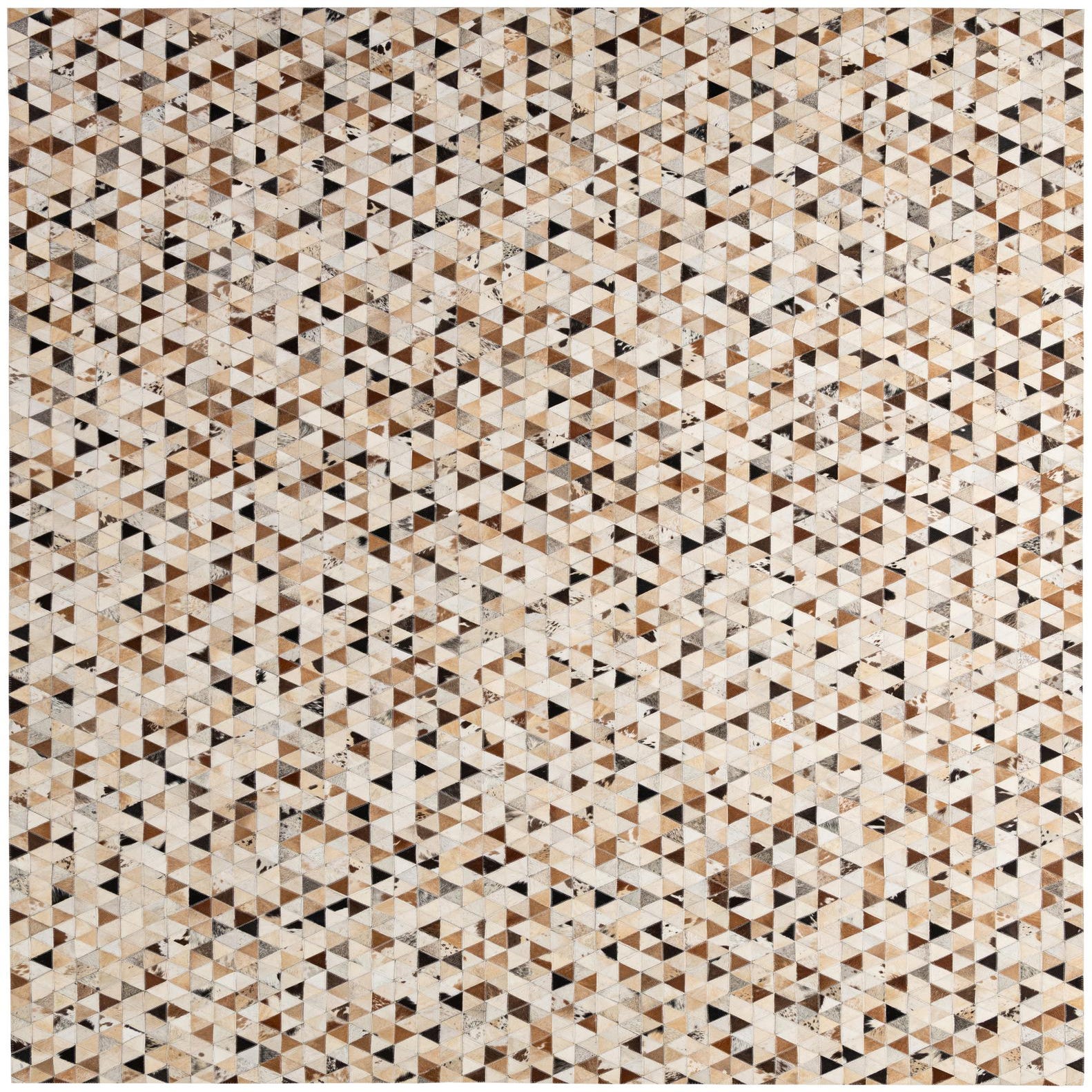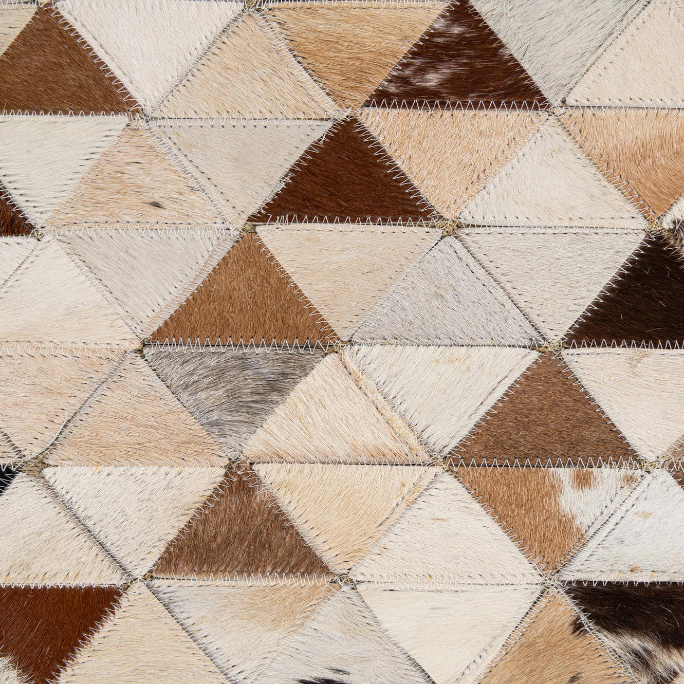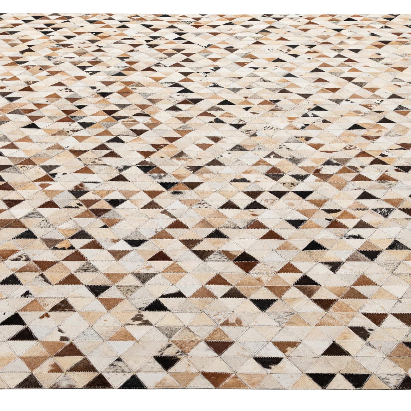 8x10 rectangular Cowhide - Patchwork rug featuring a modern geometric pattern of multi-colored triangles in shades of brown, black, and cream.