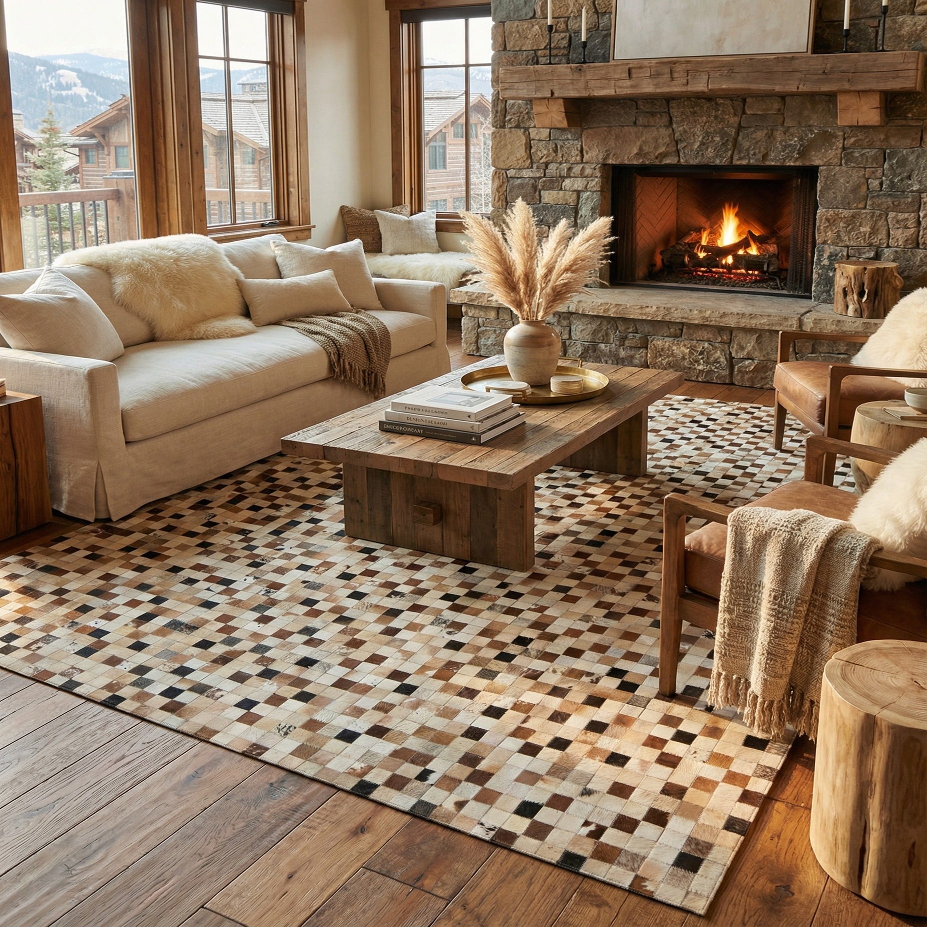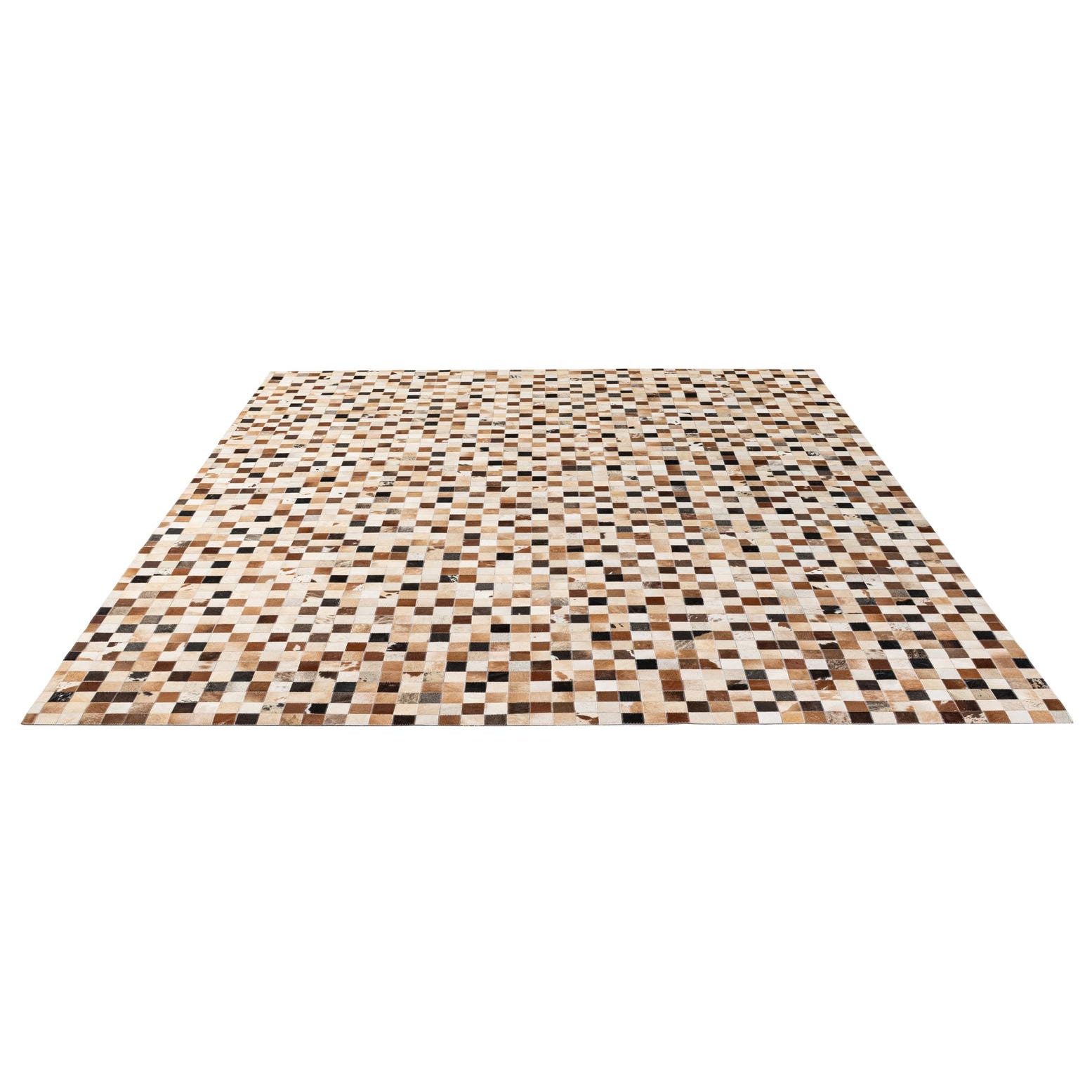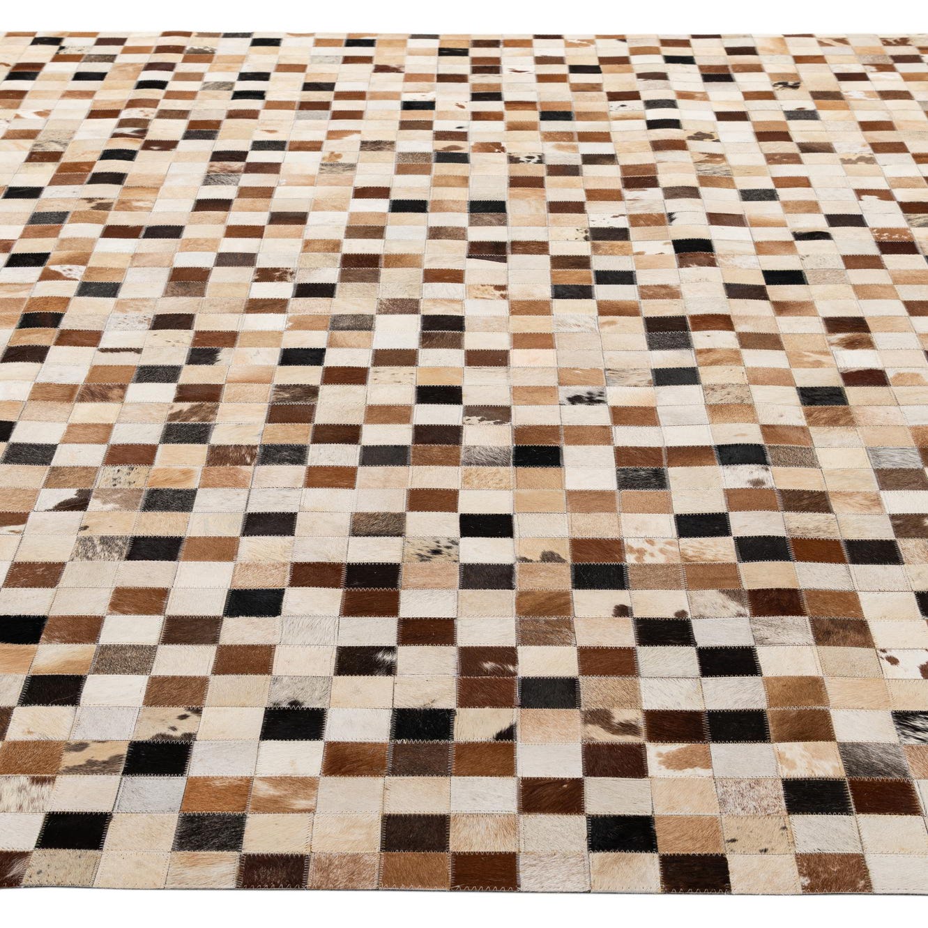 A rectangular 8x10 modern cowhide rug with a patchwork pattern of multi-colored squares in various shades of brown, black, and cream.