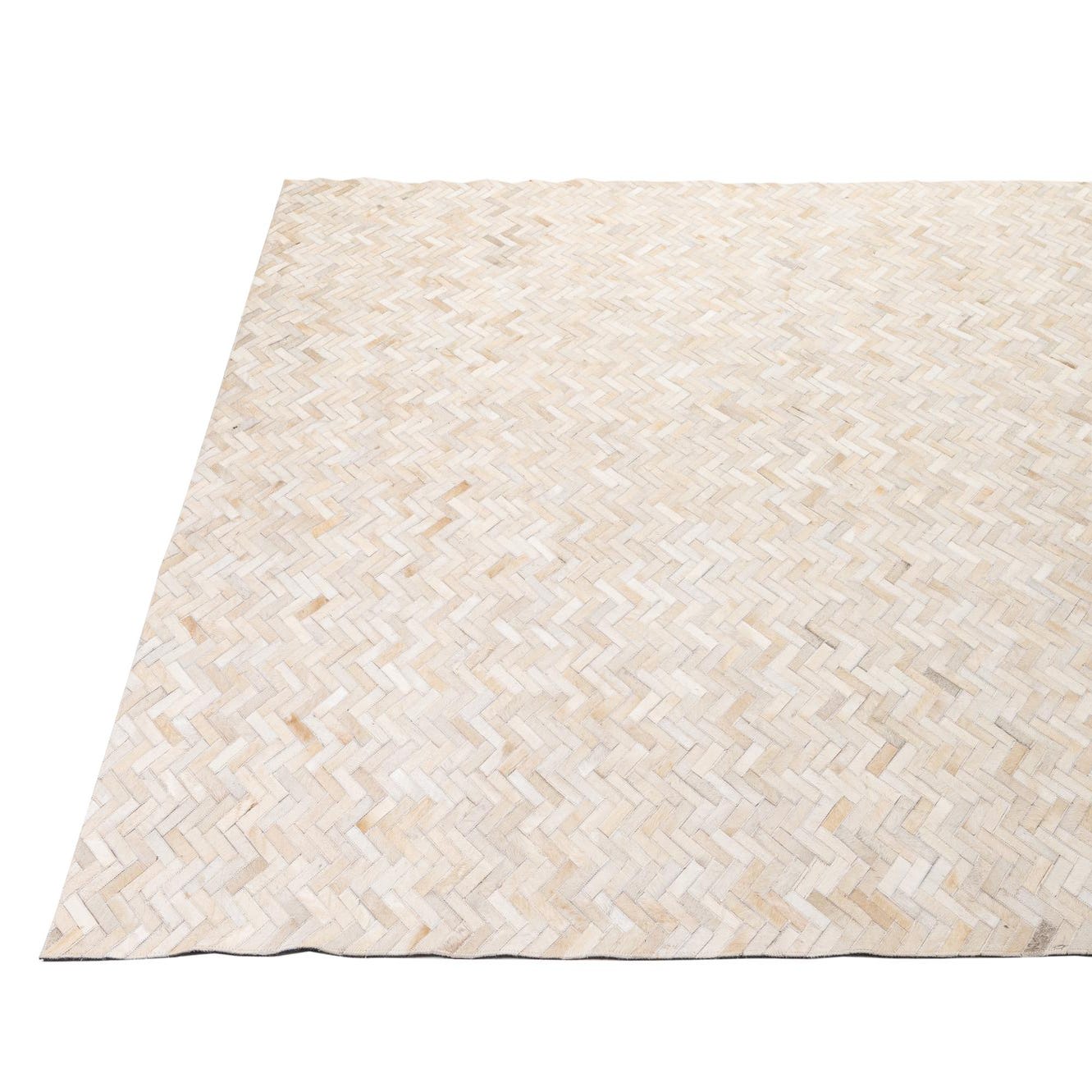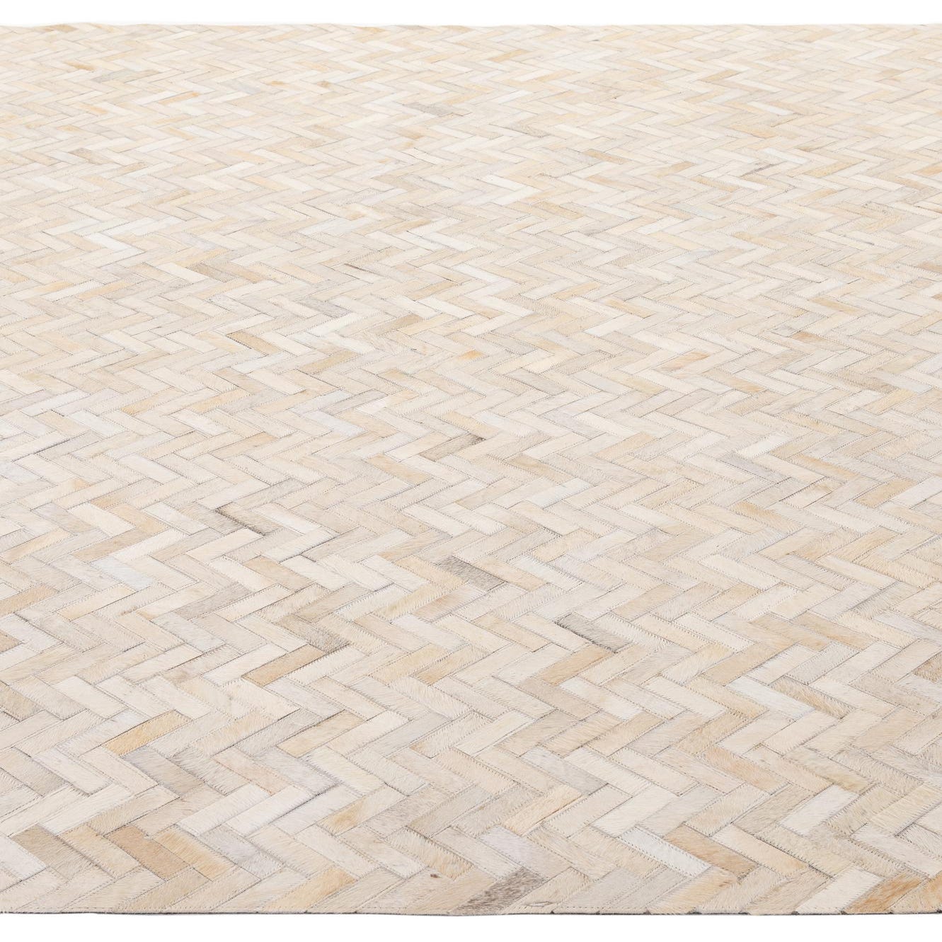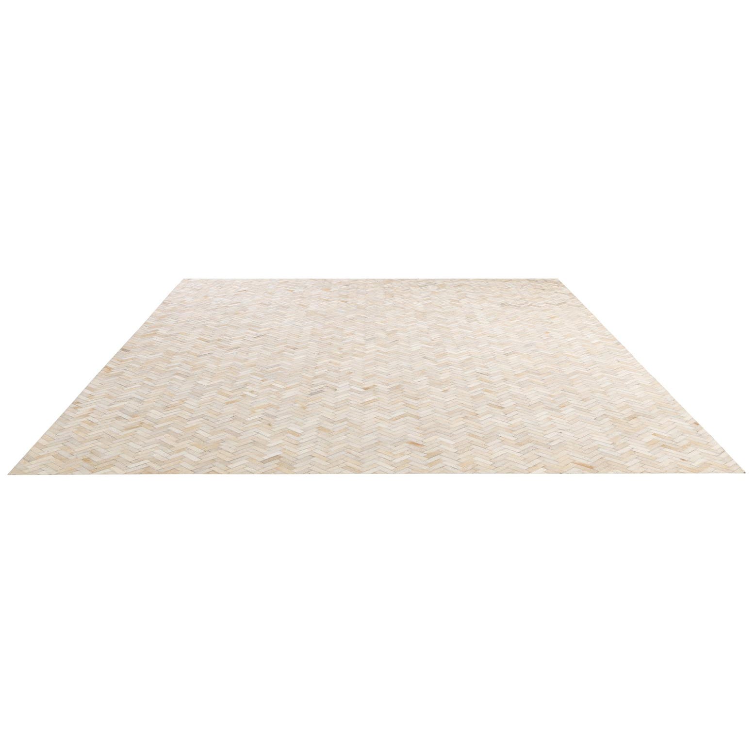 A rectangular 8x10 Cowhide & Leather rug featuring a modern patchwork herringbone pattern in multi-colored natural tones.