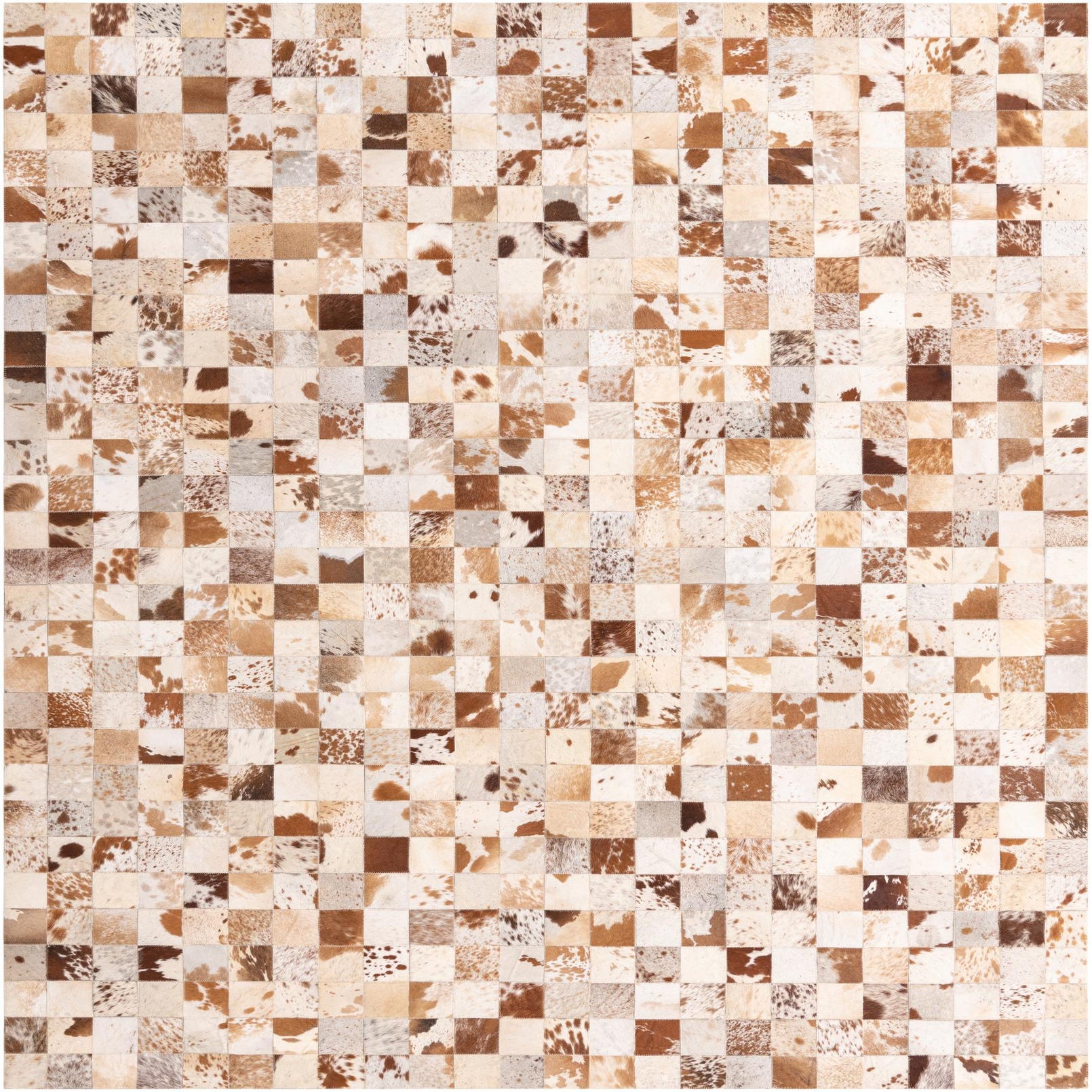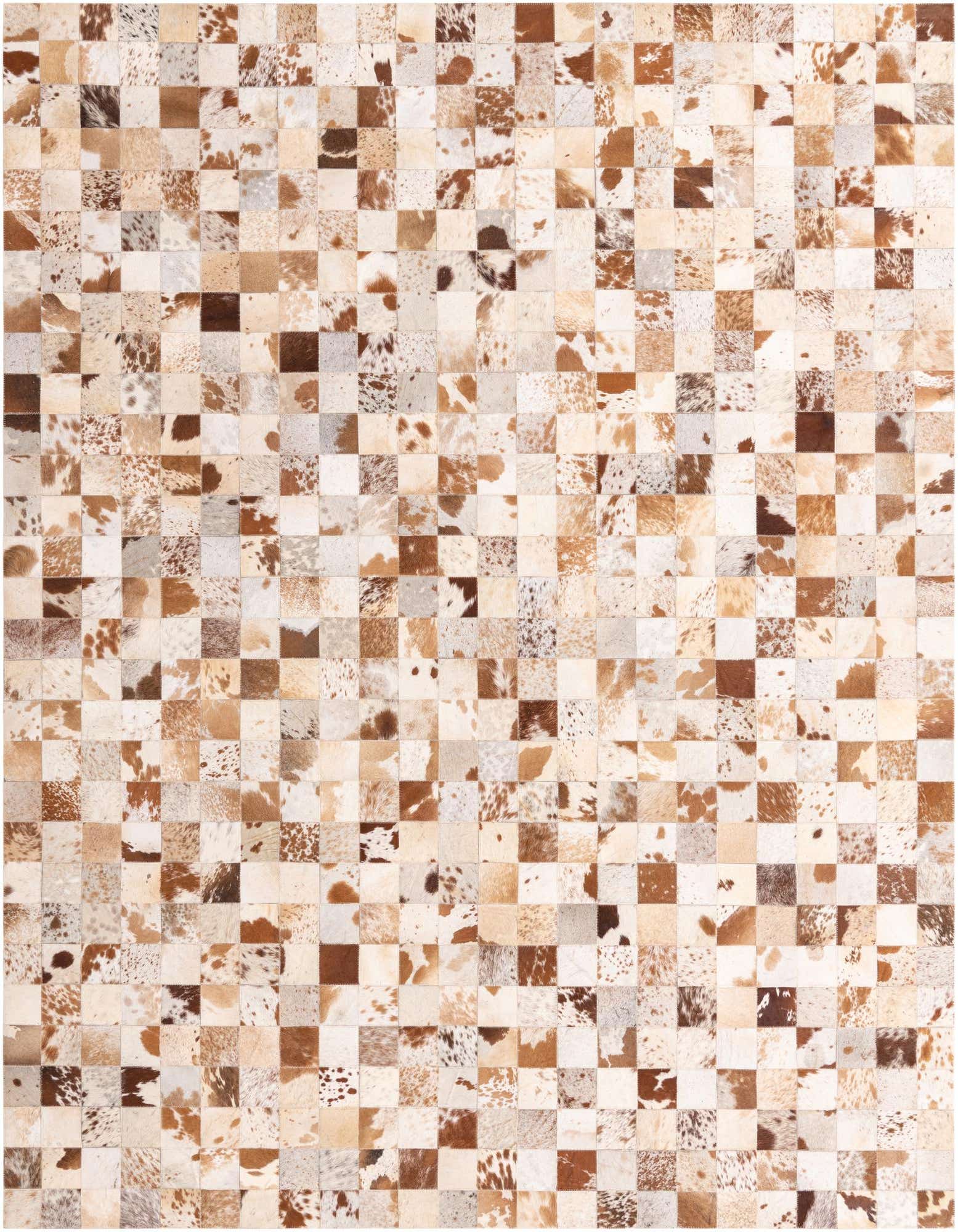 The Cowhide Leather collection offers a handcrafted 8x10 rug that distinctly showcases the natural beauty and enduring style of cowhide and leather materials. This piece features a patchwork mosaic of varying cowhide textures and patterns, with an earthy color palette that includes beige, brown, gray, ivory, and cream tones on a multi-colored background. The tactile surface provides a sense of depth and an organic feel to the space.