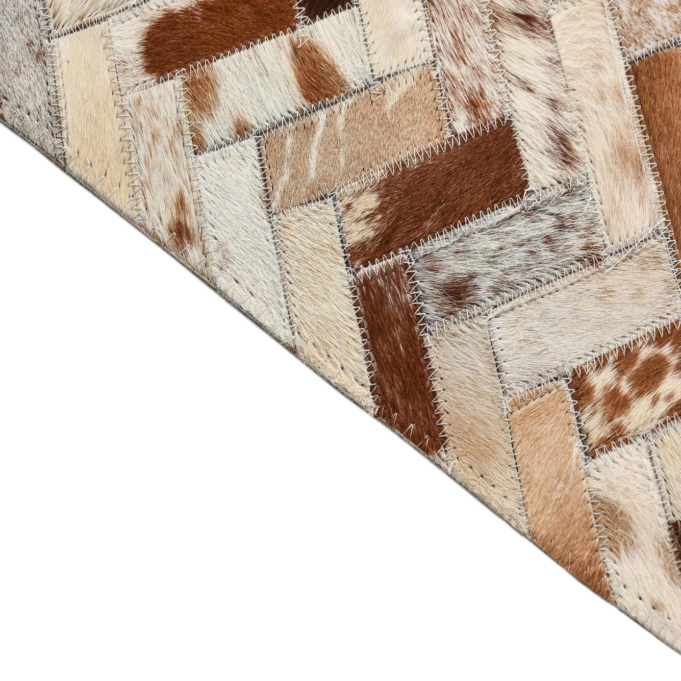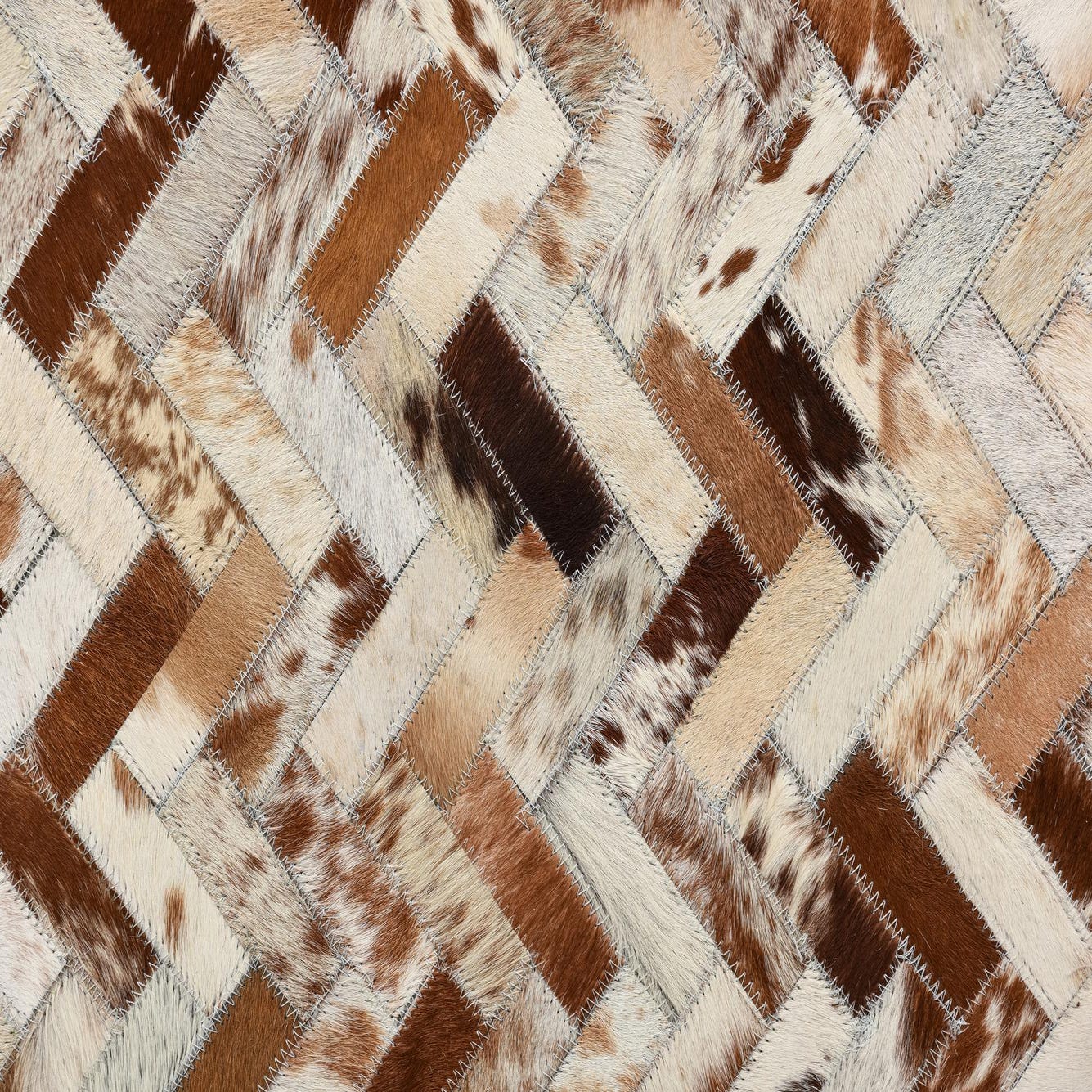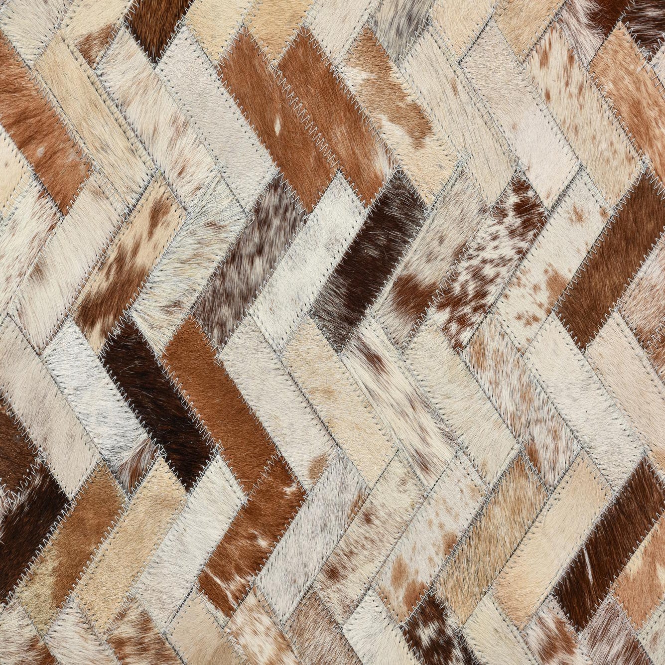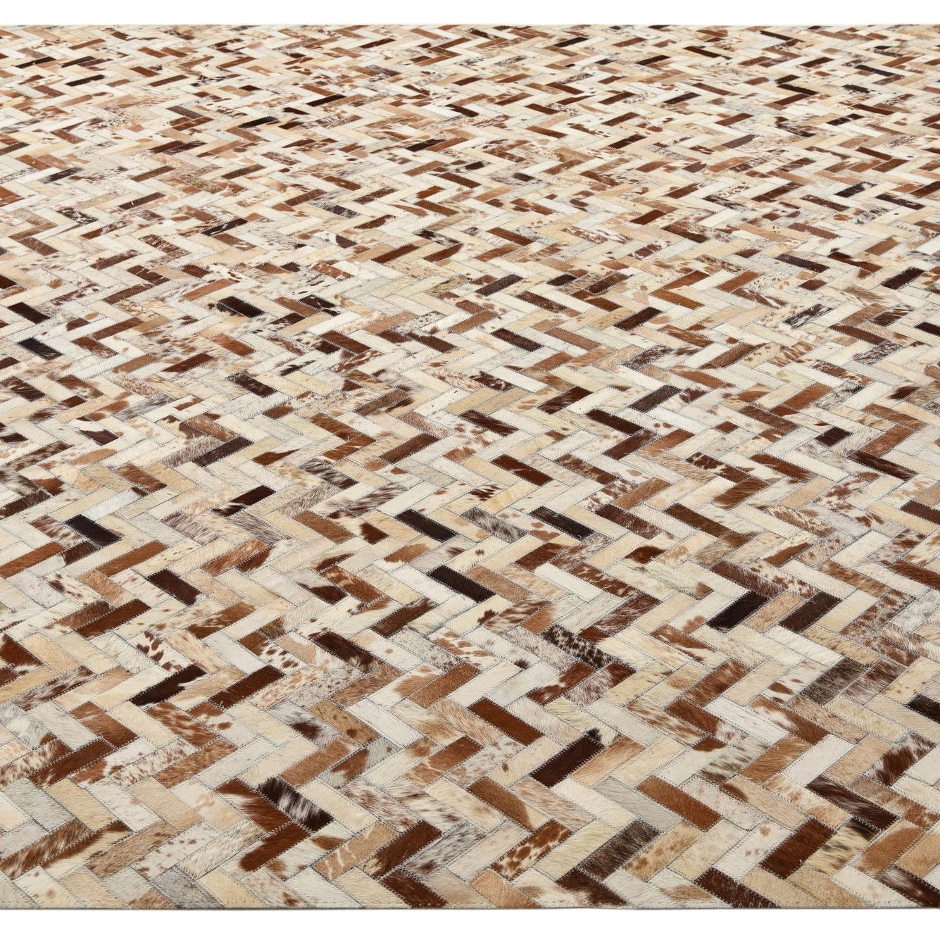 Part of the Cowhide Leather collection, this handcrafted 8x10 rug showcases a dynamic herringbone pattern composed of cowhide and leather materials. The assembly of beige, brown, ivory, and light brown colors, set against a multi-colored background, adds depth and texture, creating a distinctive yet versatile aesthetic. The interplay of varied hues in neutral tones ensures that it complements a range of interior design schemes.