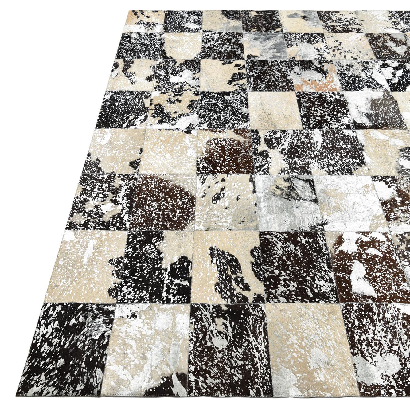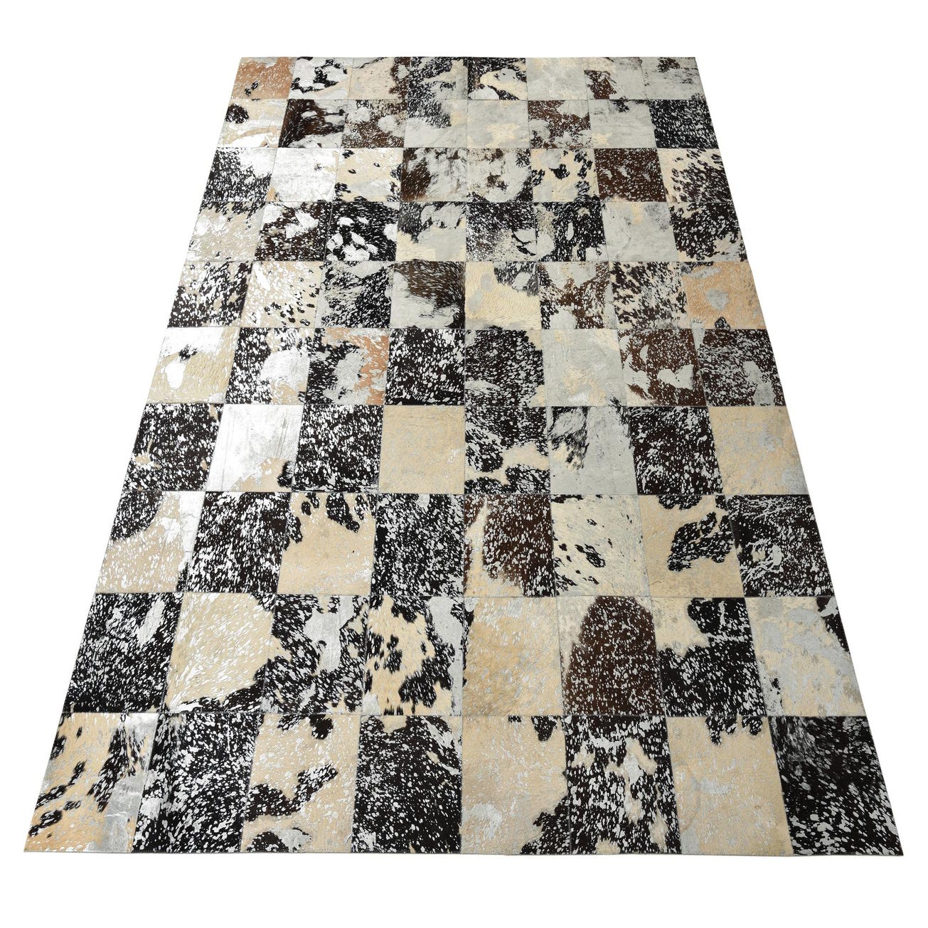 A rectangular 8x10 modern cowhide rug with a multi-colored patchwork pattern in shades of brown, black, white, and beige.