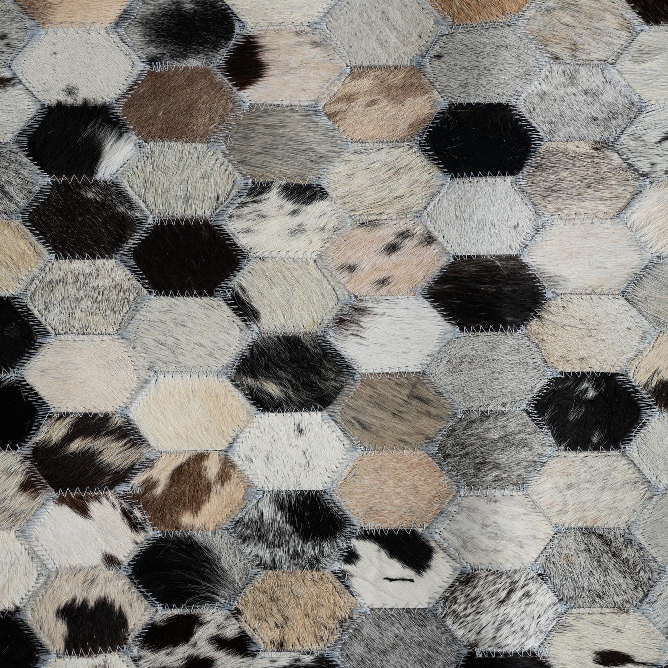 The Cowhide Leather rug boasts a dynamic array of colors including beige, black, brown, gray, ivory, tan, and multi-tones set against a diverse multi-colored background, creating a mosaic of natural hues that evoke a sense of earthy warmth. Handmade from cowhide and leather, this 8x10 rug showcases a unique texture that offers both visual interest and tactile appeal. Its hexagonal patchwork pattern is refined yet robust, providing a distinctive accent to a room's design.