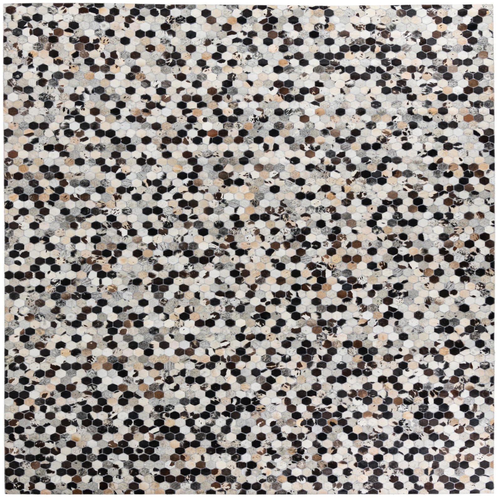 A rectangular 8x10 multi-colored cowhide rug featuring a modern abstract pattern of small hexagonal patches in varying shades of black, white, brown, and grey.