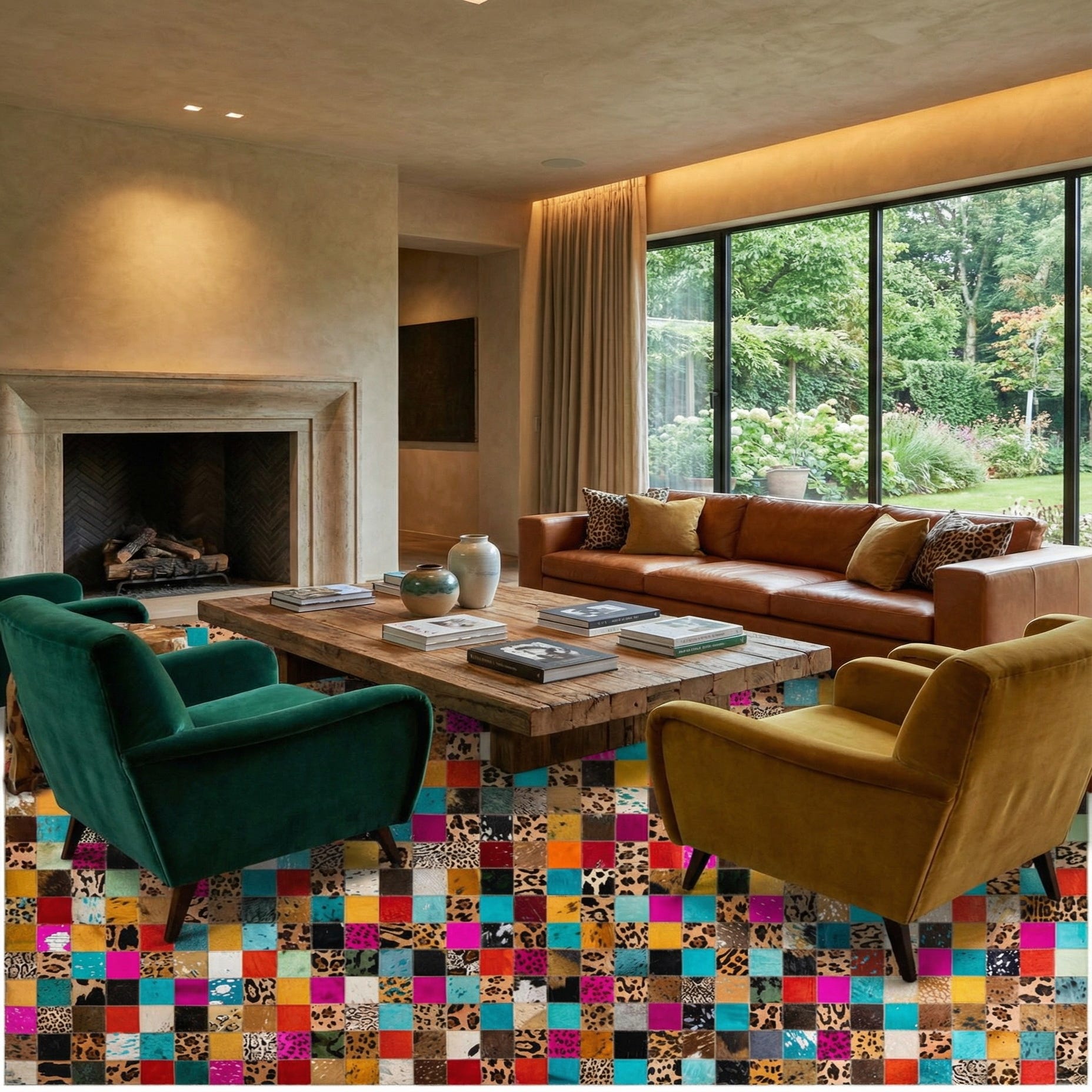 The surface is tactile and varied: smooth leather patches alternate with the softer, slightly textured hair-on-hide pieces and visible stitching lines that read as subtle relief underfoot. Place it in an eclectic living room or loft to anchor a seating area, layer it beneath a low-profile sofa for a modern bohemian look, or use it to add color and texture to a neutral entry or dining space. It pairs well with warm woods, leather furniture and matte metal accents, and can serve as the focal point in rooms that welcome bold color and tactile contrast.