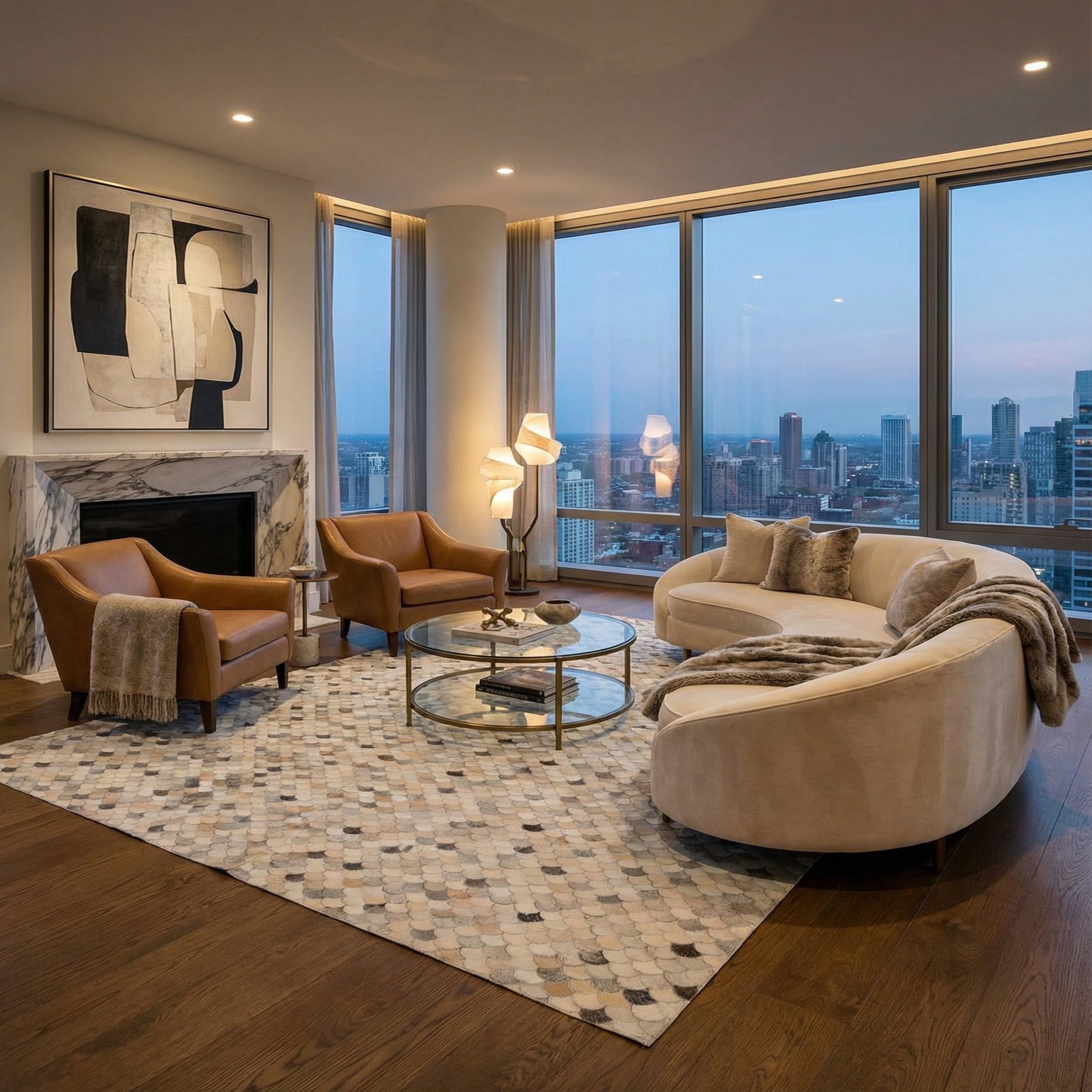 A rectangular 8x10 Cowhide Leather rug featuring a modern, abstract scale pattern in multi-colored natural tones.