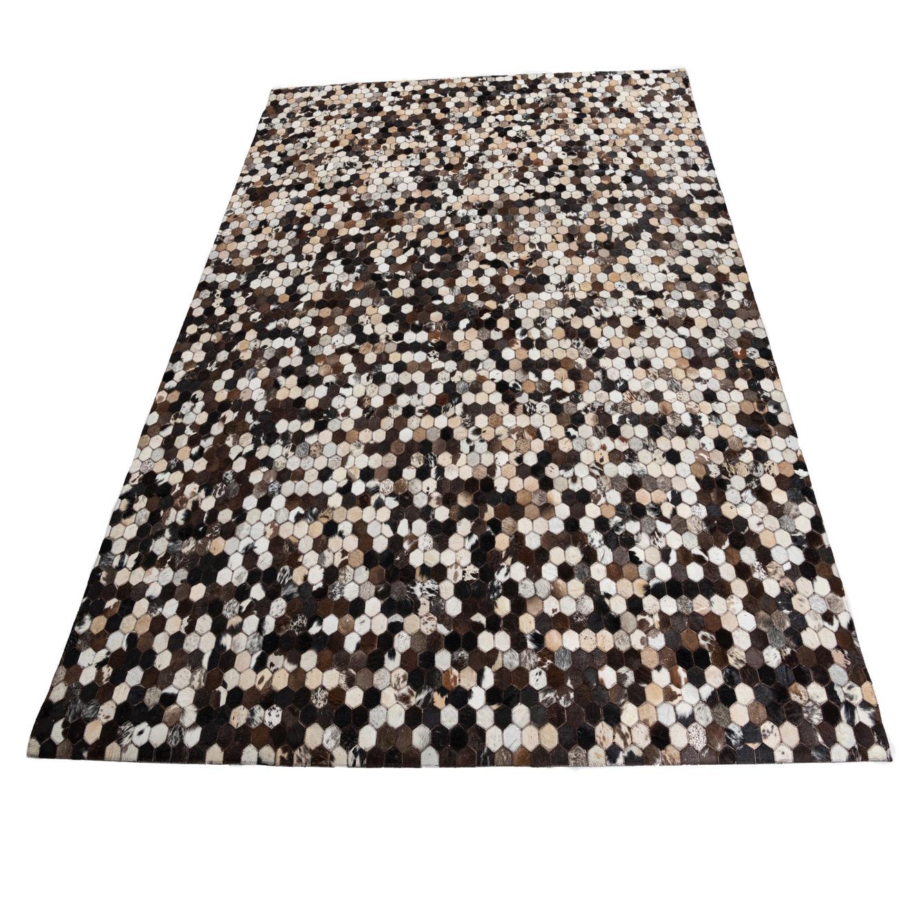 A rectangular 8x10 Cowhide Leather rug featuring a modern mosaic pattern of multi-colored hexagonal patches in various shades of brown, black, and white.