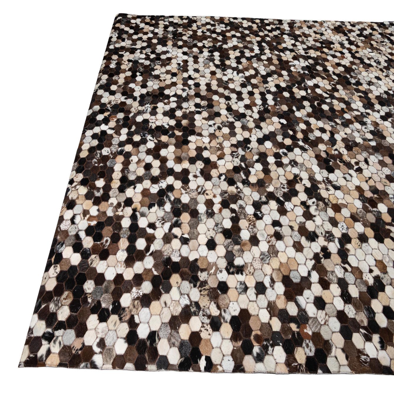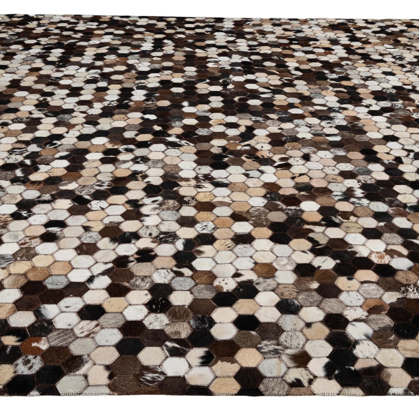A tight honeycomb pattern of small hexagon patches creates a richly detailed surface in a mix of multi, beige, black, brown, gray, ivory and light brown tones. Individual cowhide pieces display natural markings and subtle tonal shifts that give the rug depth and visual interest while maintaining an overall neutral palette. The geometric layout reads modern, while the organic variation of each hide keeps the look grounded and textural.