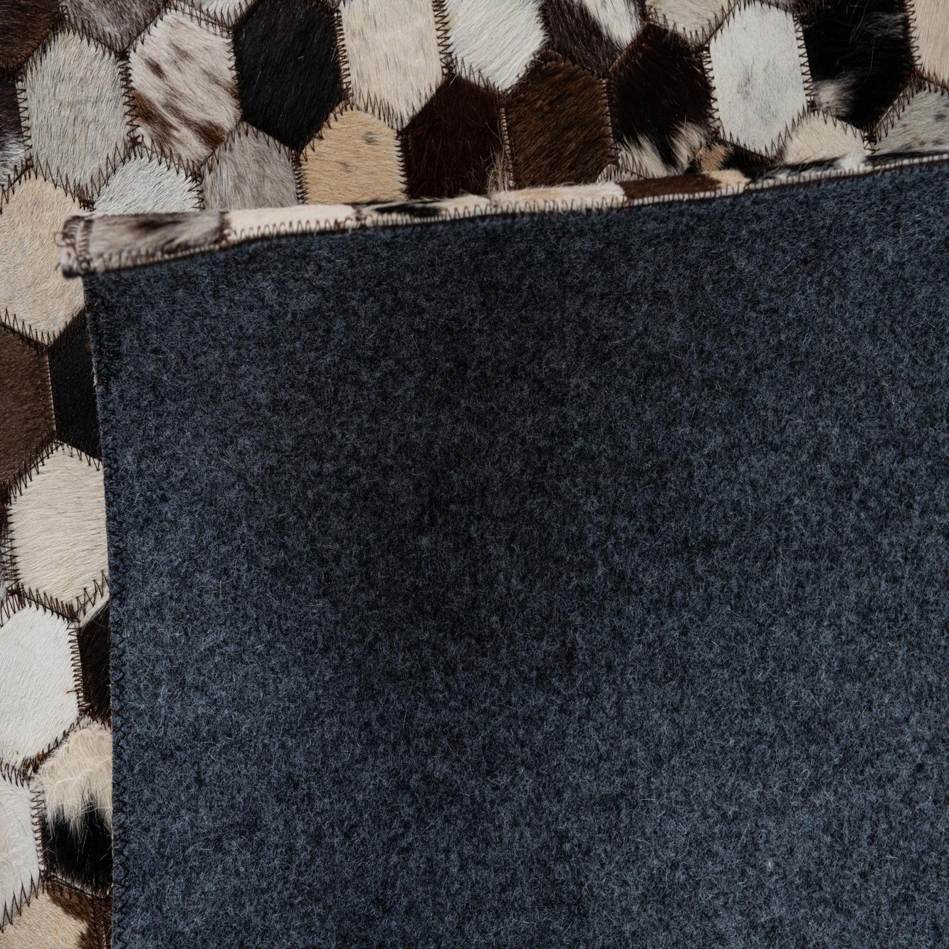 Handmade from cowhide and leather, the rug has a low, tactile hair-on-hide surface with a soft sheen and the stitched seams between pieces add gentle dimensionality underfoot. Pair it with warm woods and leather furniture for a modern-rustic living room, anchor a neutral seating group in a transitional space, or place it in a study or entry to introduce layered texture and durability. Its neutral color story complements both cool and warm schemes and provides a grounded backdrop for patterned textiles or simple contemporary furnishings.