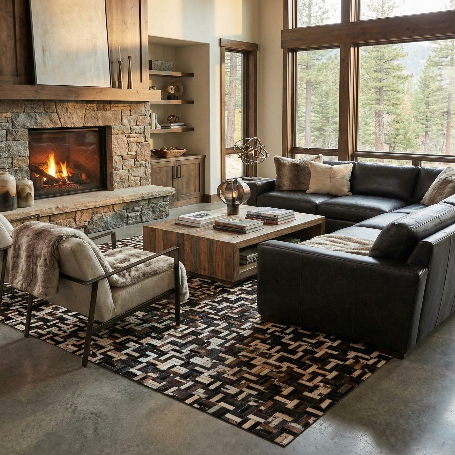 With its organic aesthetic and contemporary pattern, the rug is suited for an array of interior styles. It is an ideal statement piece for modern, industrial, or rustic decors, anchoring living rooms, offices, or open loft spaces with its robust materiality. The earthy tones and rich textures pair well with a minimalistic approach, allowing the rug to serve as both a focal point and a harmonious addition to a space emphasizing natural elements and craftsmanship.