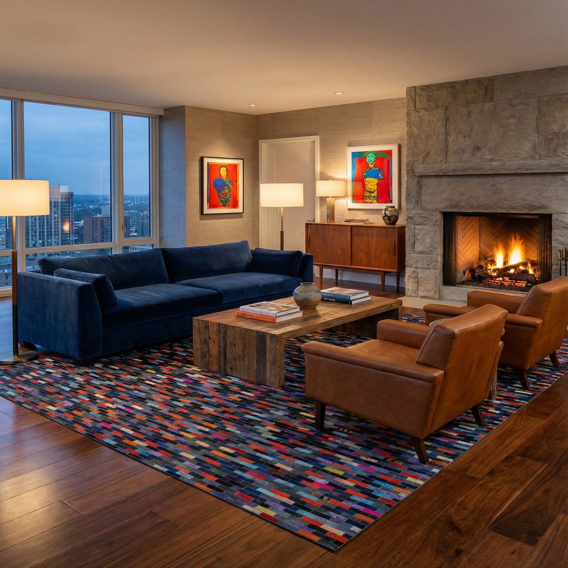 8x10 rectangular Cowhide Leather rug featuring a modern stripe pattern with multi-colored rectangular patches on a dark background.