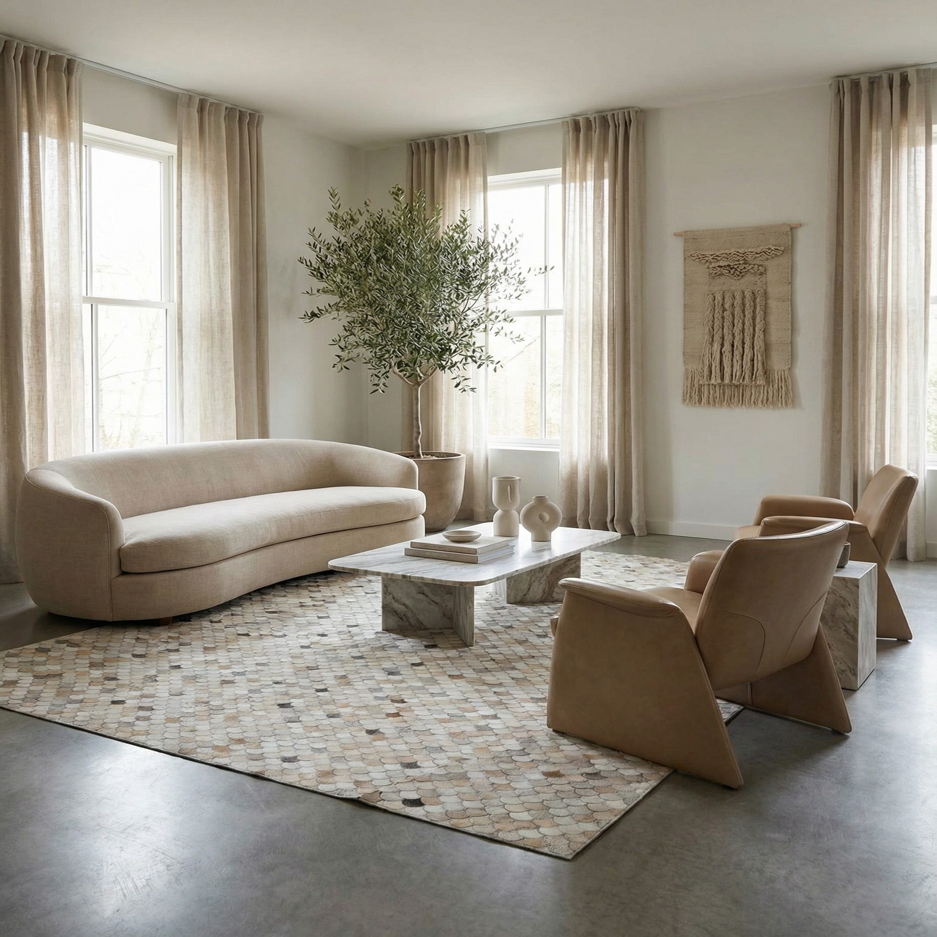 This rug offers a contemporary yet timeless aesthetic and is particularly well-suited for settings that aim for a warm and inviting ambiance. Its earthy tones and organic pattern harmonize with a variety of decors, from modern minimalist spaces where it adds texture and interest, to more traditional or rustic environments that benefit from its natural elegance. The Cowhide Leather rug could serve as a distinctive centerpiece in a living room, under a dining table, or as an accent in an office, enhancing the room with its unique character and sophisticated charm.