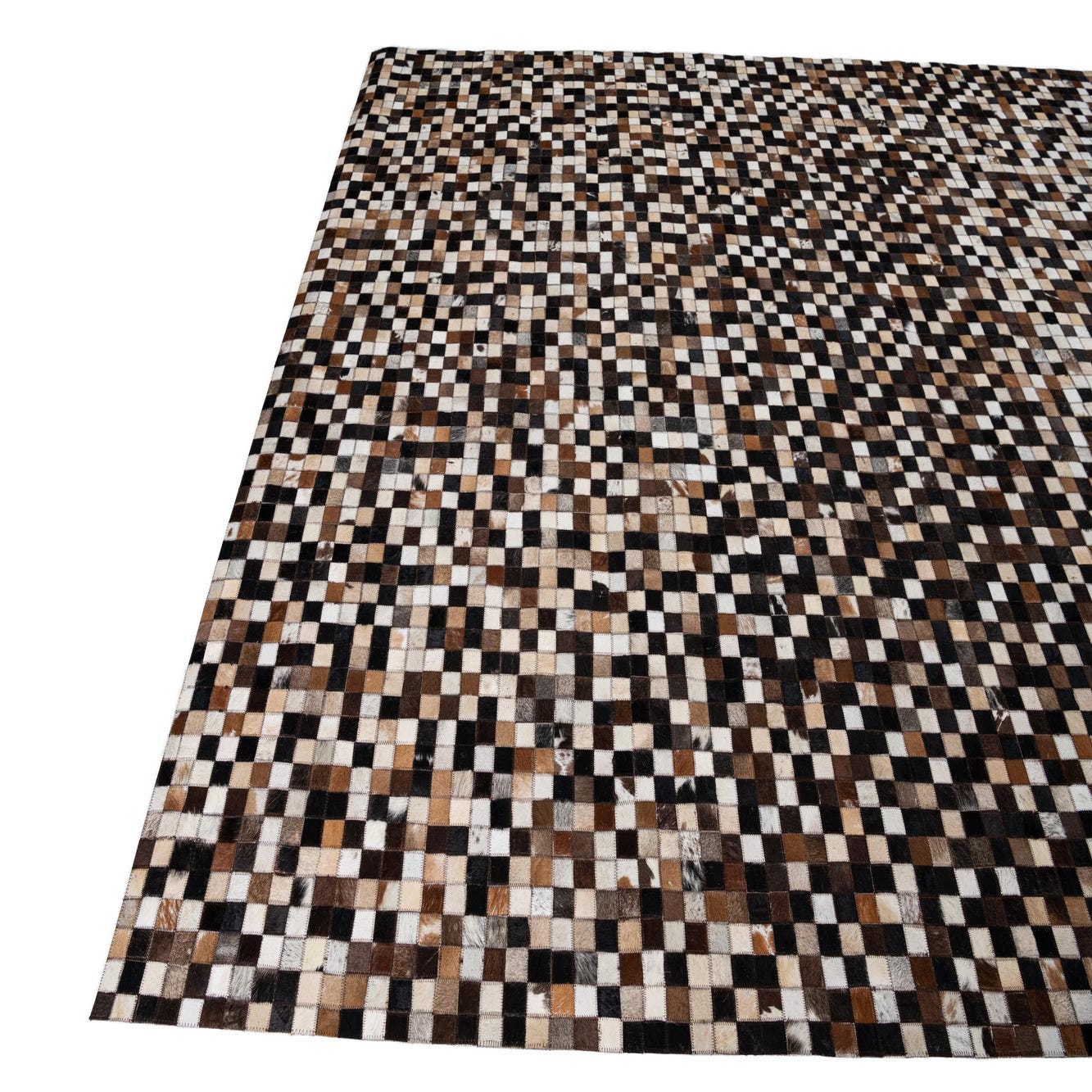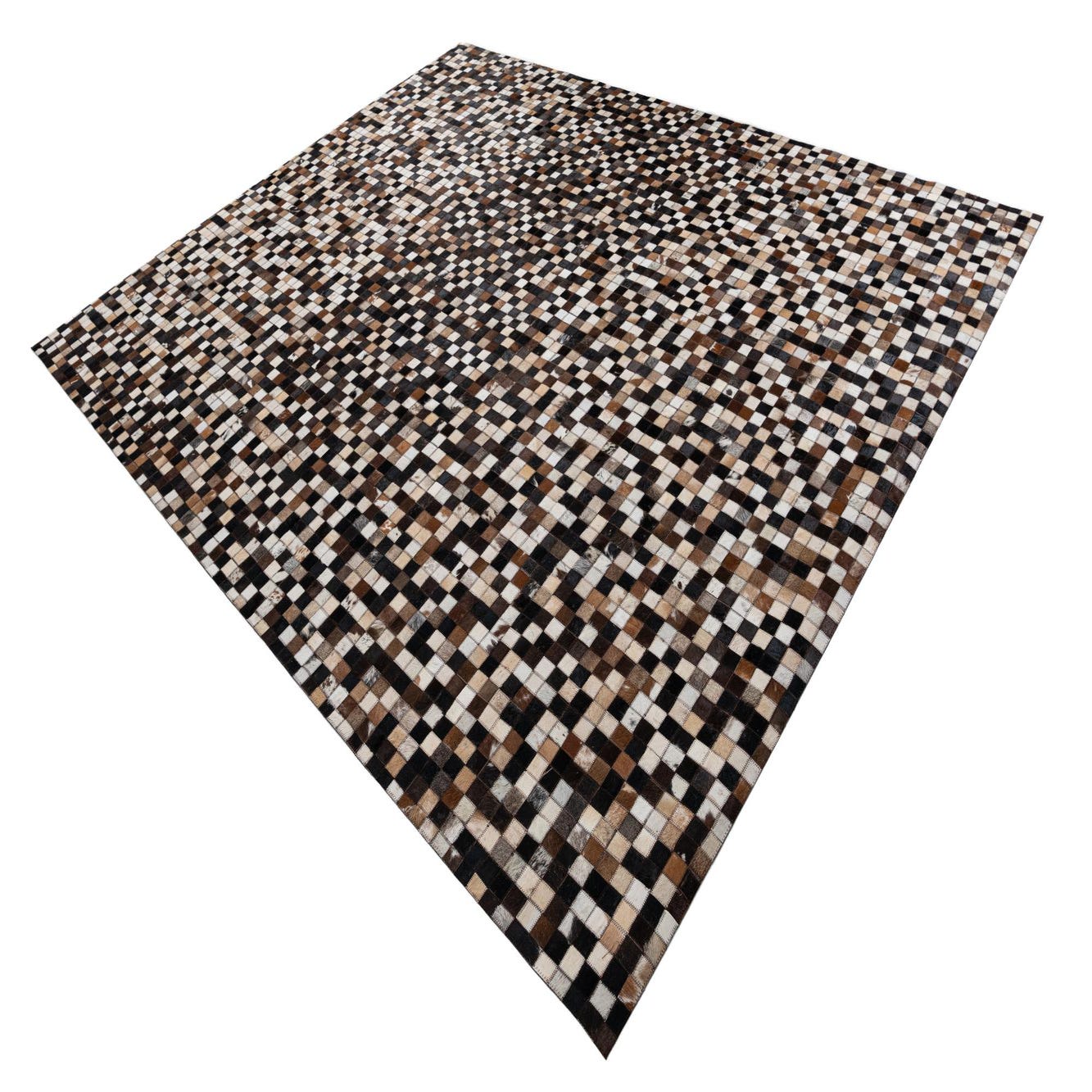 A rectangular 8x10 multi-colored modern cowhide rug featuring a pixelated mosaic pattern of black, brown, and white squares.