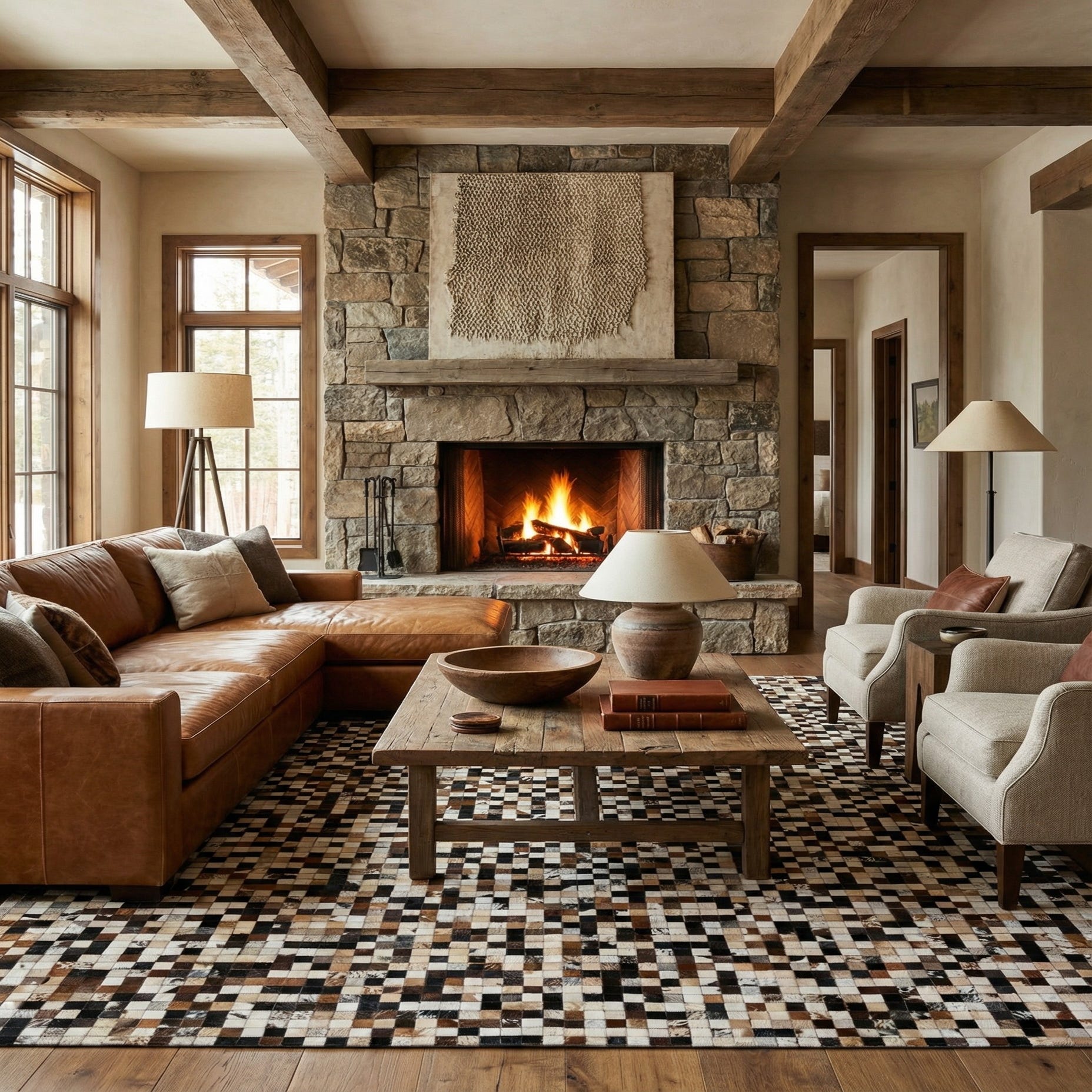 Given the natural materials and neutral color palette, this rug can anchor a variety of decor styles. It would complement a modern minimalist interior, adding interest without overwhelming the space. It's equally at home in an industrial setting, where its raw texture and rich tones harmonize with exposed materials like brick and metal. This piece can also serve as a statement in a contemporary or eclectic living room, office, or den, offering both visual intrigue and a timeless touch to the interior landscape.