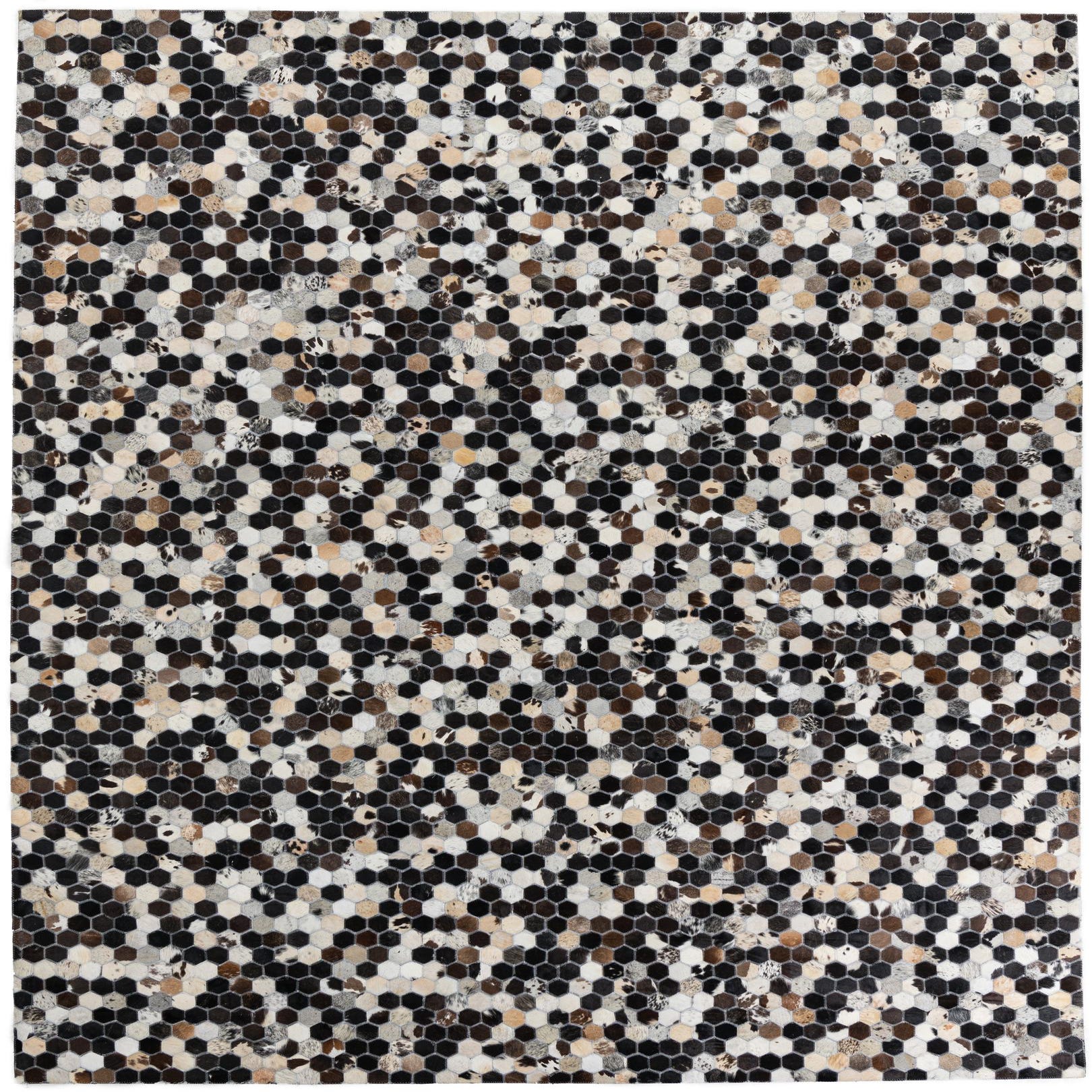 Patchwork hexagons create a tight honeycomb pattern across a multi background, with each small tile showing natural variation in beige, black, brown, ivory, gray and tan. Hand made of cowhide and leather, the surface presents the short, velvety nap of hair-on-hide; running your hand over it reveals a soft, tactile feel while the stitched edges between hex pieces add a subtle ridge and handcrafted texture that reads as layered and dimensional underfoot.