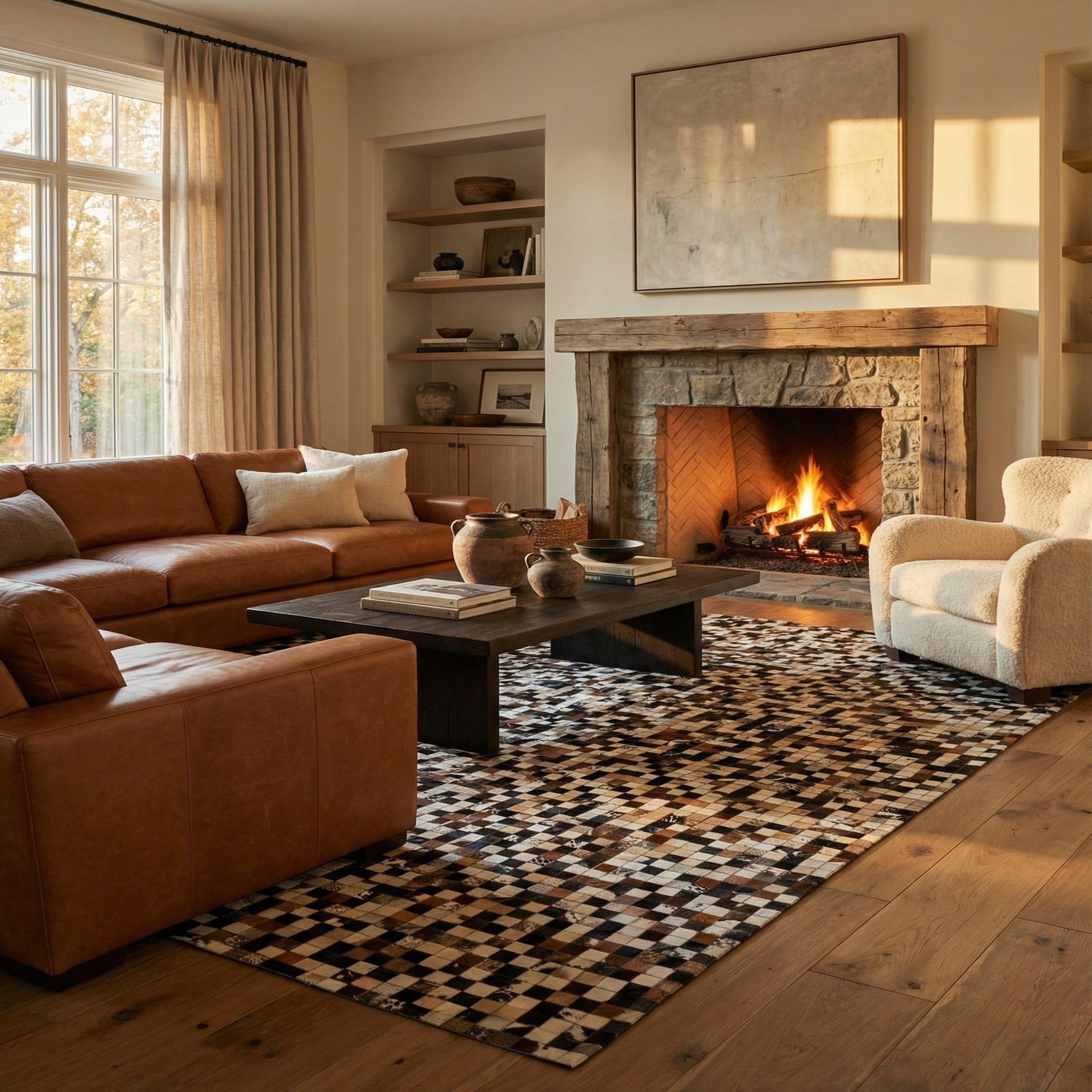 8x10 rectangular Cowhide Leather rug featuring an abstract, multi-colored checkerboard pattern in shades of brown, black, and white.