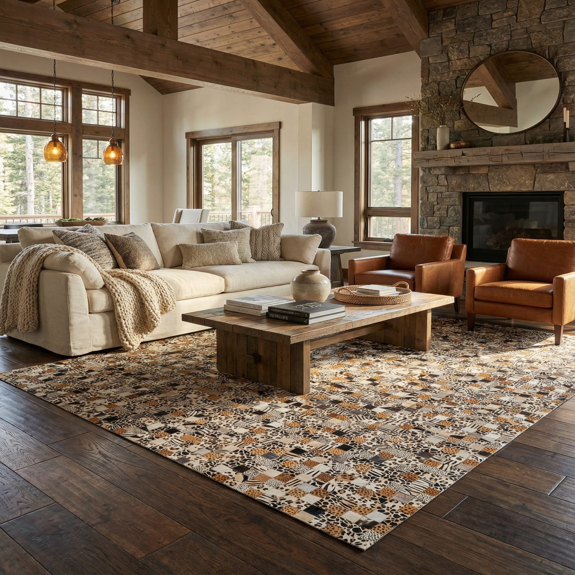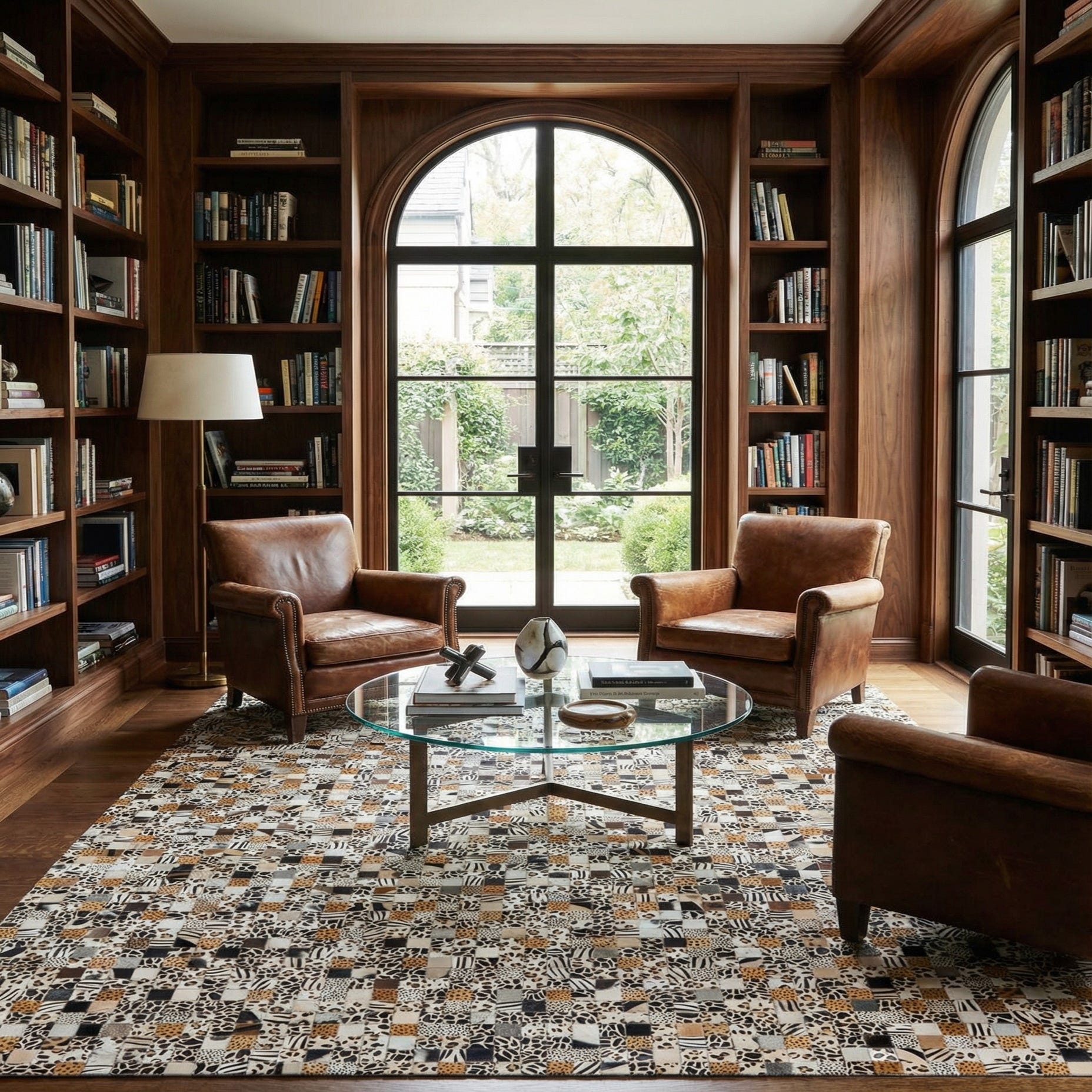 This piece fits well in a range of interiors—from contemporary and eclectic to modern farmhouse or transitional rooms—where pattern and texture are desired without overwhelming color. Use it to anchor a living area beneath a coffee table, layer it under a natural wood dining table to add interest, or place it in a home office to warm a neutral palette; it pairs especially well with leather seating, black metal accents and warm wood finishes.