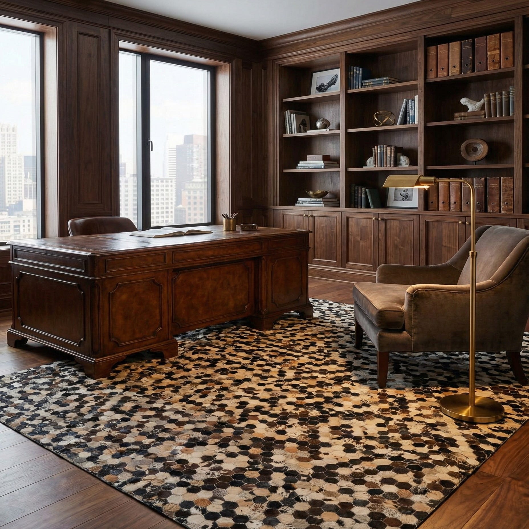 A rectangular 8x10 multi-colored modern rug made of cowhide and leather, featuring a mosaic of small hexagonal patches in various natural tones like white, black, brown, and beige.