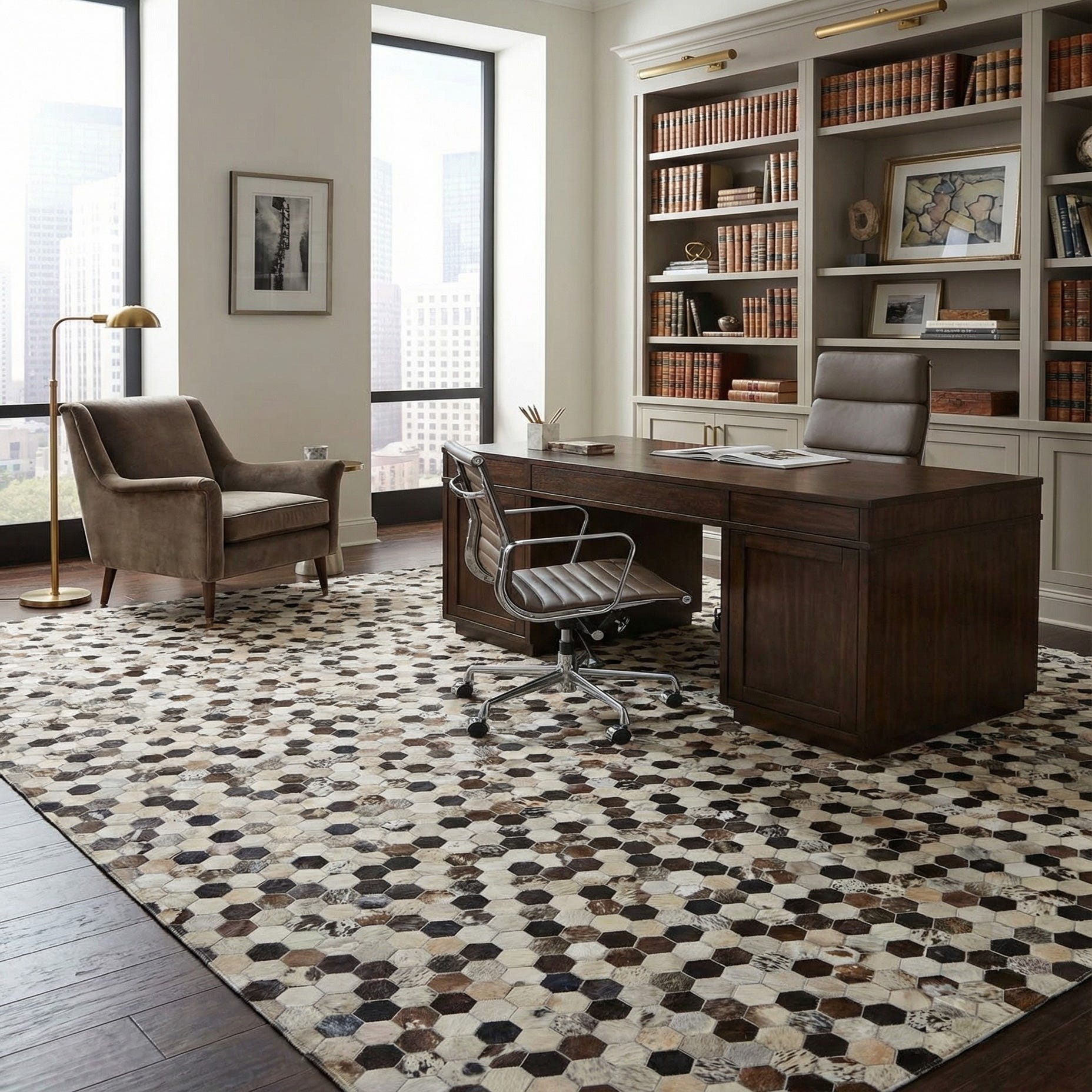 A rectangular 8x10 Cowhide Leather rug featuring a modern, abstract pattern of multi-colored hexagonal patches in shades of brown, black, and cream.