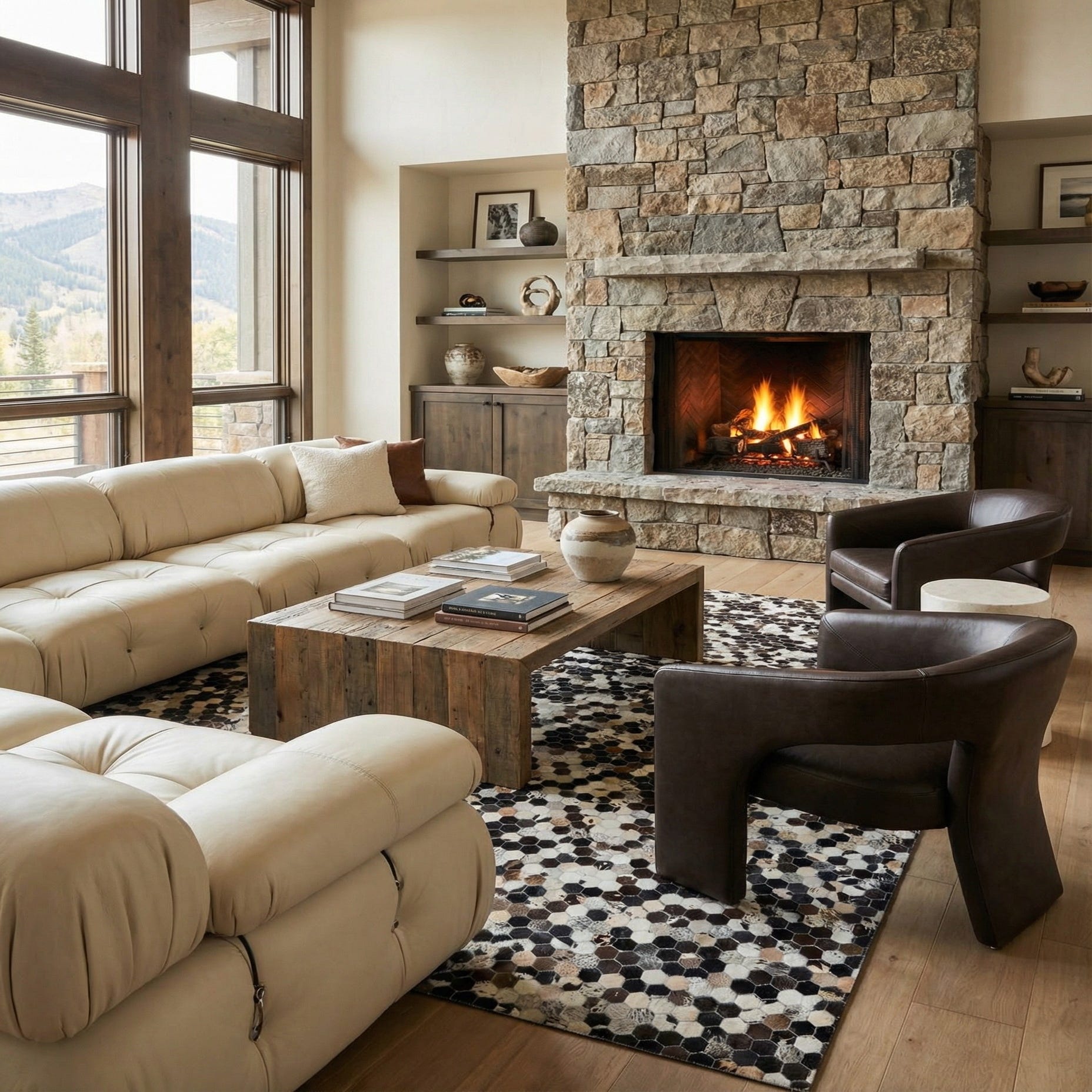The rug's surface varies subtly in texture, thanks to the inherent qualities of cowhide, providing a tactile experience that complements its visual appeal. Plush to the touch, each section of cowhide contributes to the overall luxurious feel of the rug.