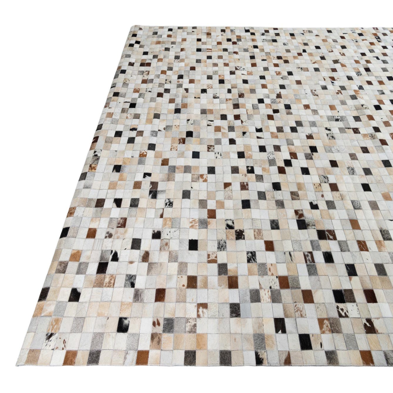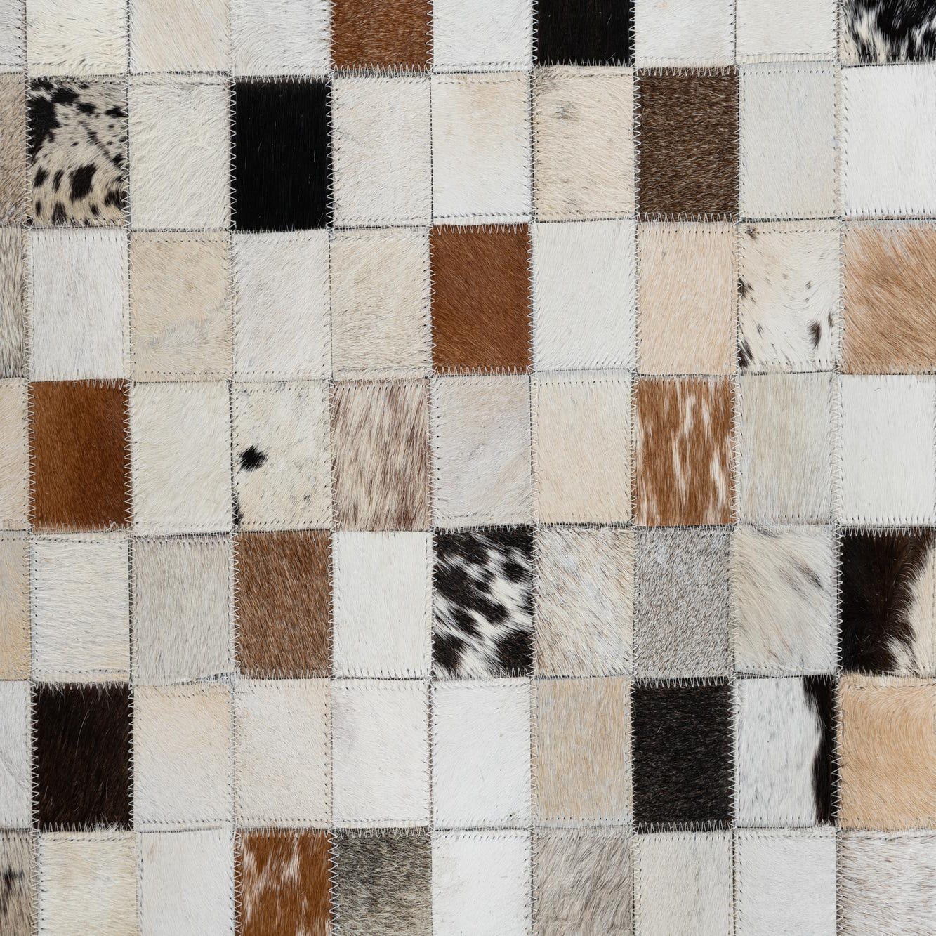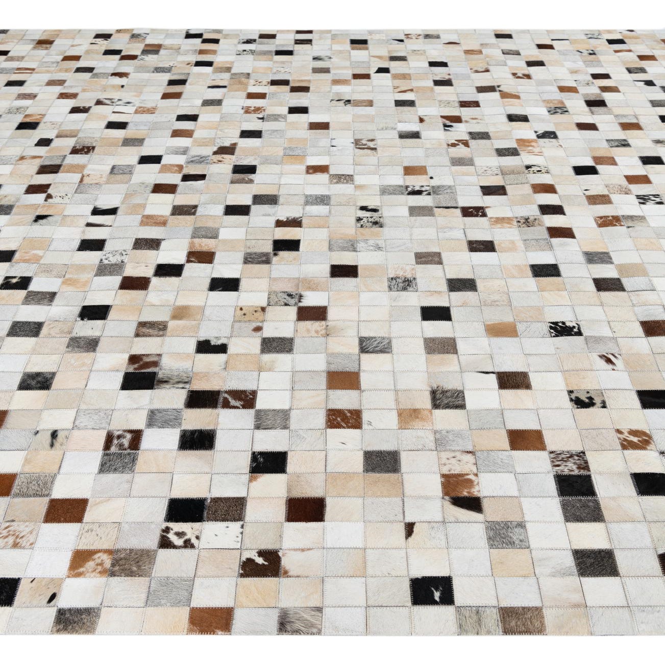 A rectangular 8x10 multi-colored modern cowhide and leather rug with a patchwork square pattern in various natural tones.
