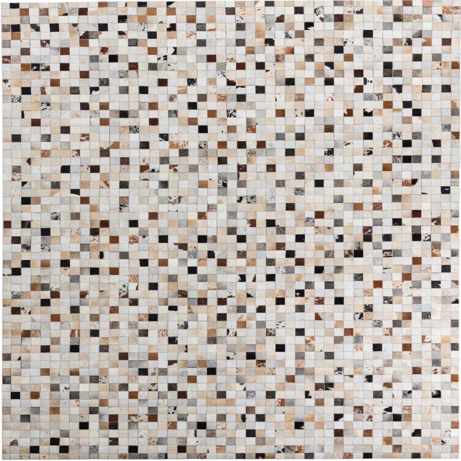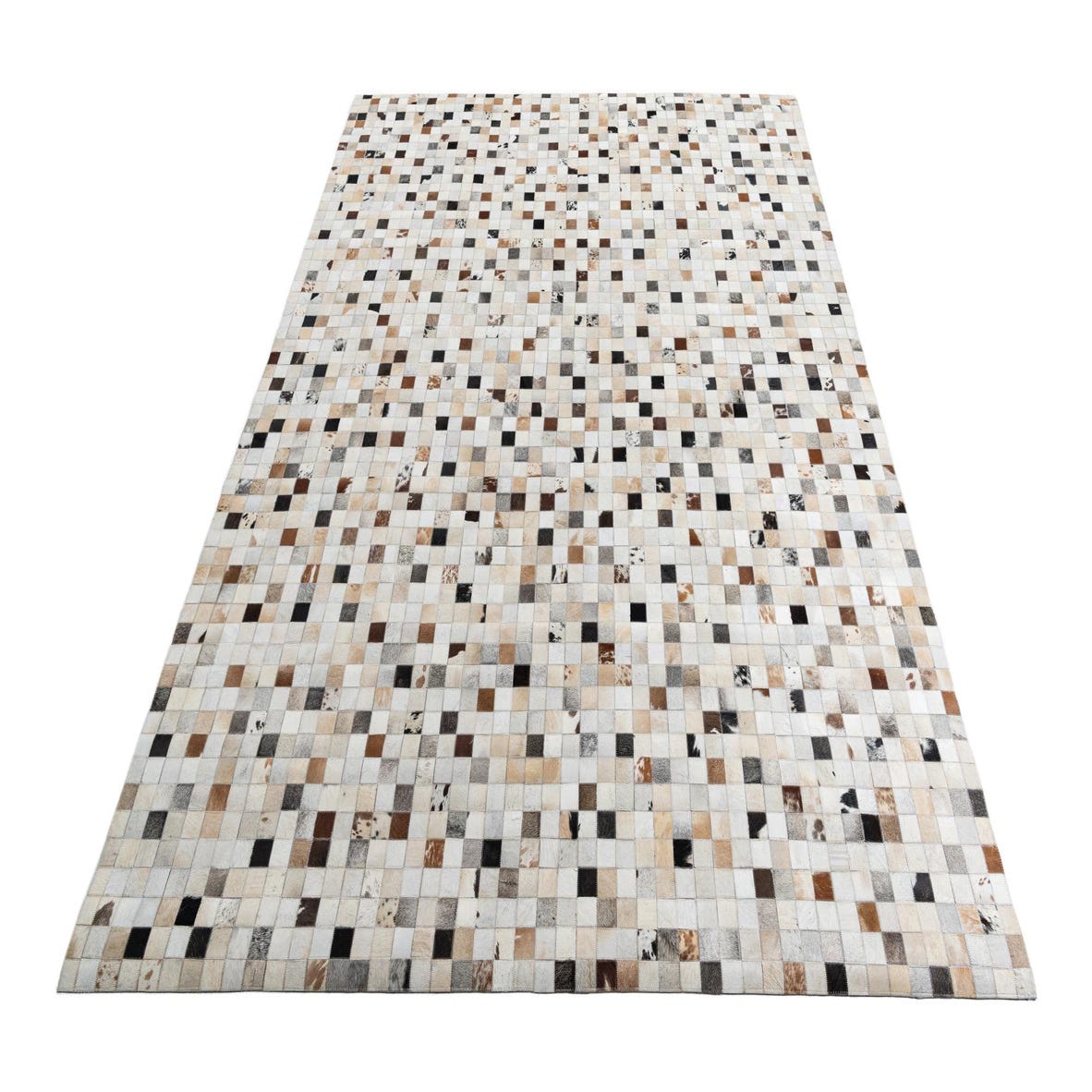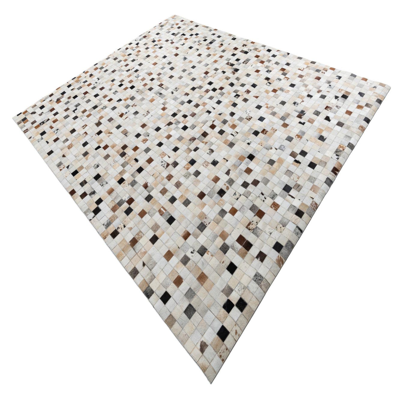 A rectangular 8x10 multi-colored modern cowhide and leather rug with a patchwork square pattern in various natural tones.