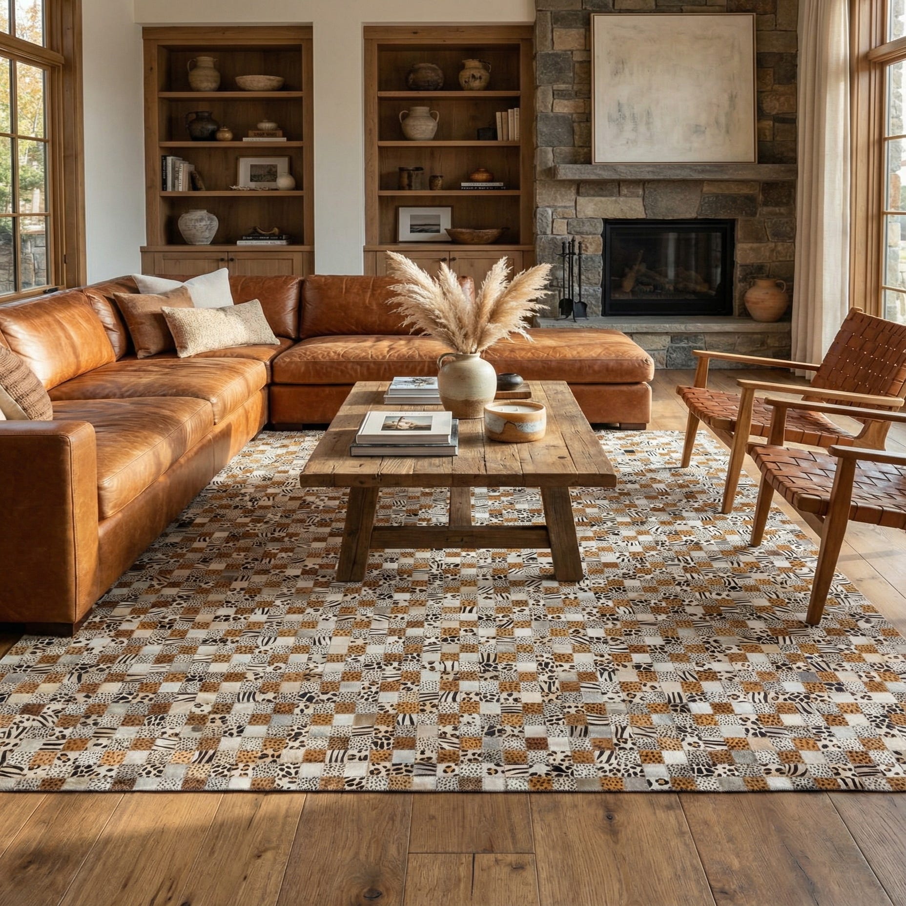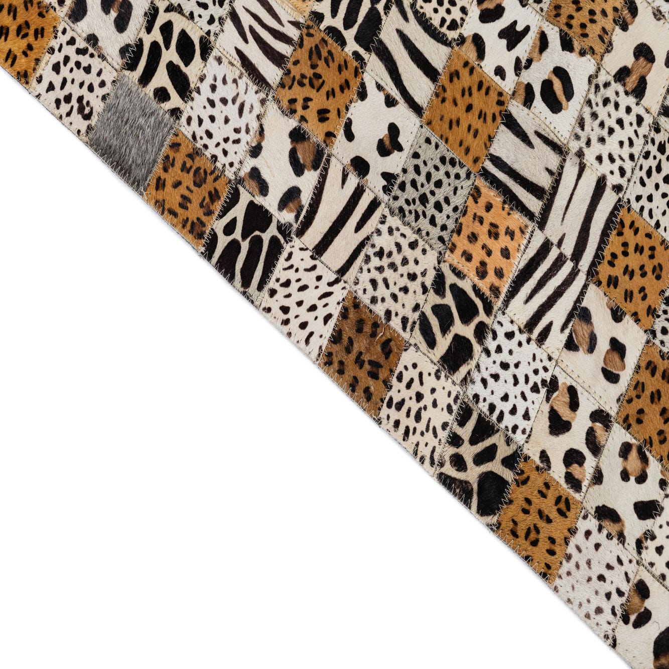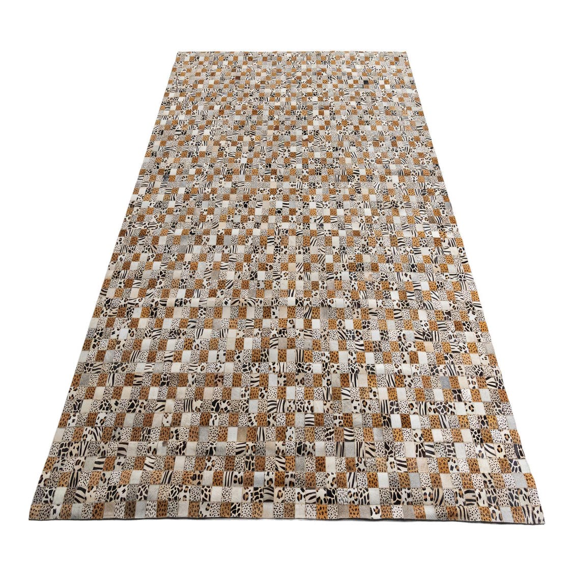 A rectangular 8x10 multi-colored modern cowhide rug with a woven checkerboard pattern of various animal prints, including leopard, cheetah, and zebra.