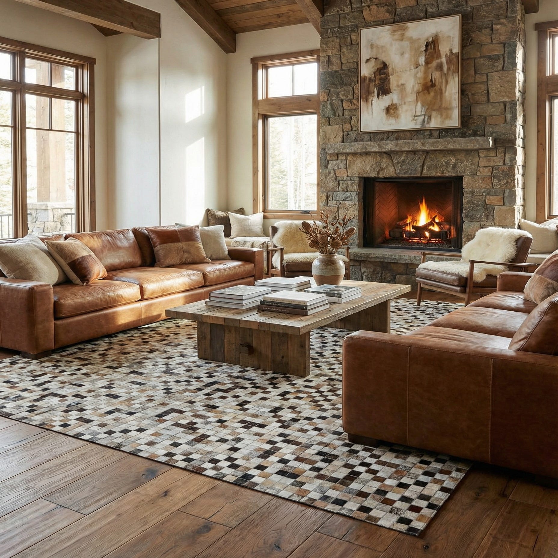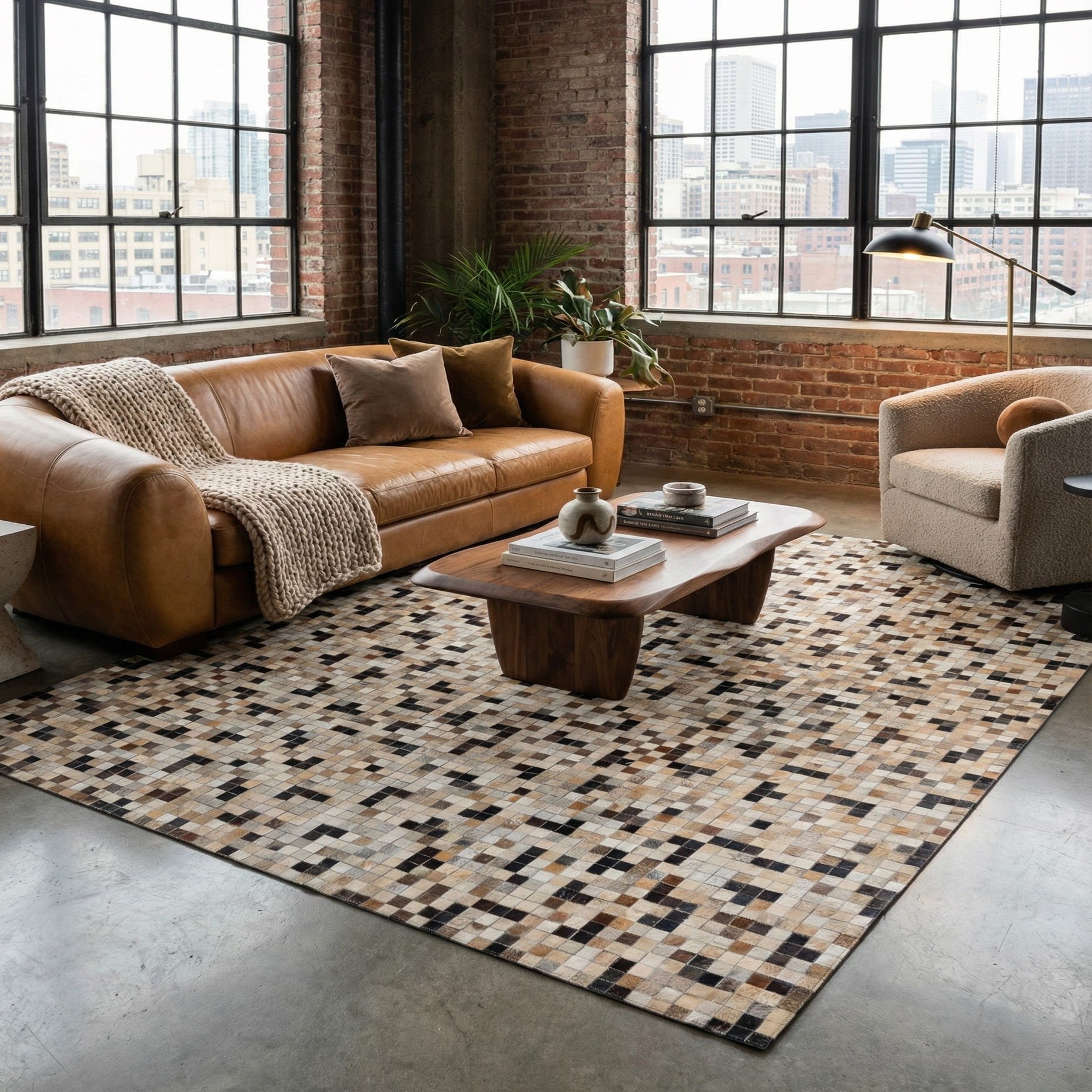 Given its natural color palette and high-quality materials, this Cowhide Leather rug is well-suited for interiors that lean towards rustic, southwestern, modern, or industrial styles. Its sophisticated yet understated pattern could serve as a statement piece in a minimalistic setting or blend harmoniously with more eclectic decor. This rug would be an ideal choice for placement in a living room, home office, or spacious loft where it would complement both furniture and fixtures in natural woods or metals.