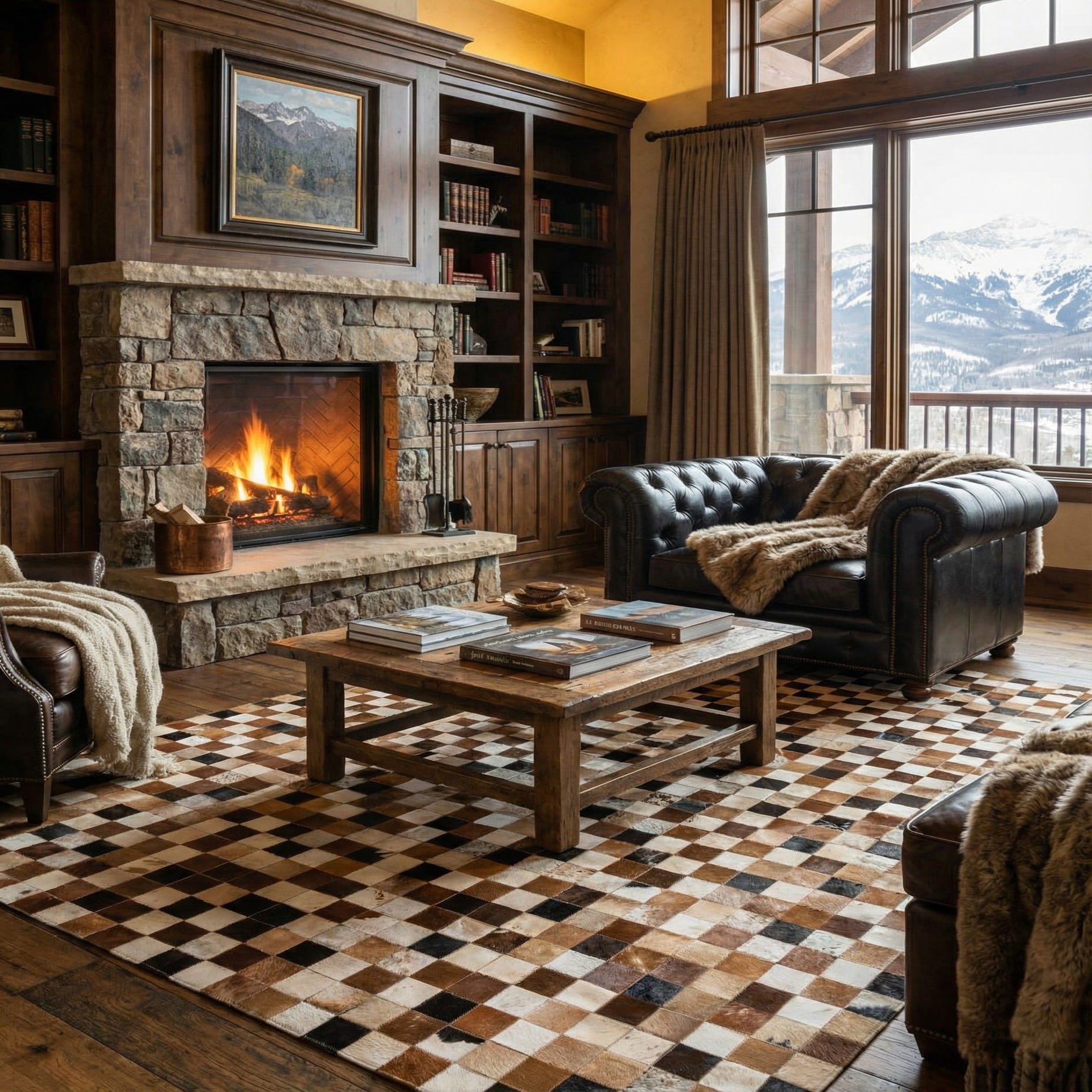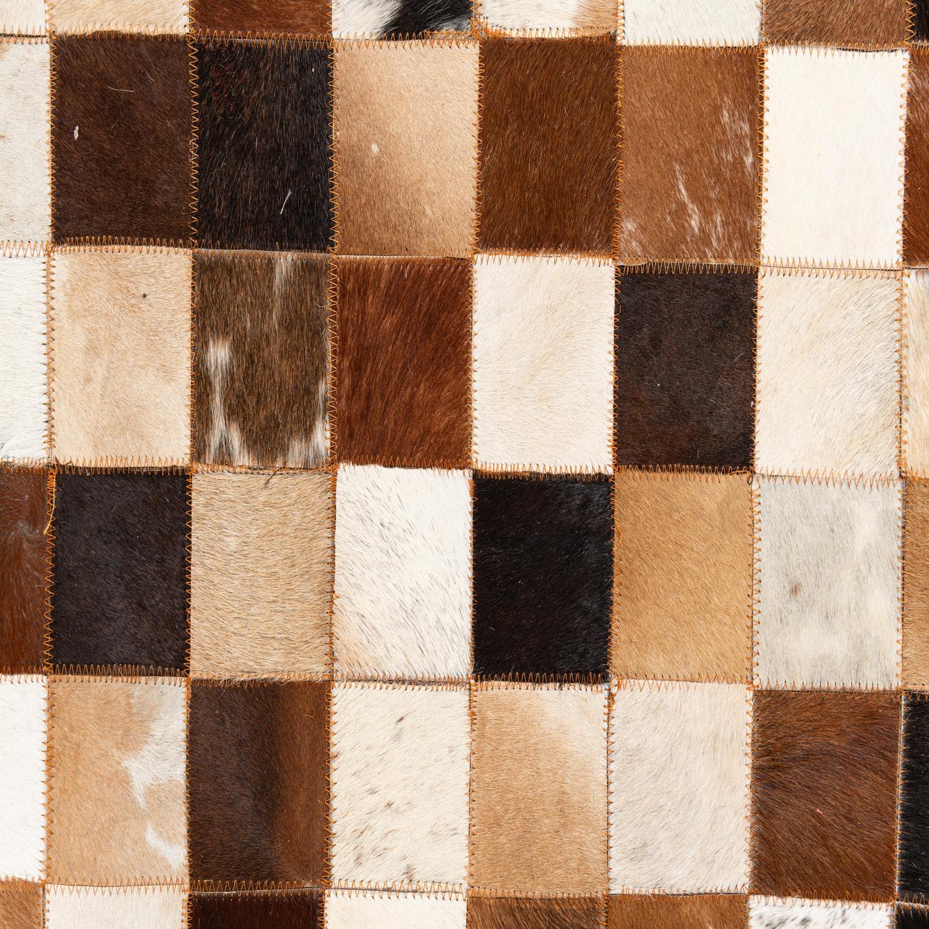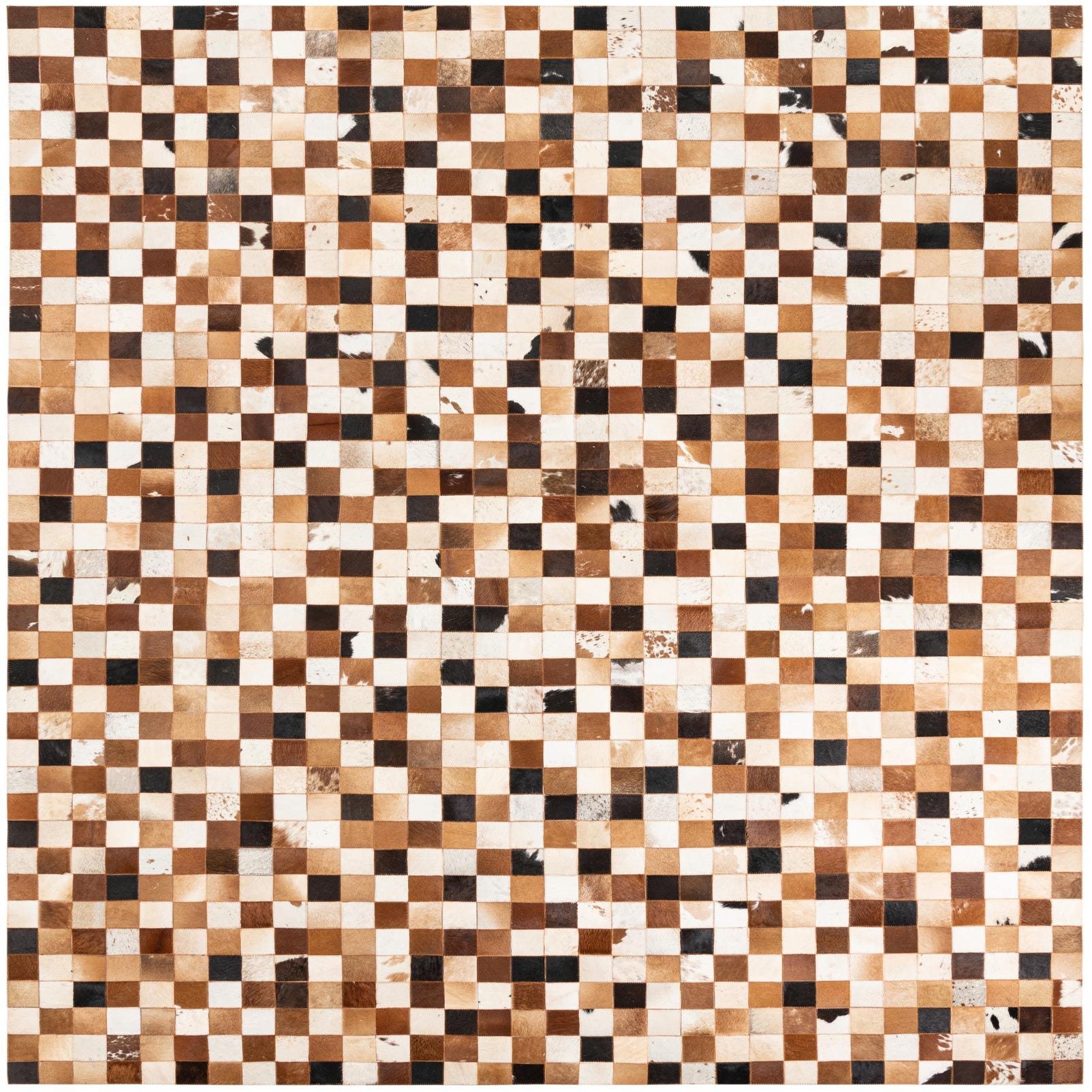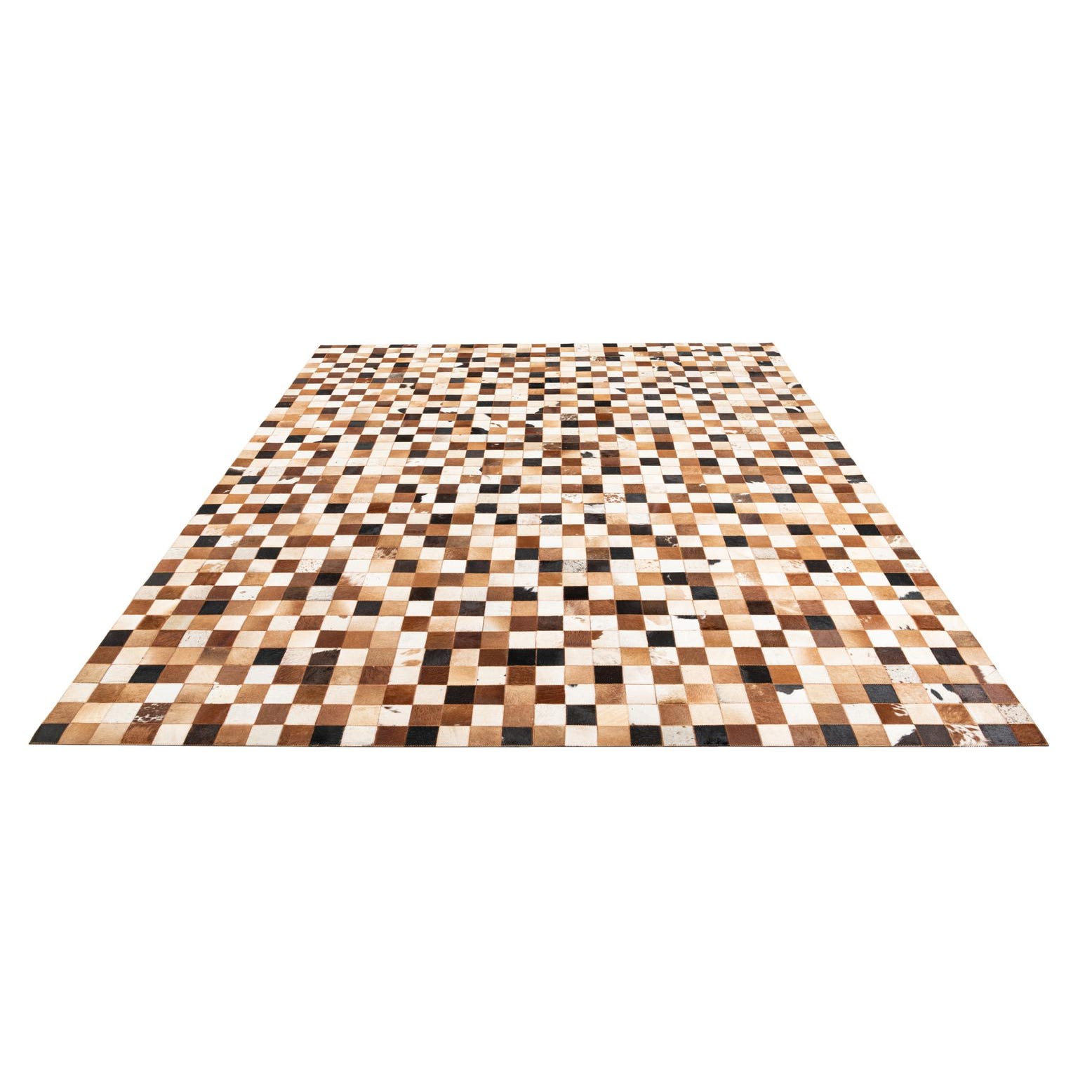 A rectangular 8x10 modern cowhide rug with a checkerboard pattern in various shades of brown, black, and white.