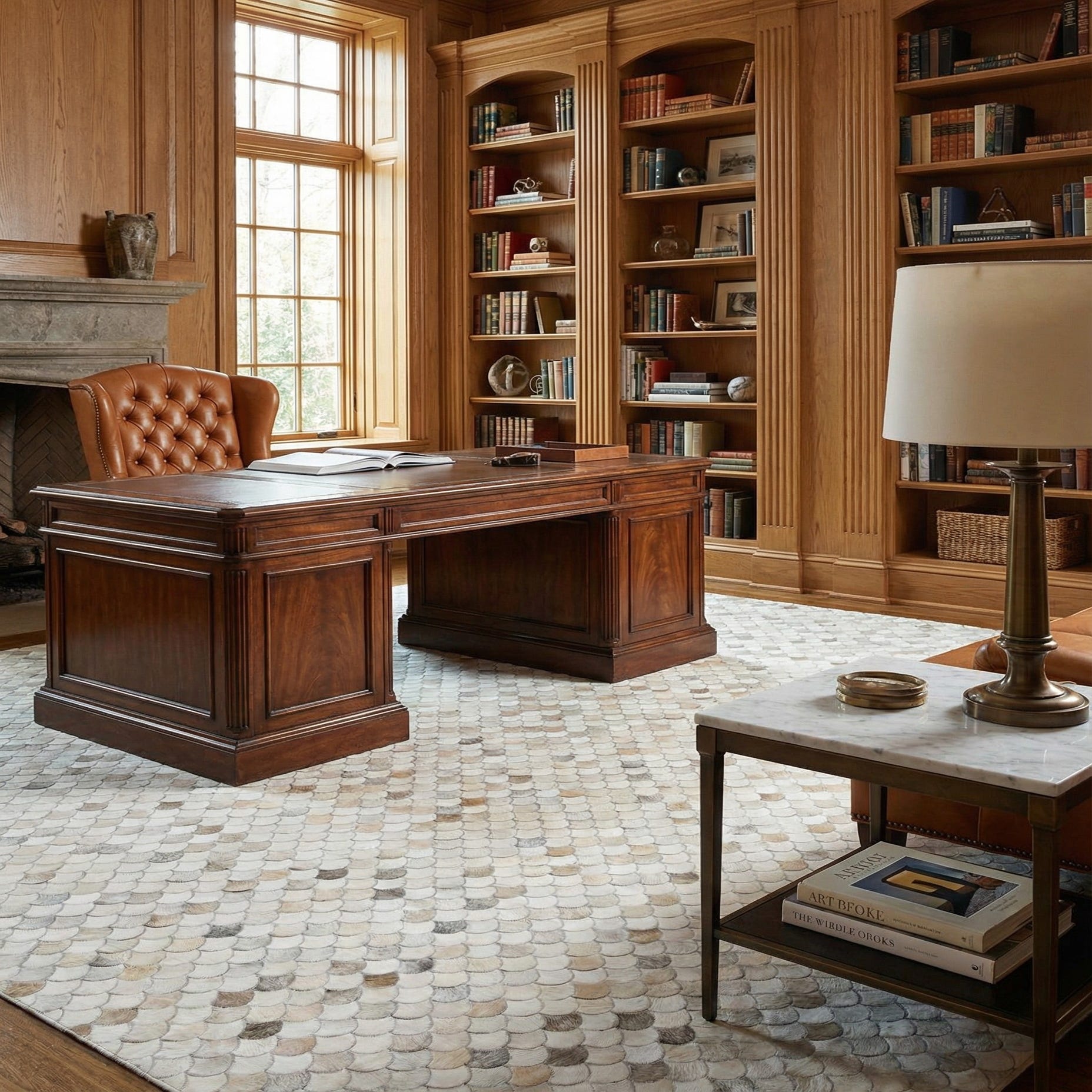 8x10 rectangular rug with a modern fish scale pattern in multi-colored cowhide and leather, ideal for a living room.