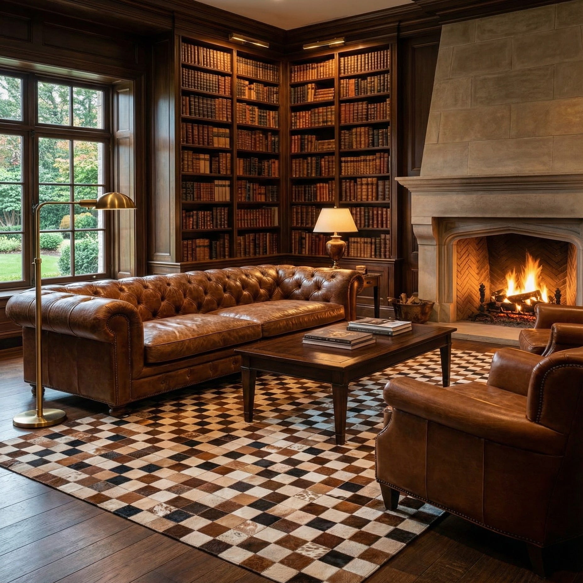 A rectangular 8x10 Cowhide Leather rug featuring a modern checkered pattern in multi-colored natural cowhide patches.